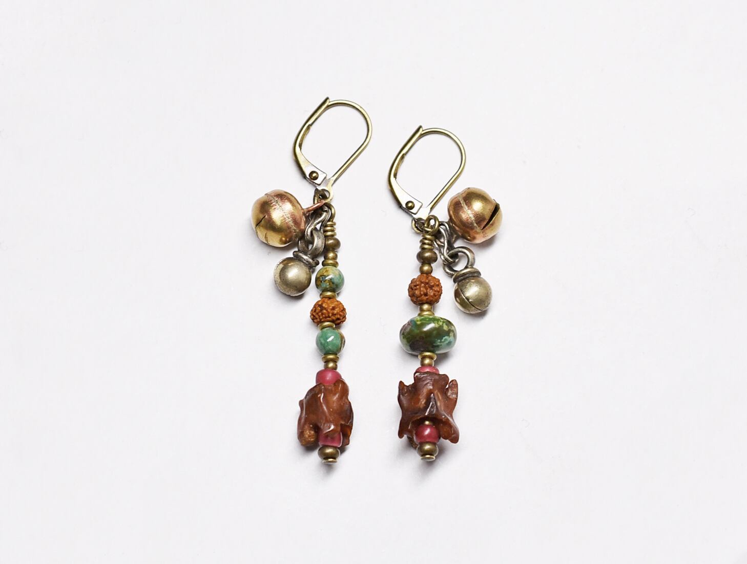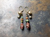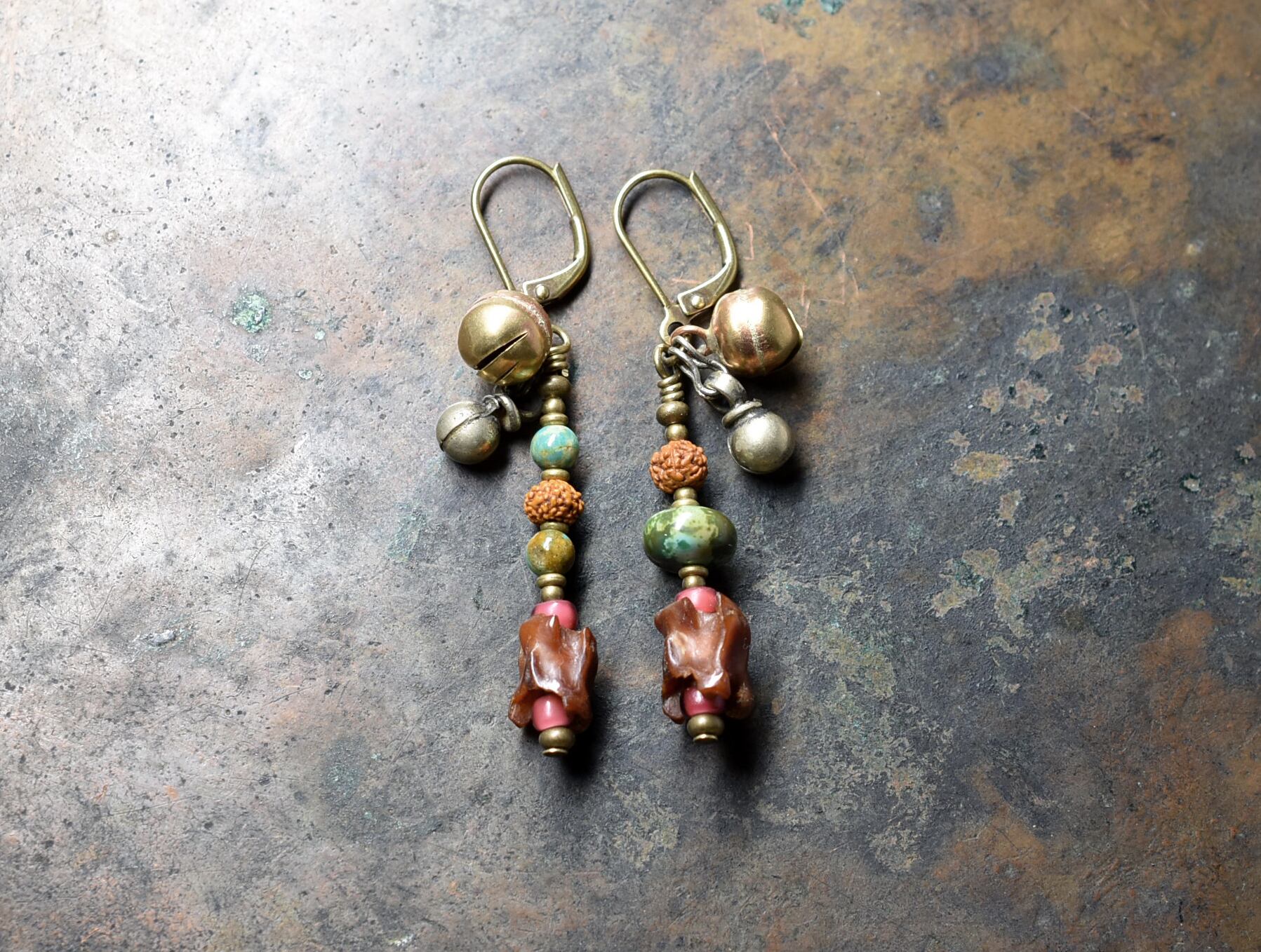蛇骨、金赤ホワイトハーツ、ターコイズ、2種類の鈴を繋いだピアスです。