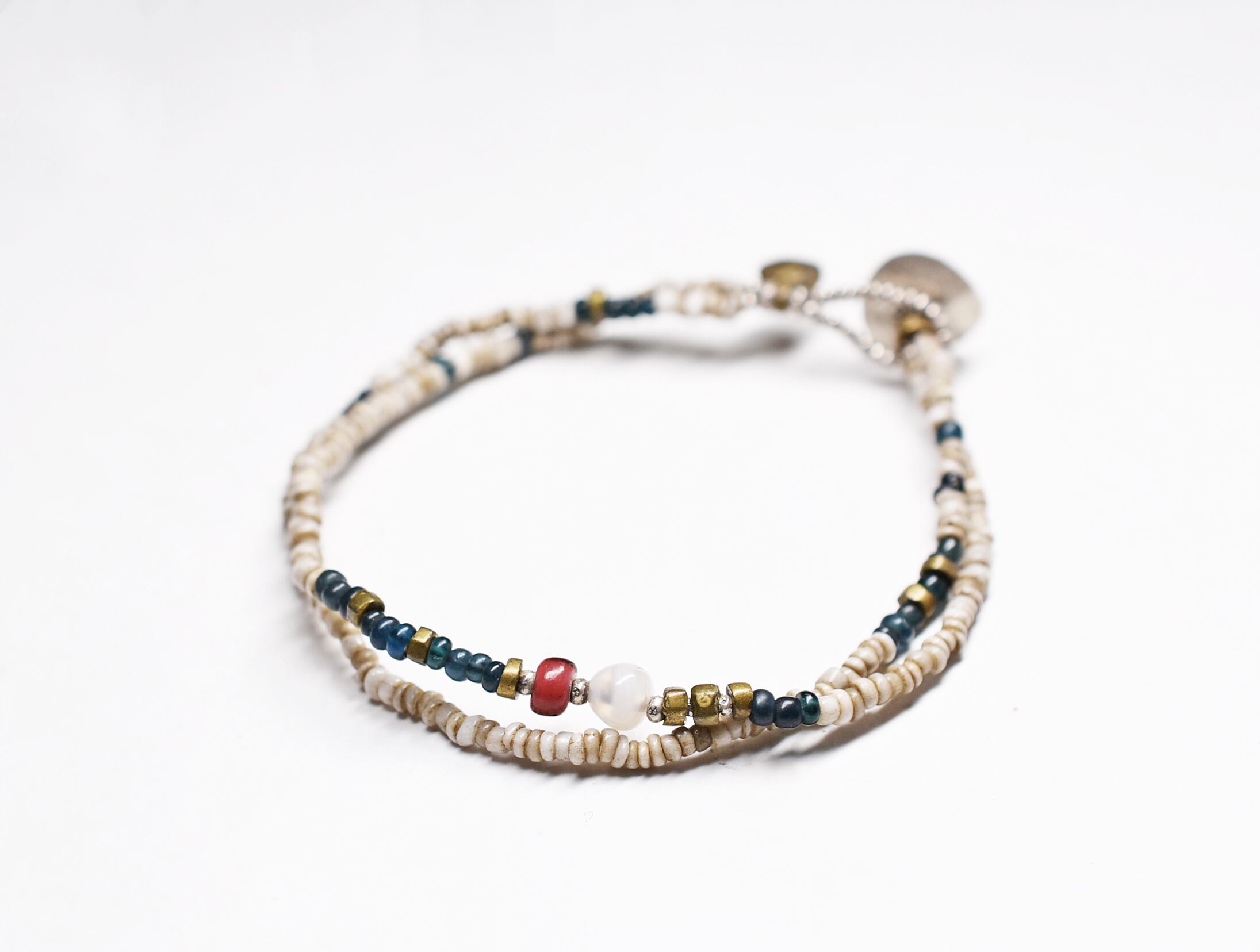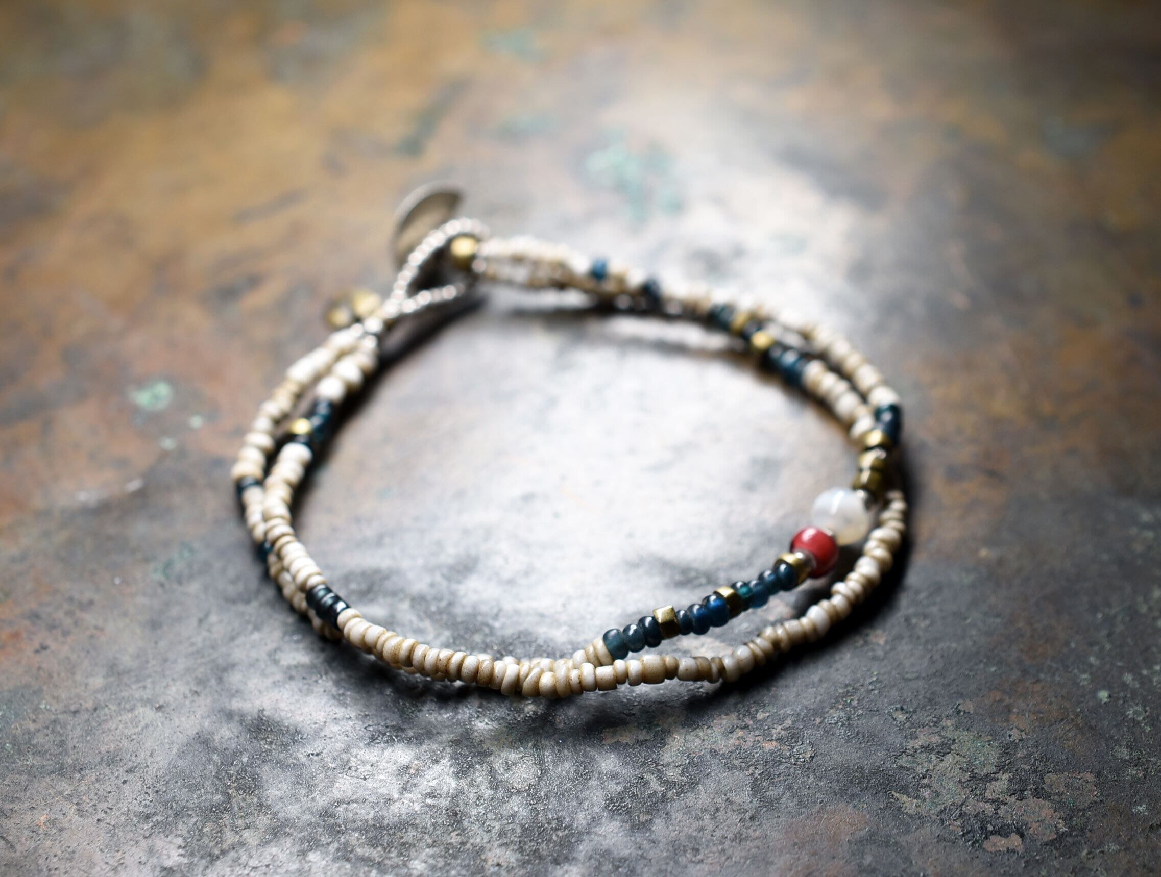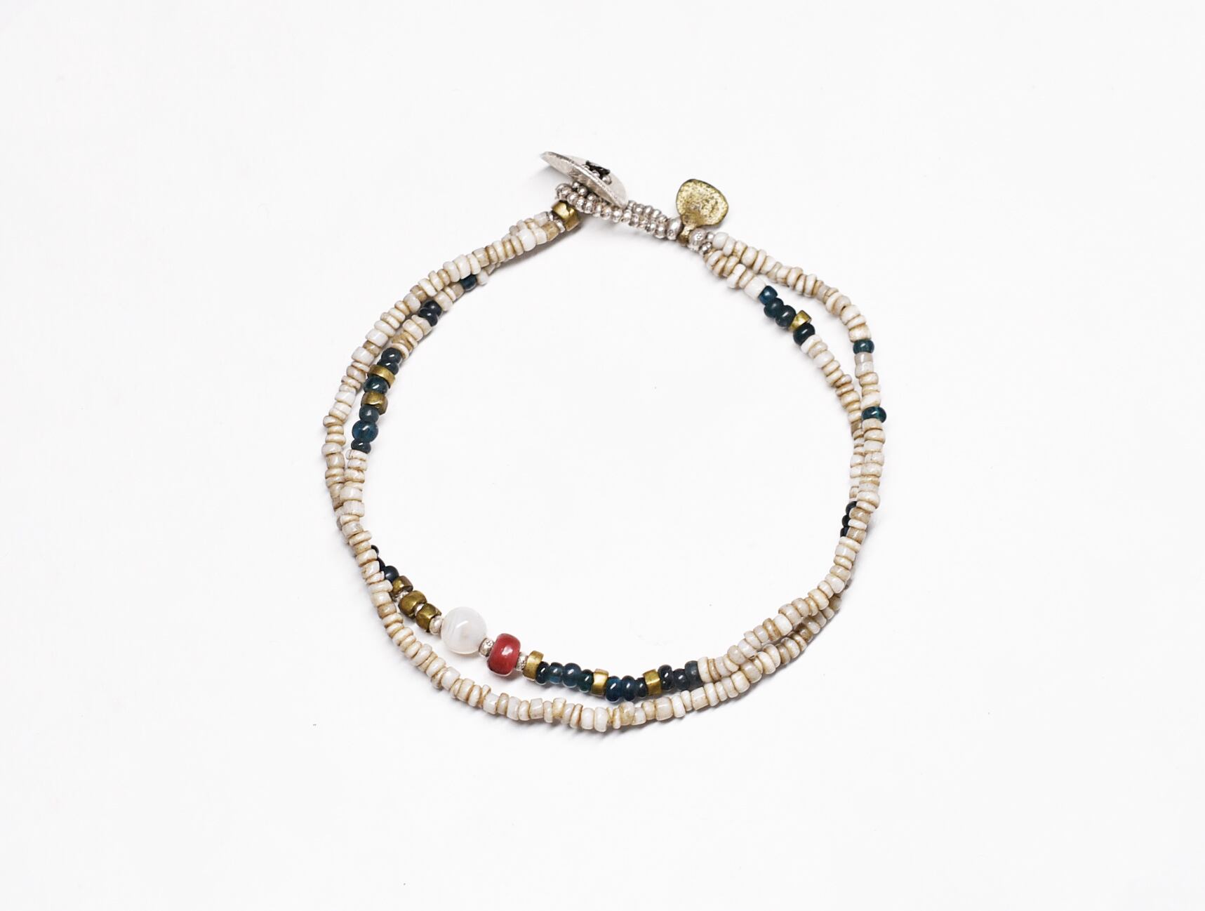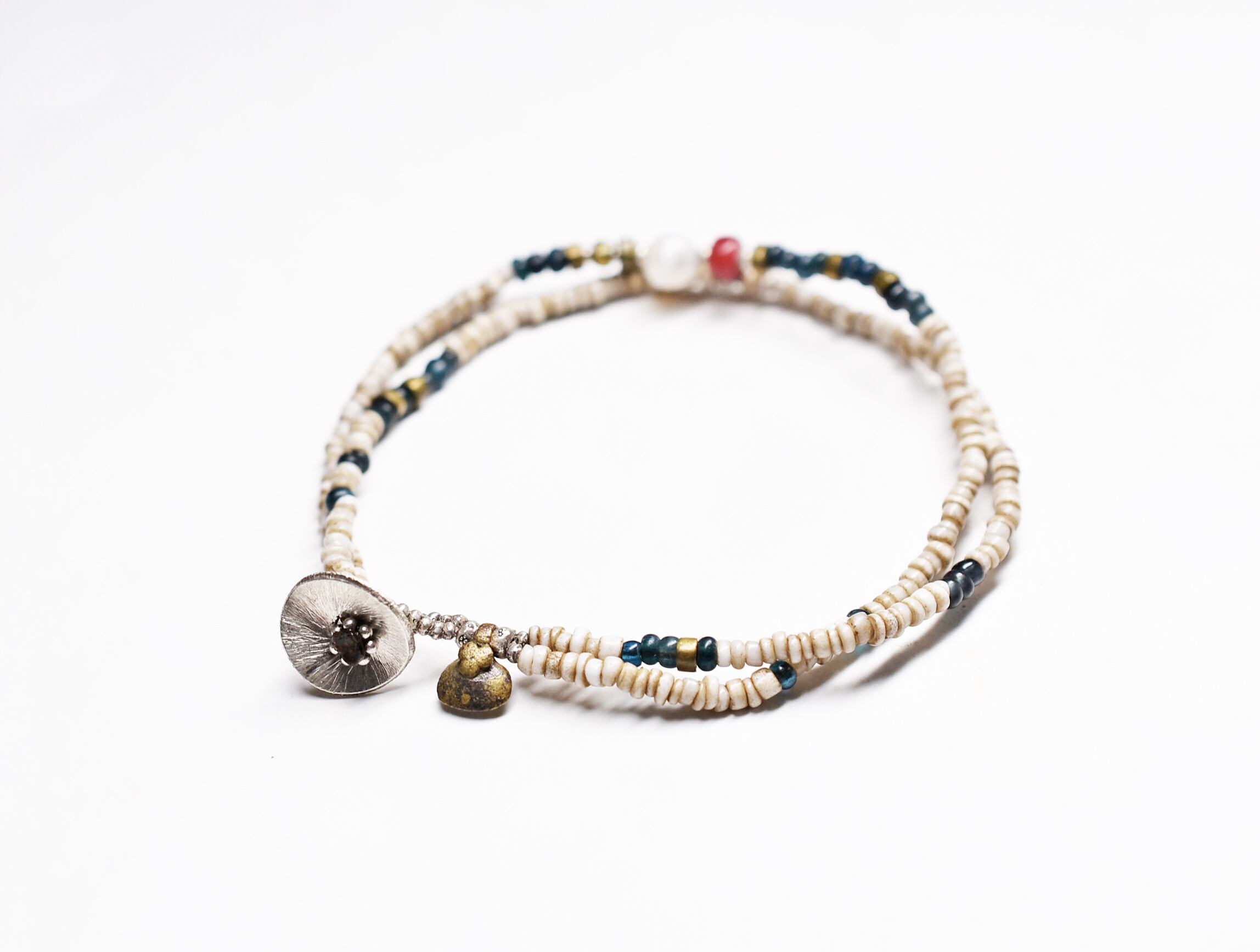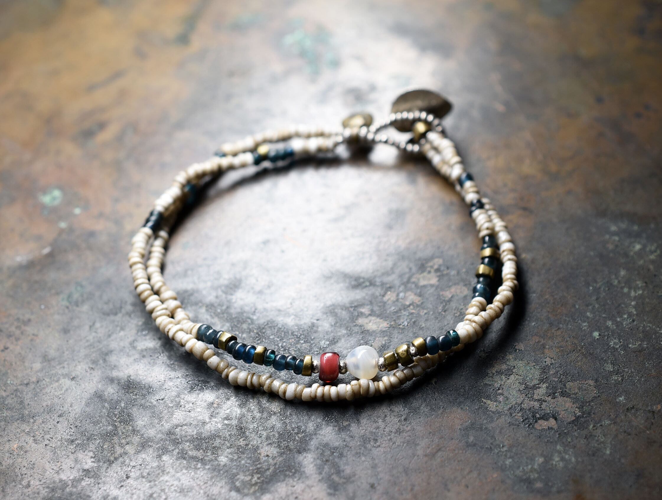 古代瑪瑙と、金赤ホワイトハーツをインディゴブルーとホワイトのアンティークビーズ、oldオリッサブラスなどを繋げた華奢な2連のブレスです。
