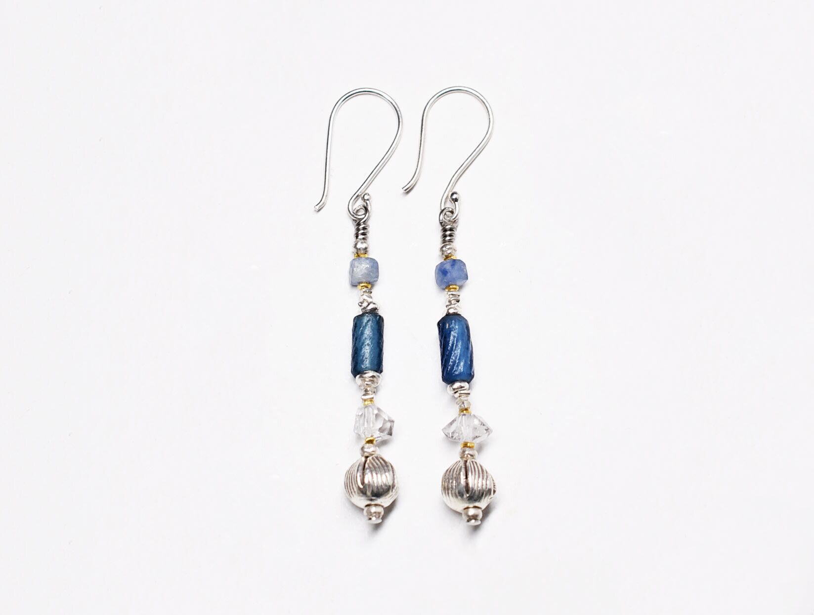 ローマングラスとハーキマーダイヤモンド、カイヤナイト、カレンシルバーを繋いだピアスです。