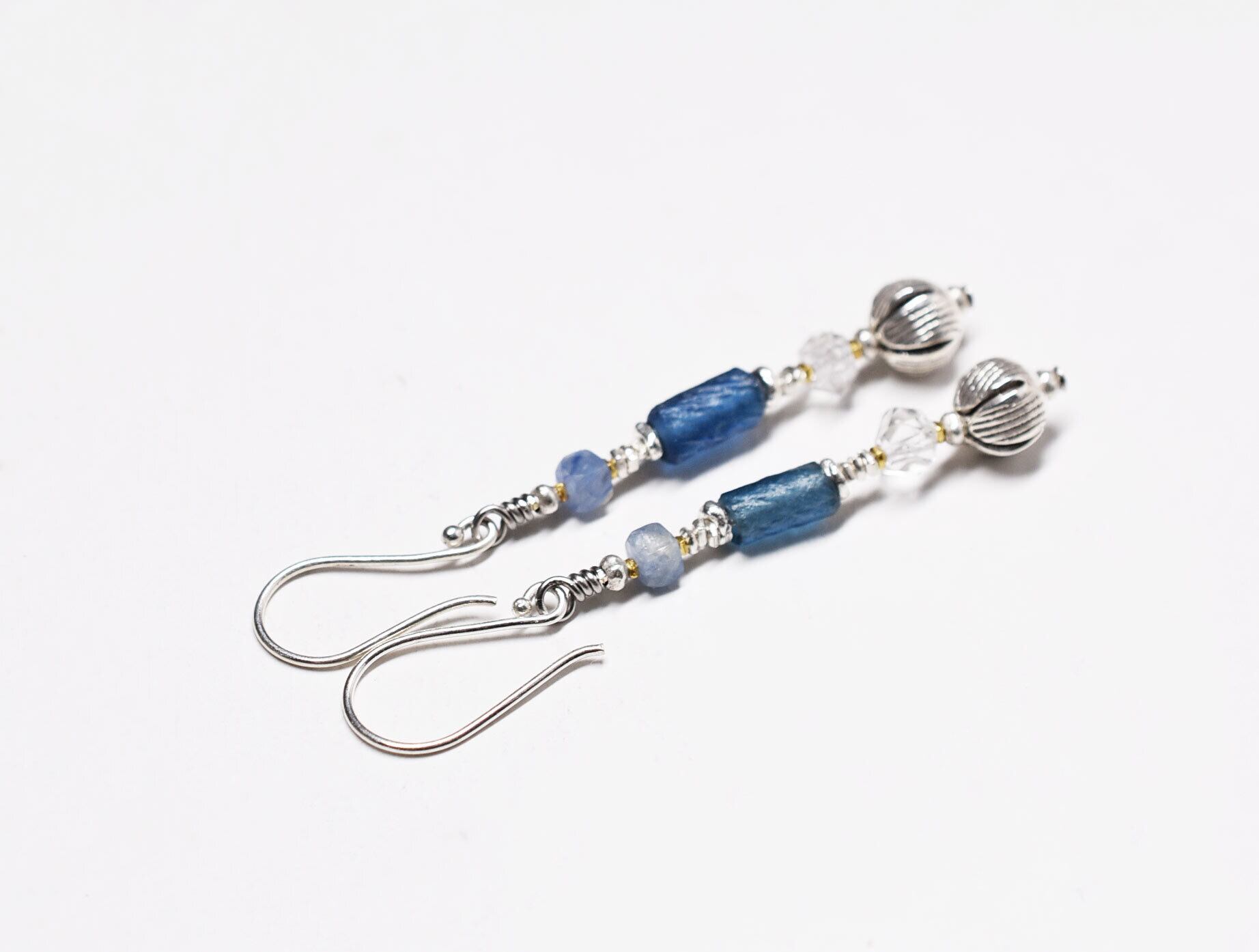 スクエア型のビーズはカイヤナイトです。細かな多面体カットが施されており、線状の結晶がキラキラと輝きます。