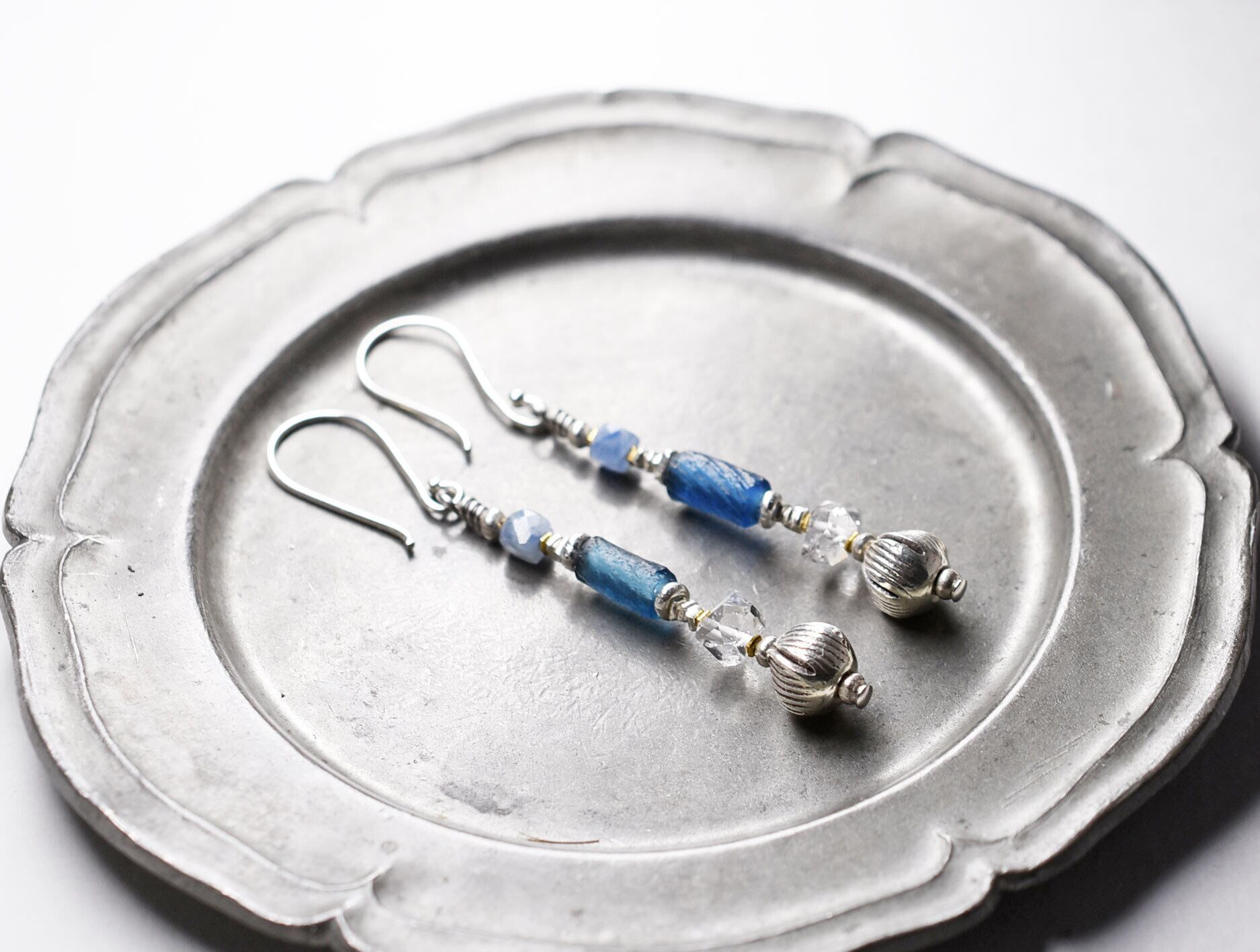 ローマングラスとハーキマーダイヤモンド、カイヤナイト、蕾カレンシルバーのピアス