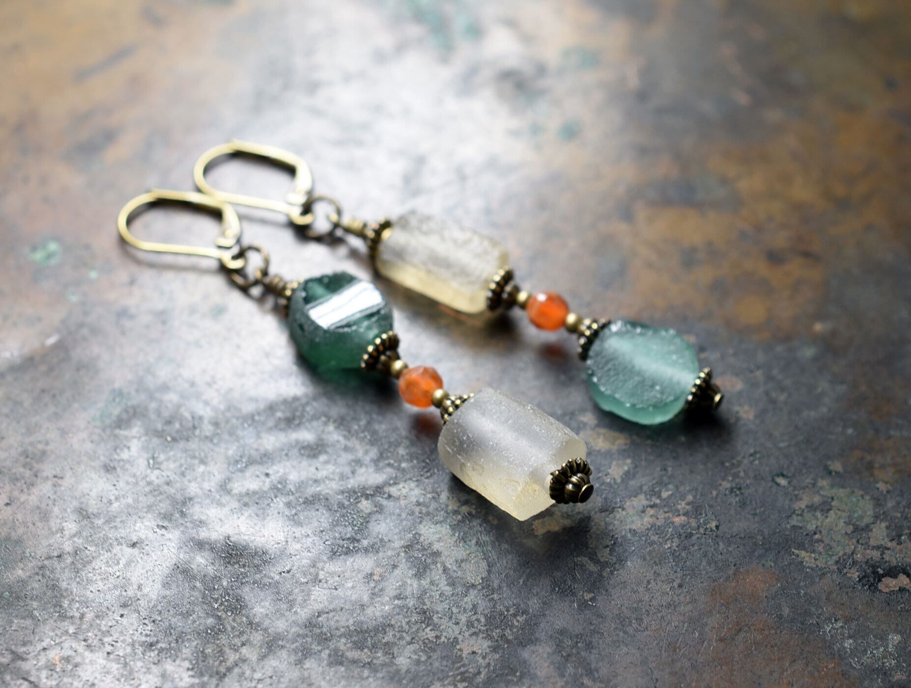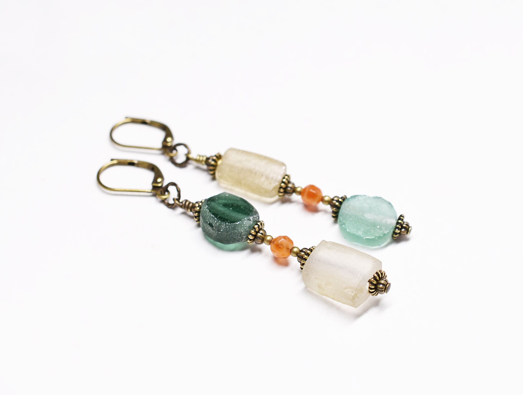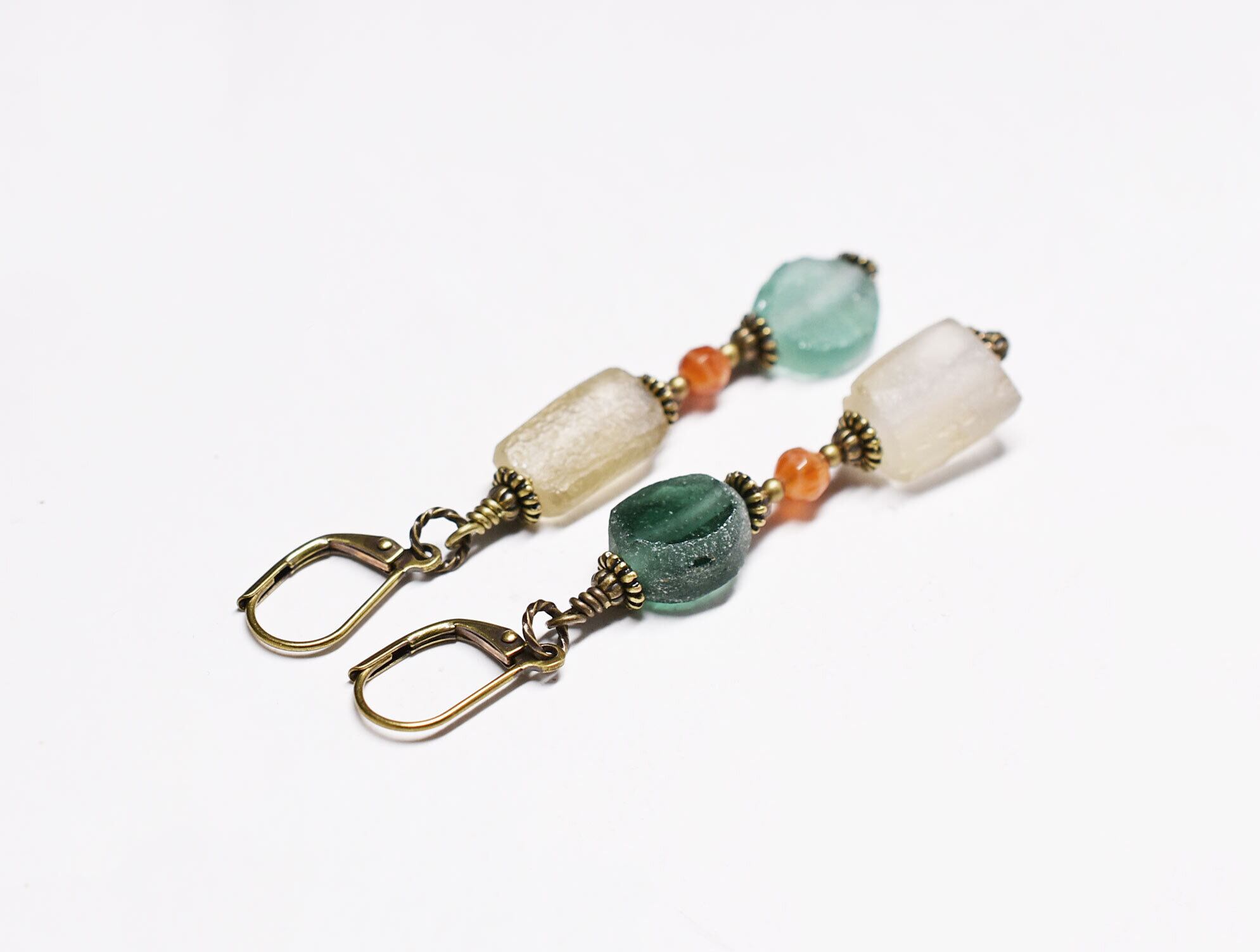 ローマングラスを2粒づつとファイアーアゲートを繋いだピアスです。