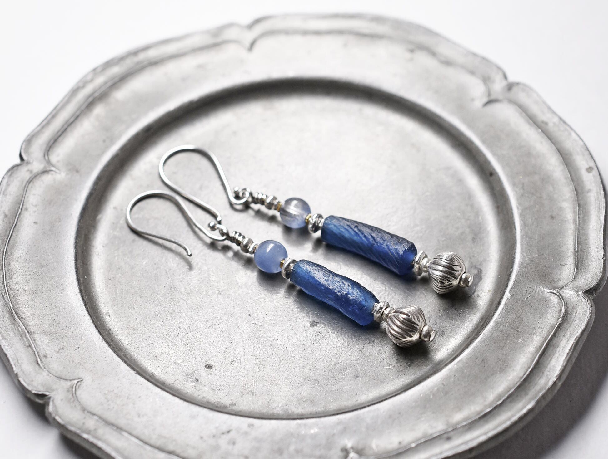 ローマングラスとデュモルチェライトインクォーツ、カレンシルバーを繋いだピアスです。
