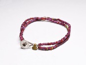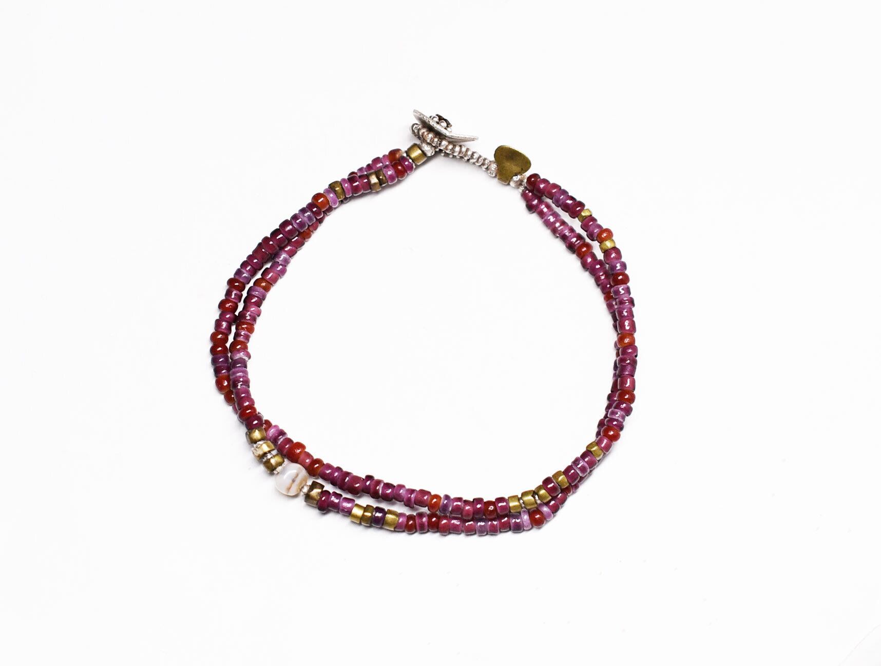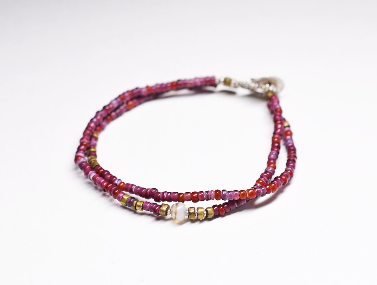 濃淡のある紫色や赤色のビーズはホワイトハーツと呼ばれるアンティークビーズです。