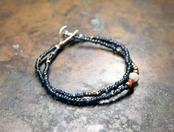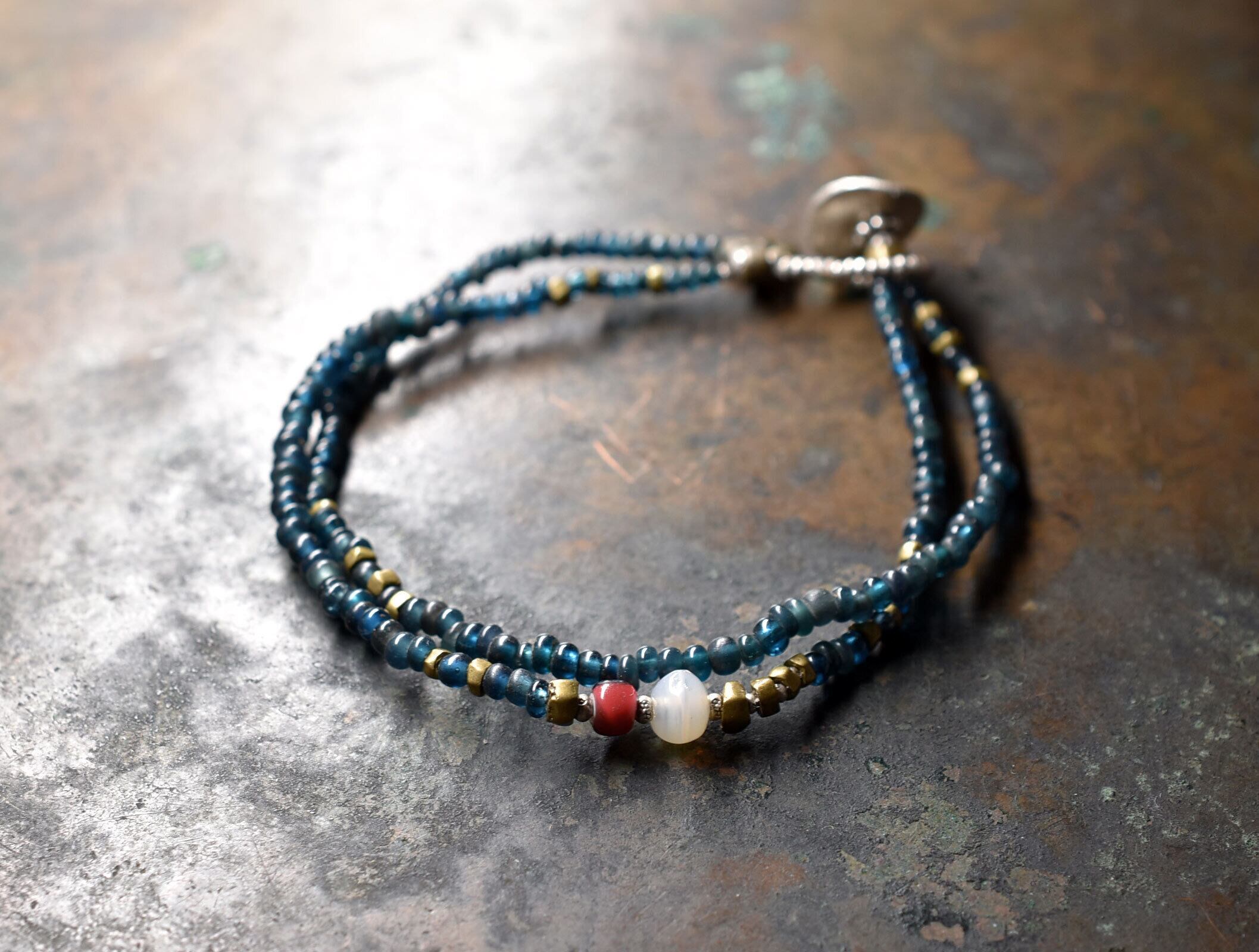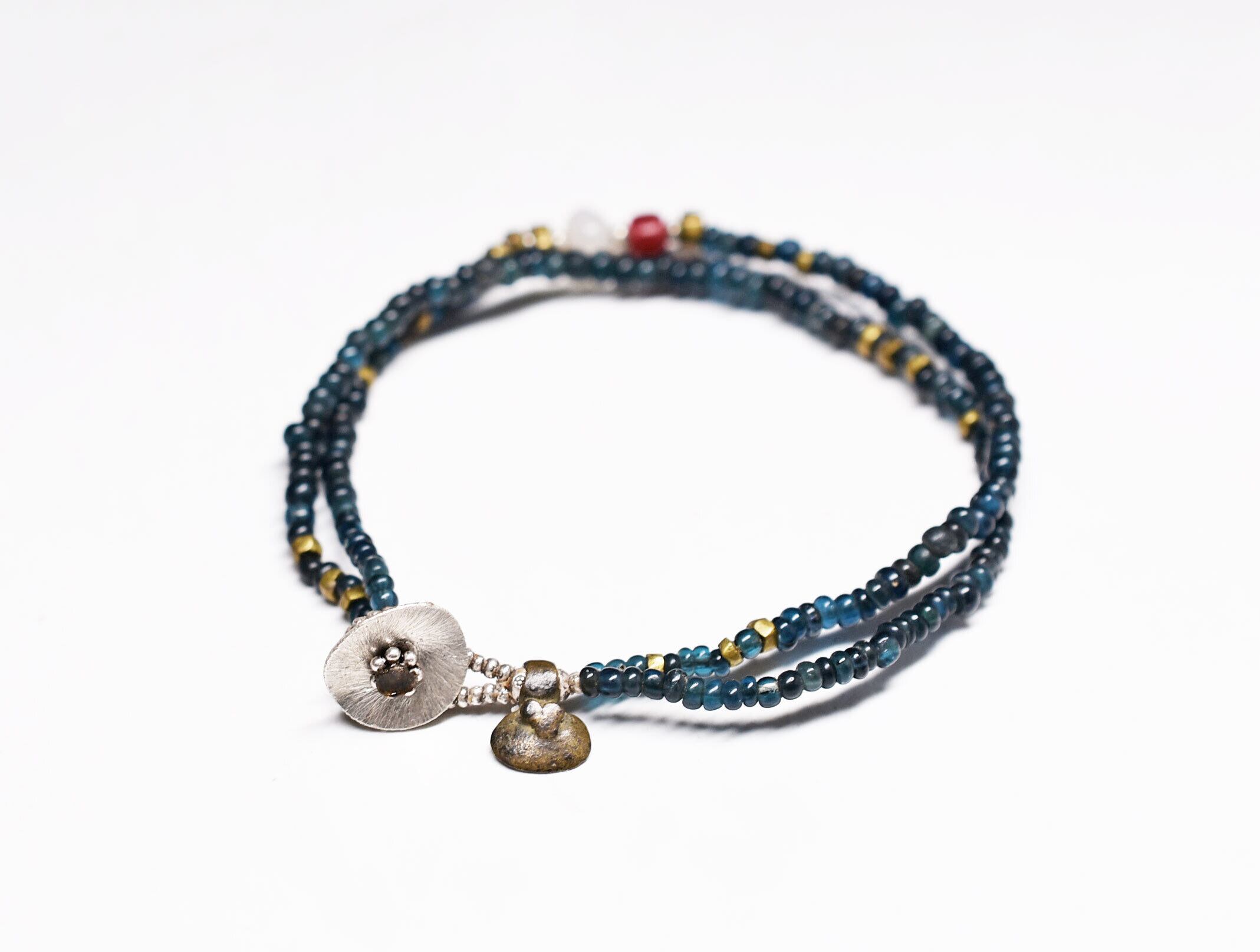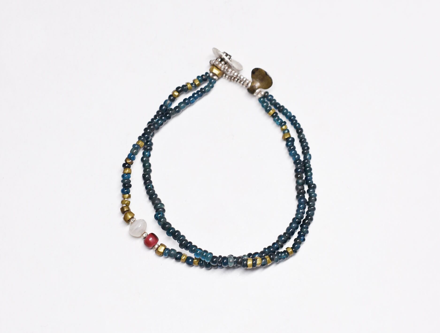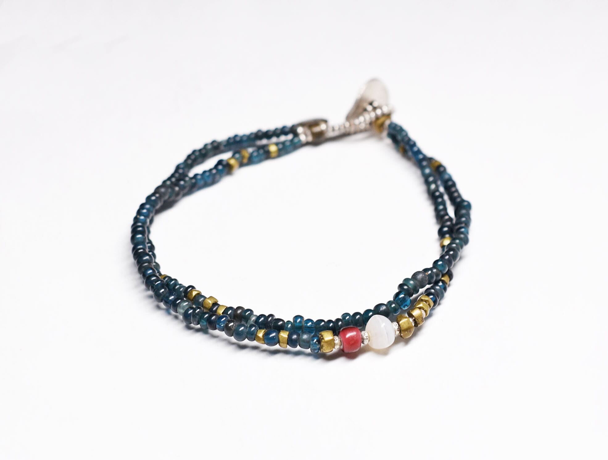 古代瑪瑙、金赤ホワイトハーツ、インディゴブルーのアンティークビーズ、oldオリッサブラスなどで繋いだ2連のブレスです。