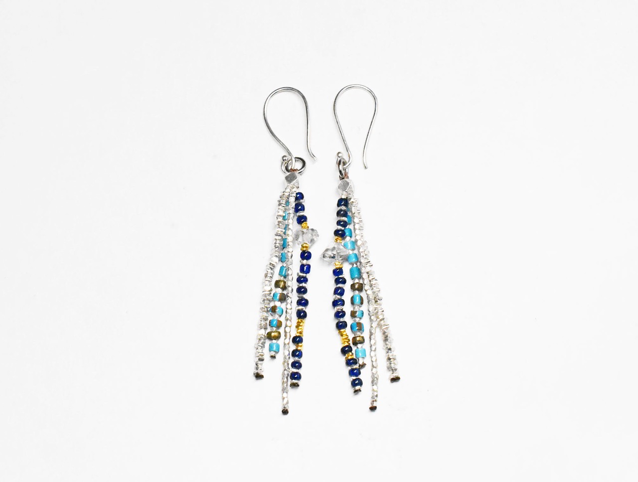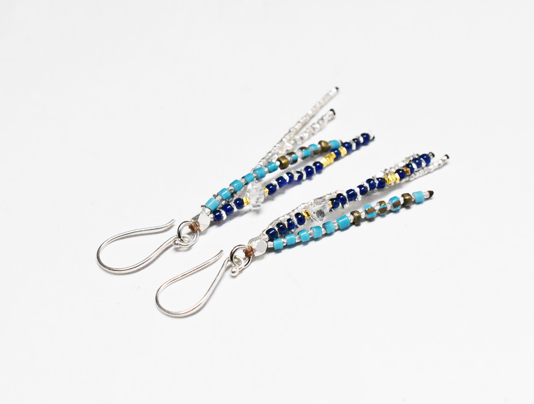 ハーキマーダイヤモンドとターコイズブルーホワイトハーツ、瑠璃色ビーズ、カレンシルバーの4連ピアス