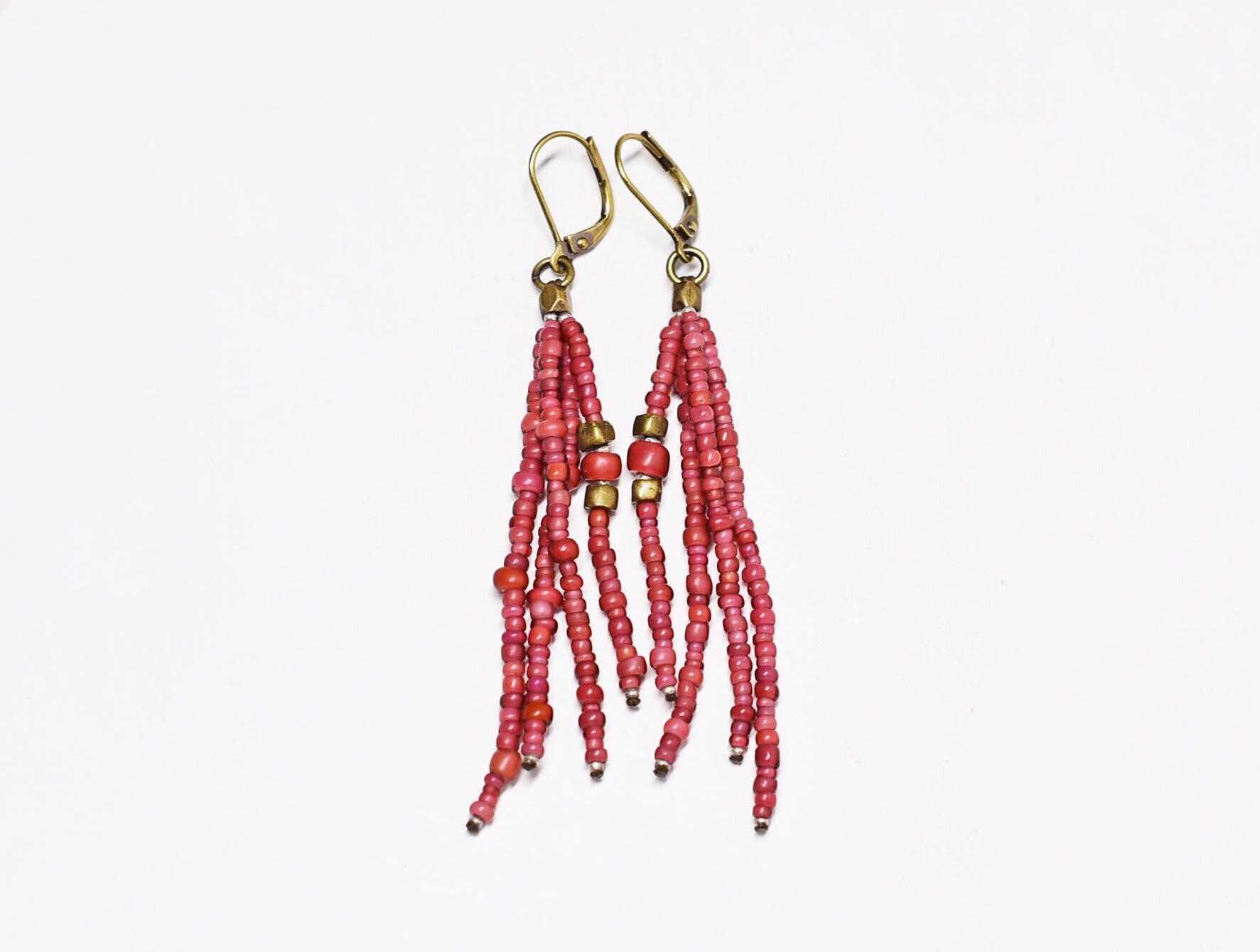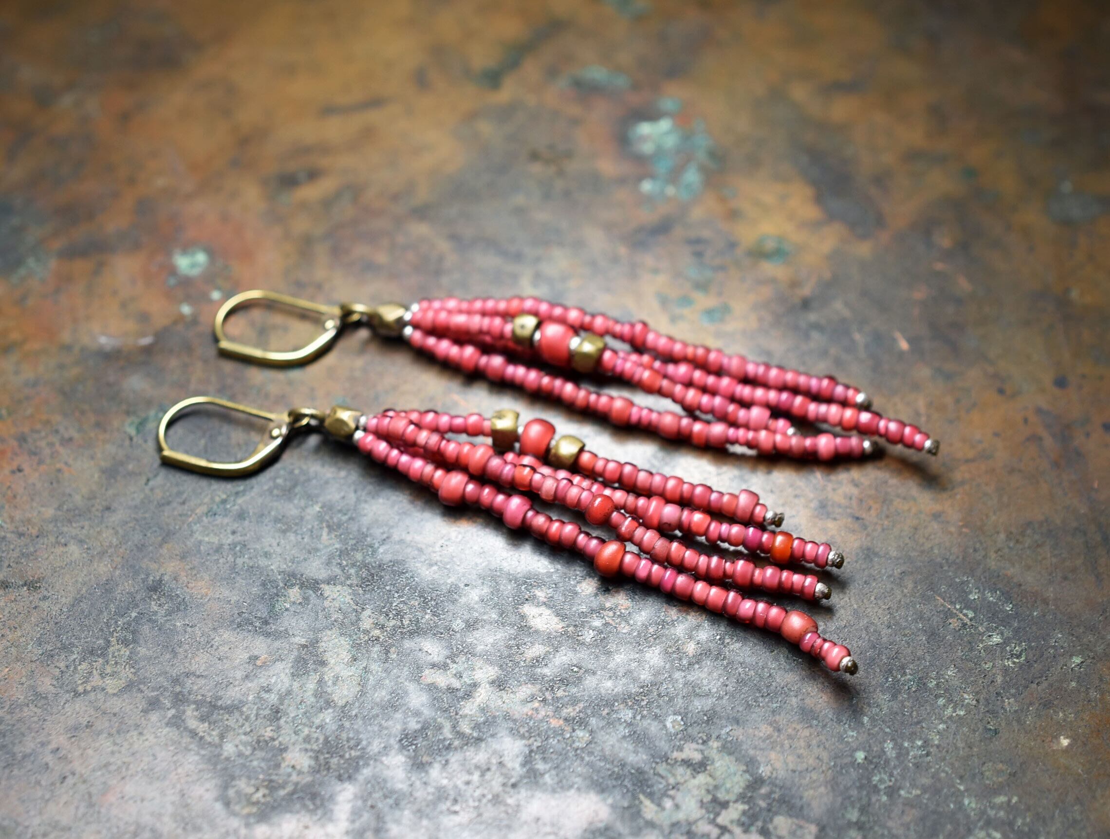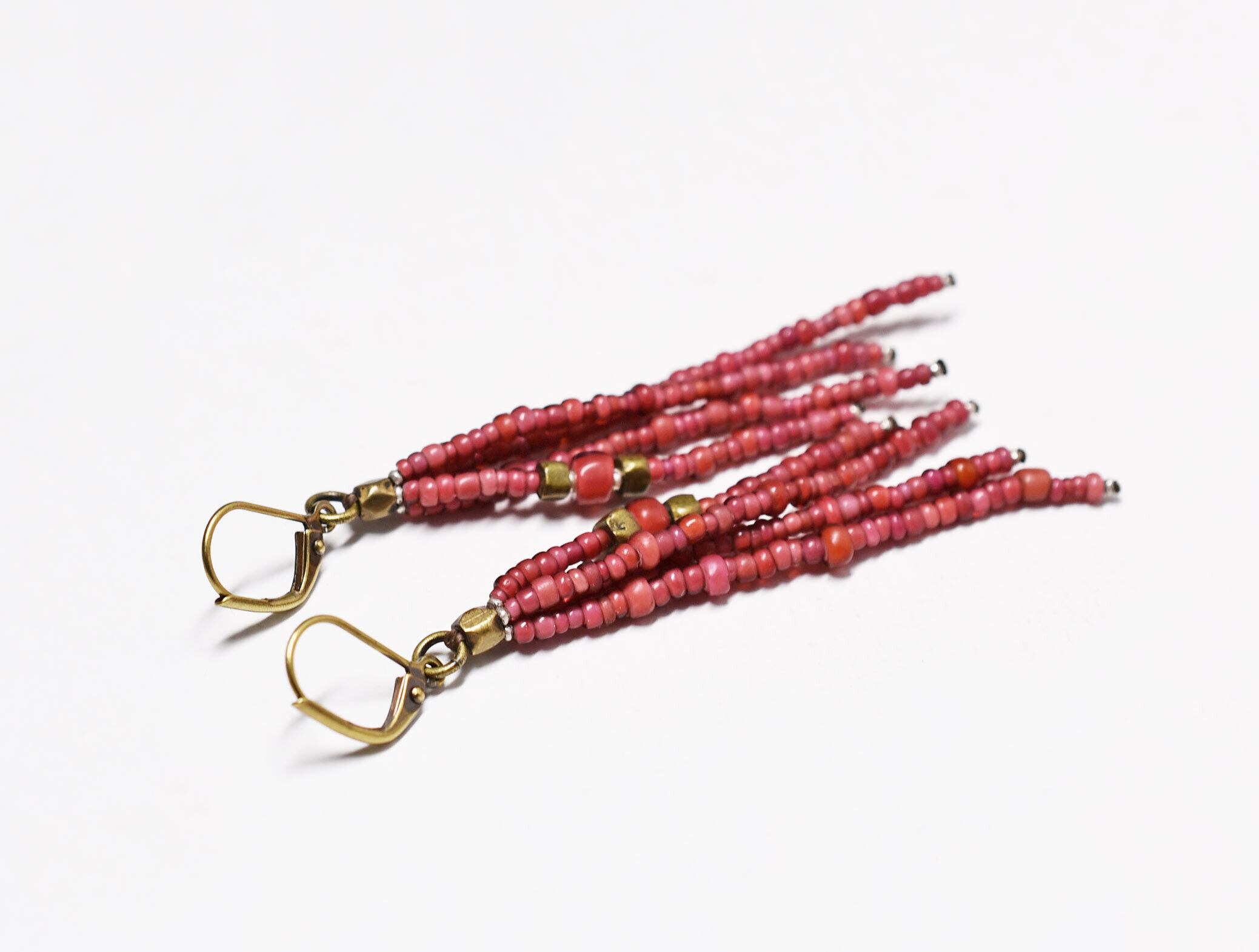 渋いピンク色のビーズはホワイトハーツと呼ばれるアンティークビーズです。芯(ハート)部分が白いことからこう呼ばれています。こちらは19~20世紀頃のベネチア産のビーズです。特にこちらは金で赤色を発色させているため、金赤ホワイトハーツと呼ばれる希少なビーズです。