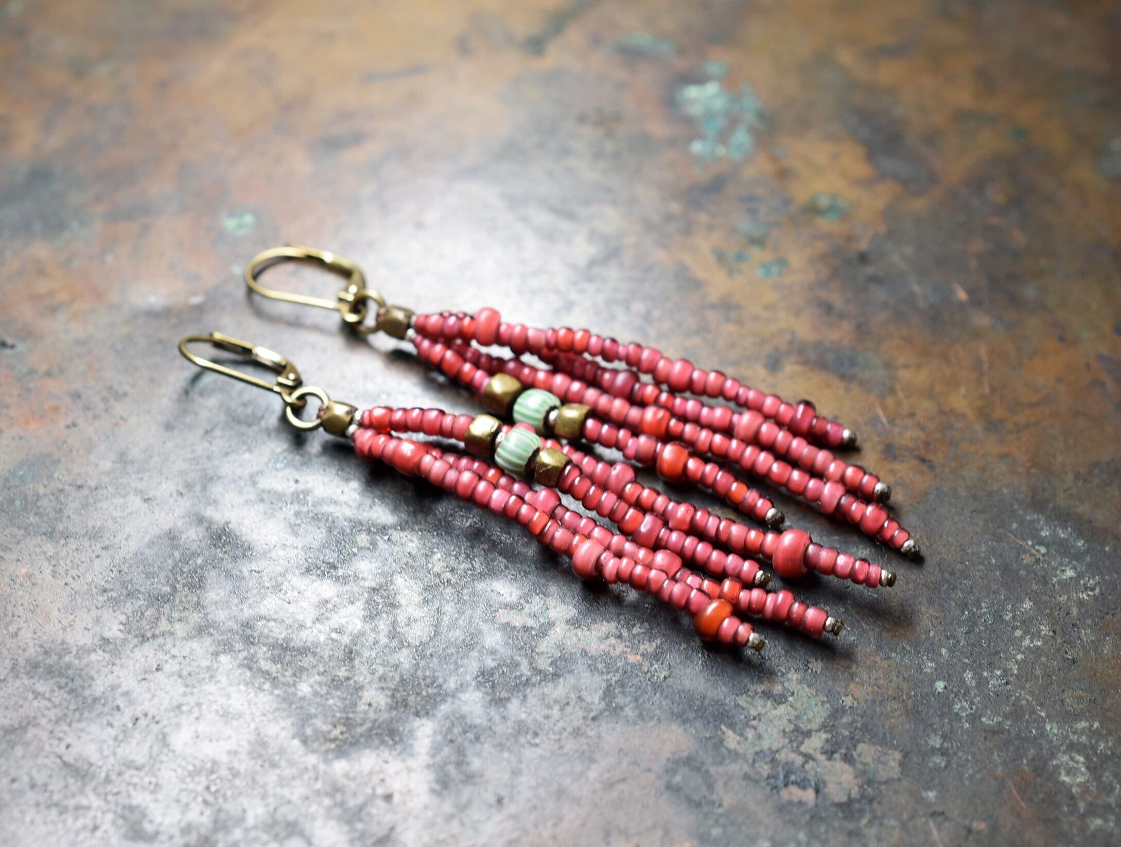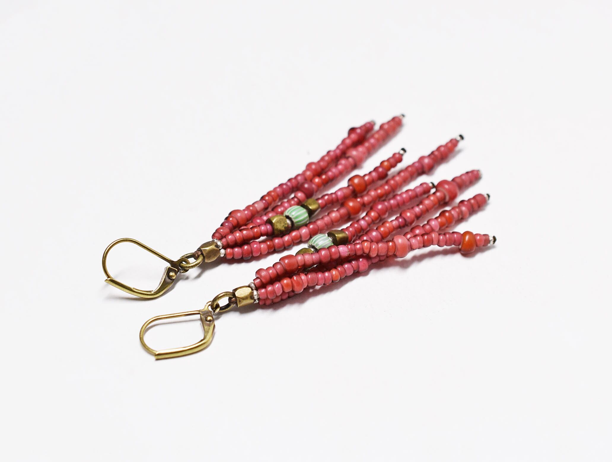 渋いピンク色のビーズはホワイトハーツと呼ばれるアンティークビーズです。芯(ハート)部分が白いことからこう呼ばれています。こちらは19~20世紀頃のベネチア産のビーズです。特にこちらは金で赤色を発色させているため、金赤ホワイトハーツと呼ばれる希少なビーズです。