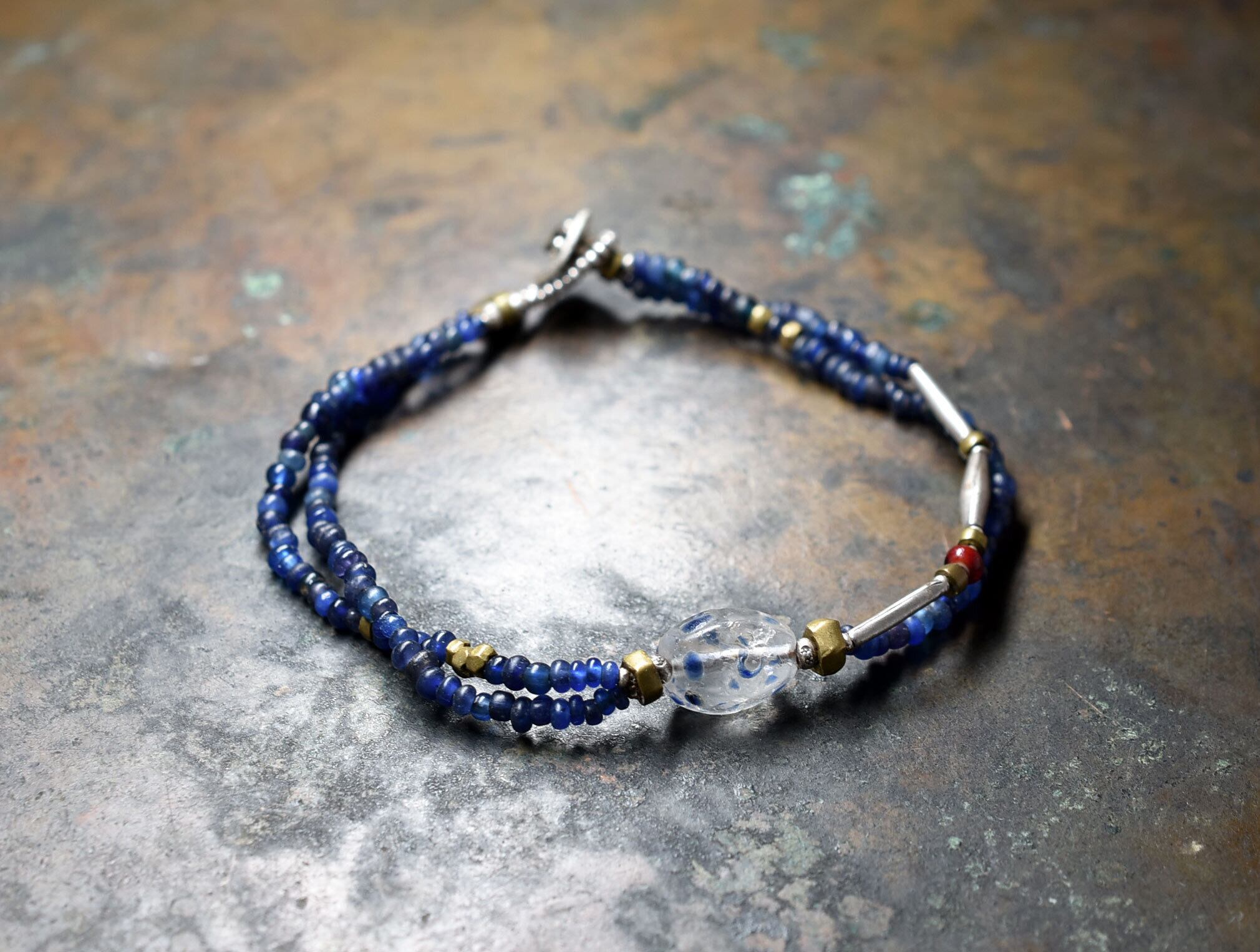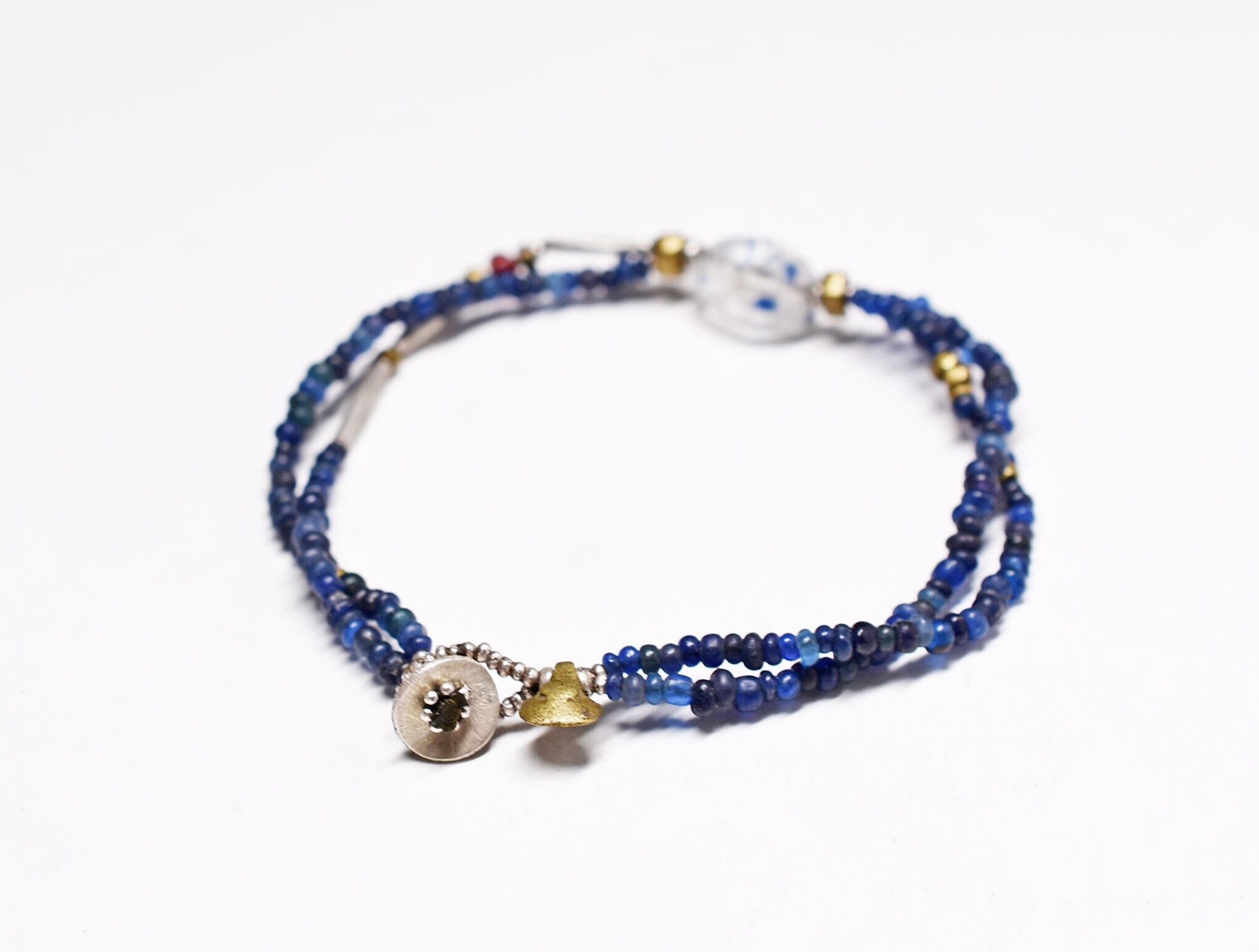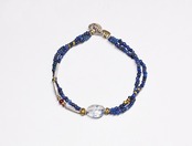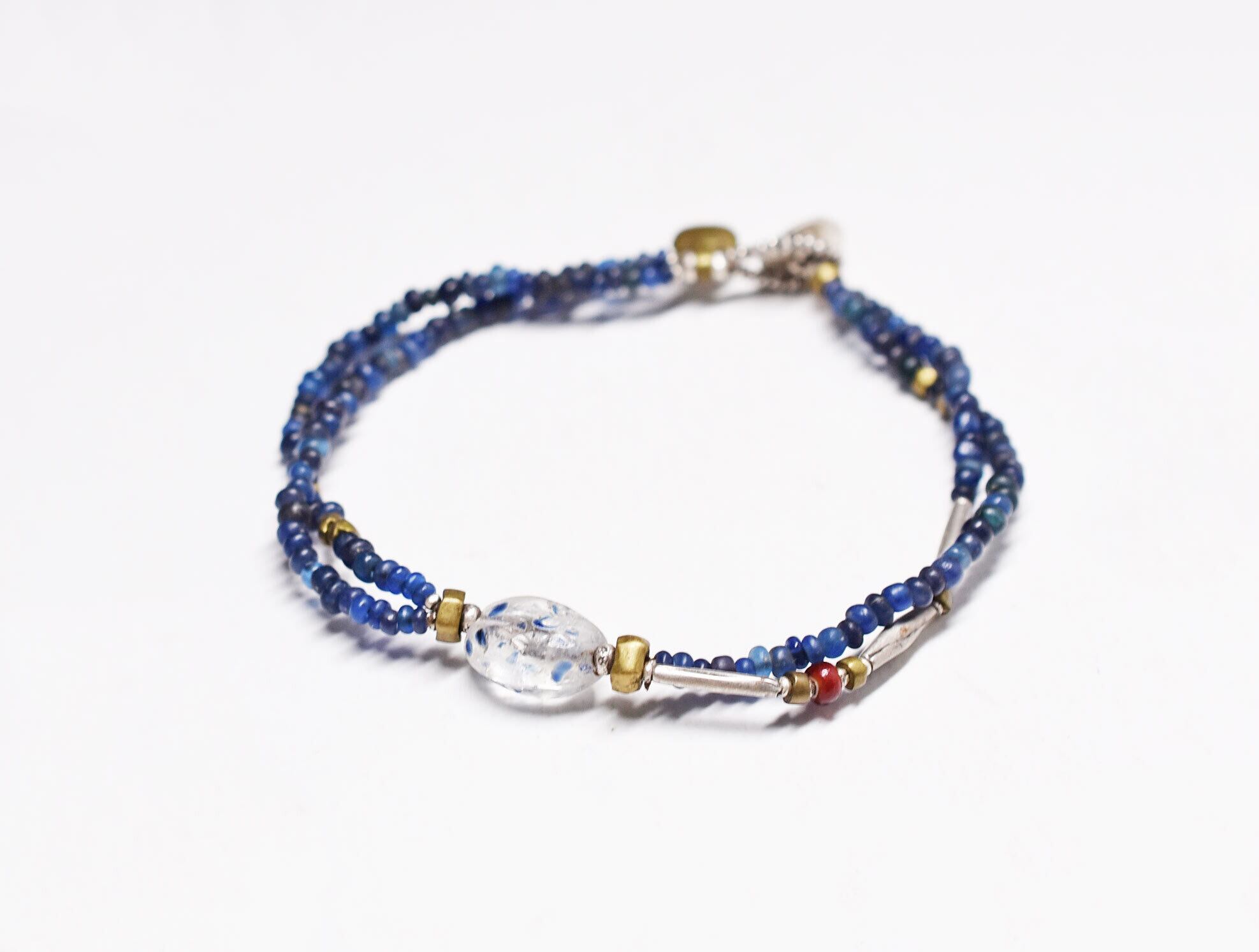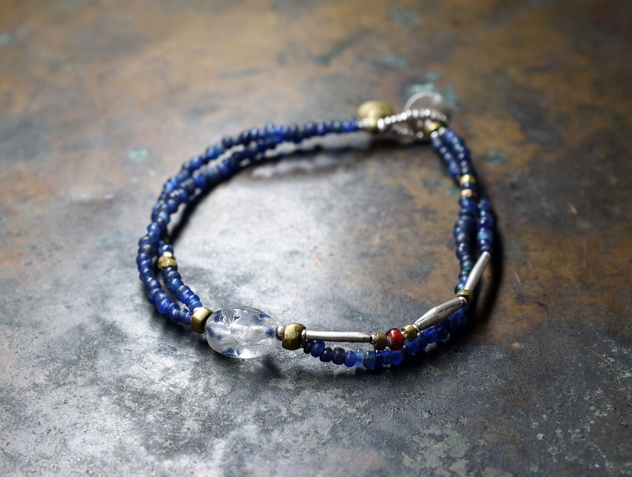 代施釉水晶、oldチンシルバー、oldオリッサブラス、ホワイトハーツ、ダークブルーのアンティークビーズで繋いだ2連のブレスです。