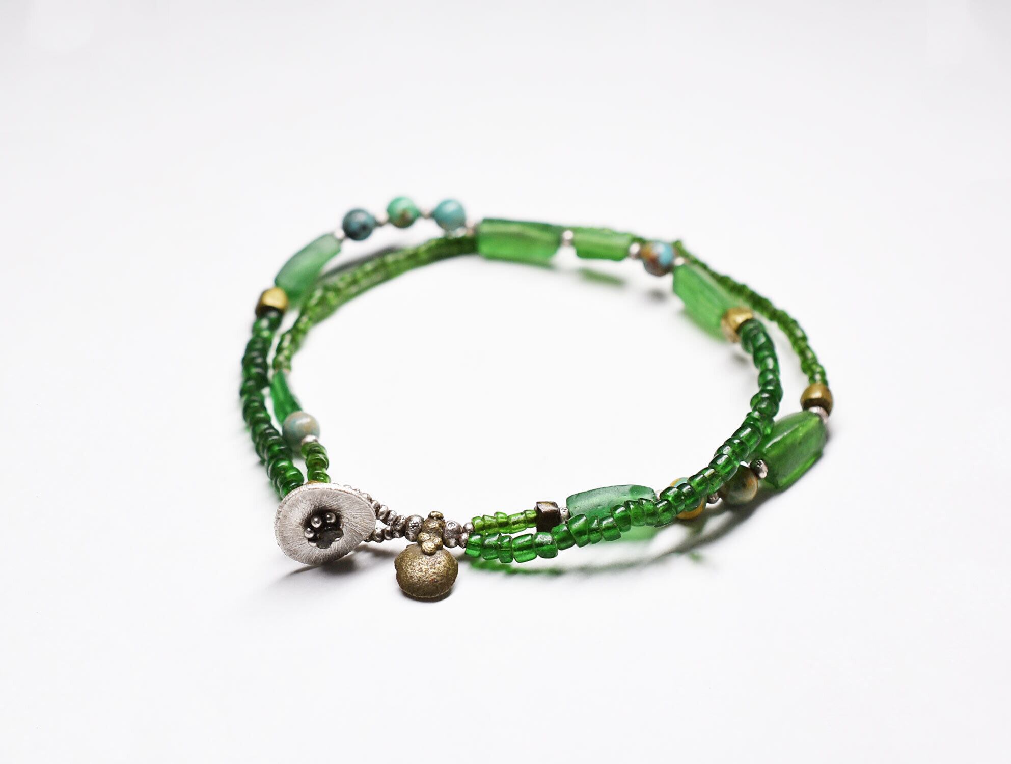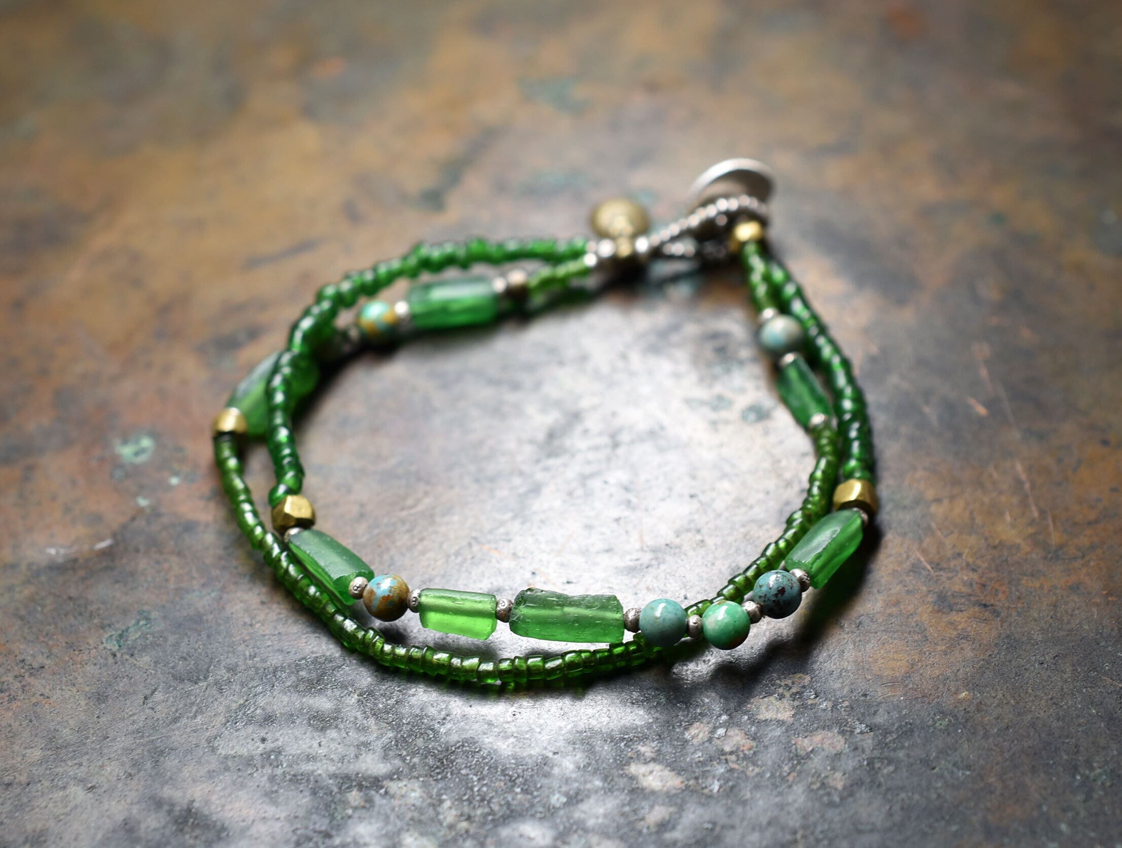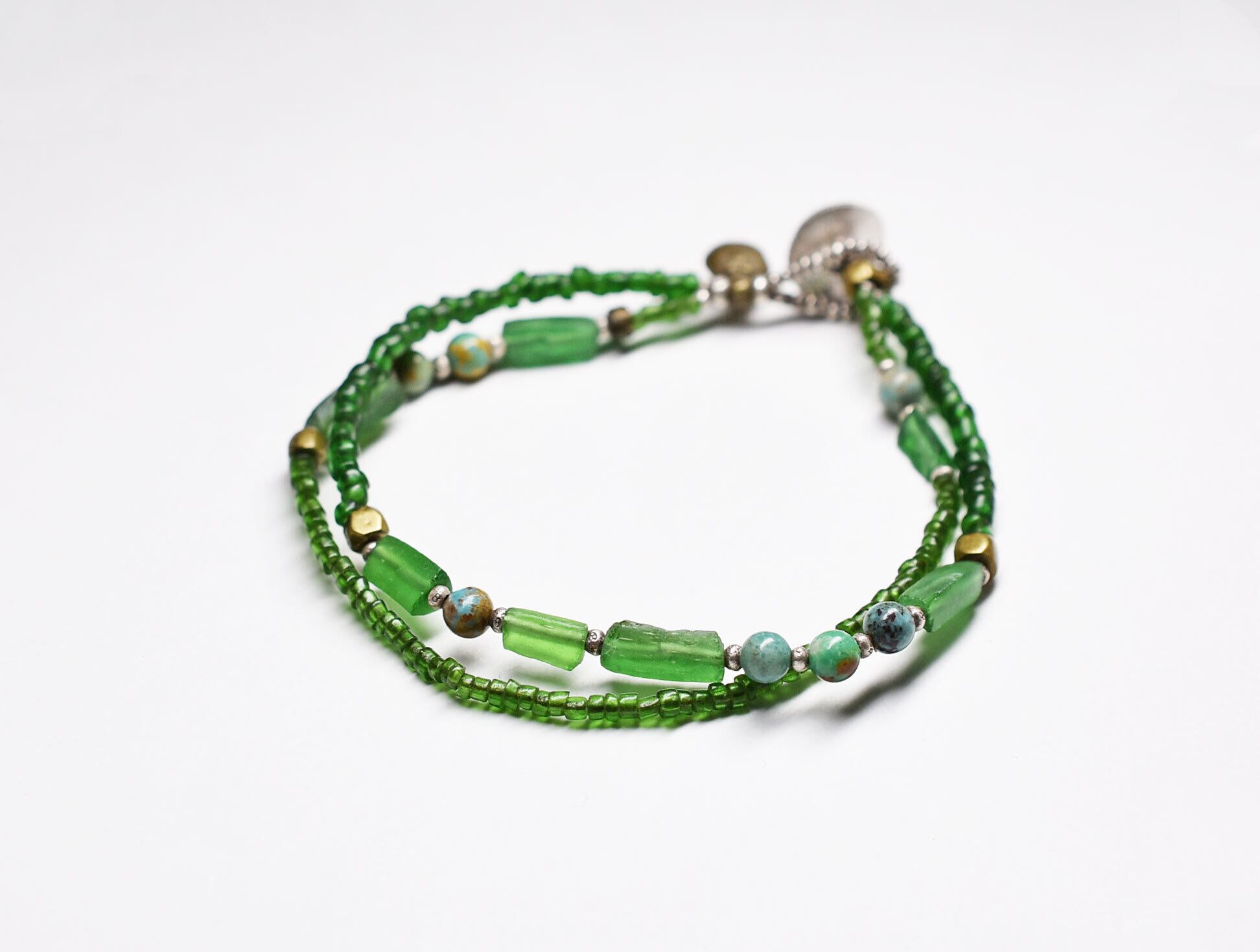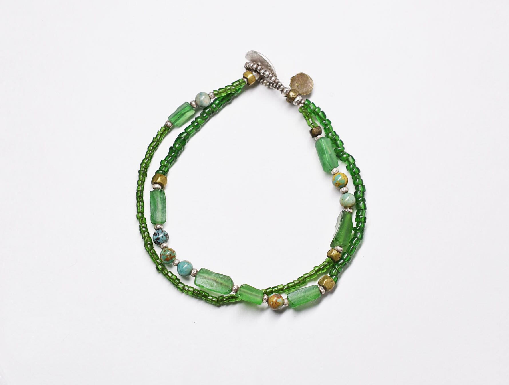 グリーンのシードビーズ、ローマングラス、ターコイズ、oldオリッサブラスなどで繋いだ2連のブレスです。
