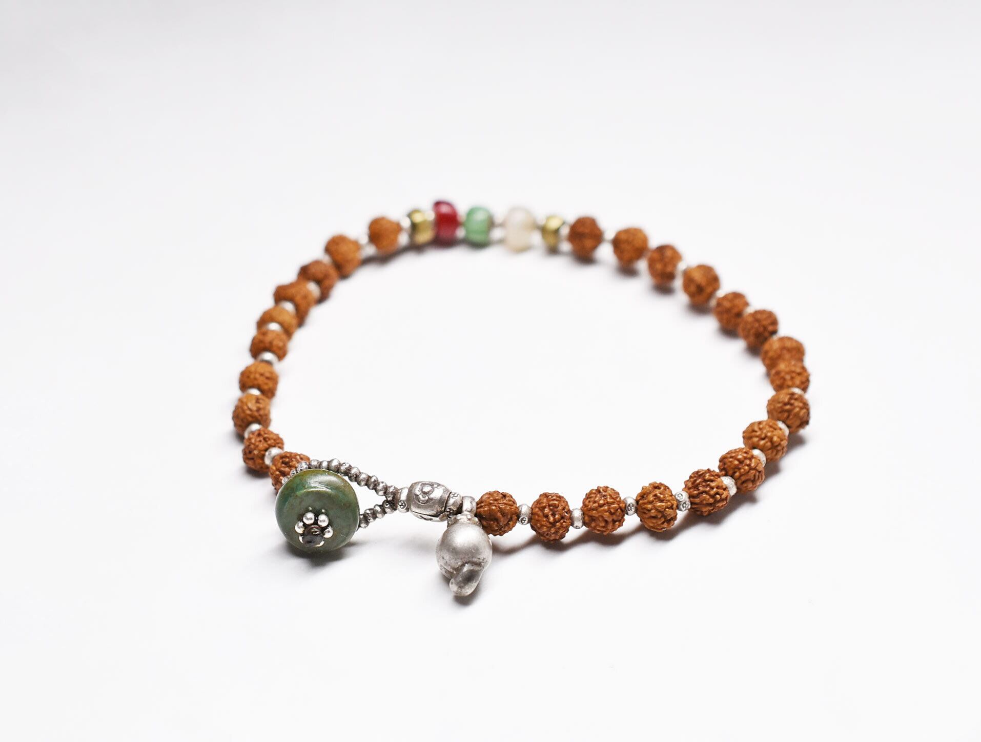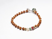小さなルドラクシャは、マーラー(数珠)のために繋げられていたものを使用しています。今は明るめな茶色をしていますがたくさん身に着けてみただくと肌の脂などでもっと濃いお色へ変化していくと思います。