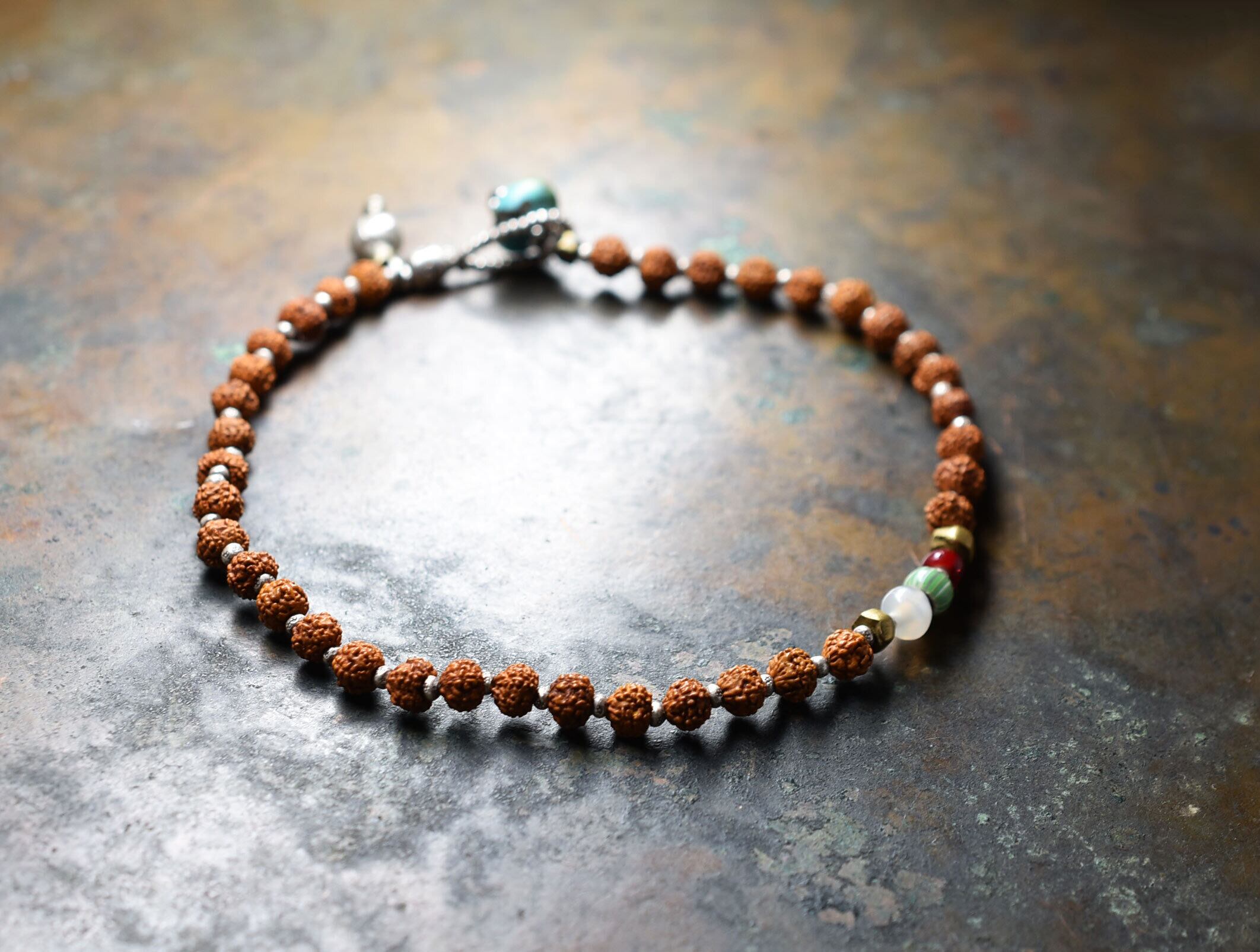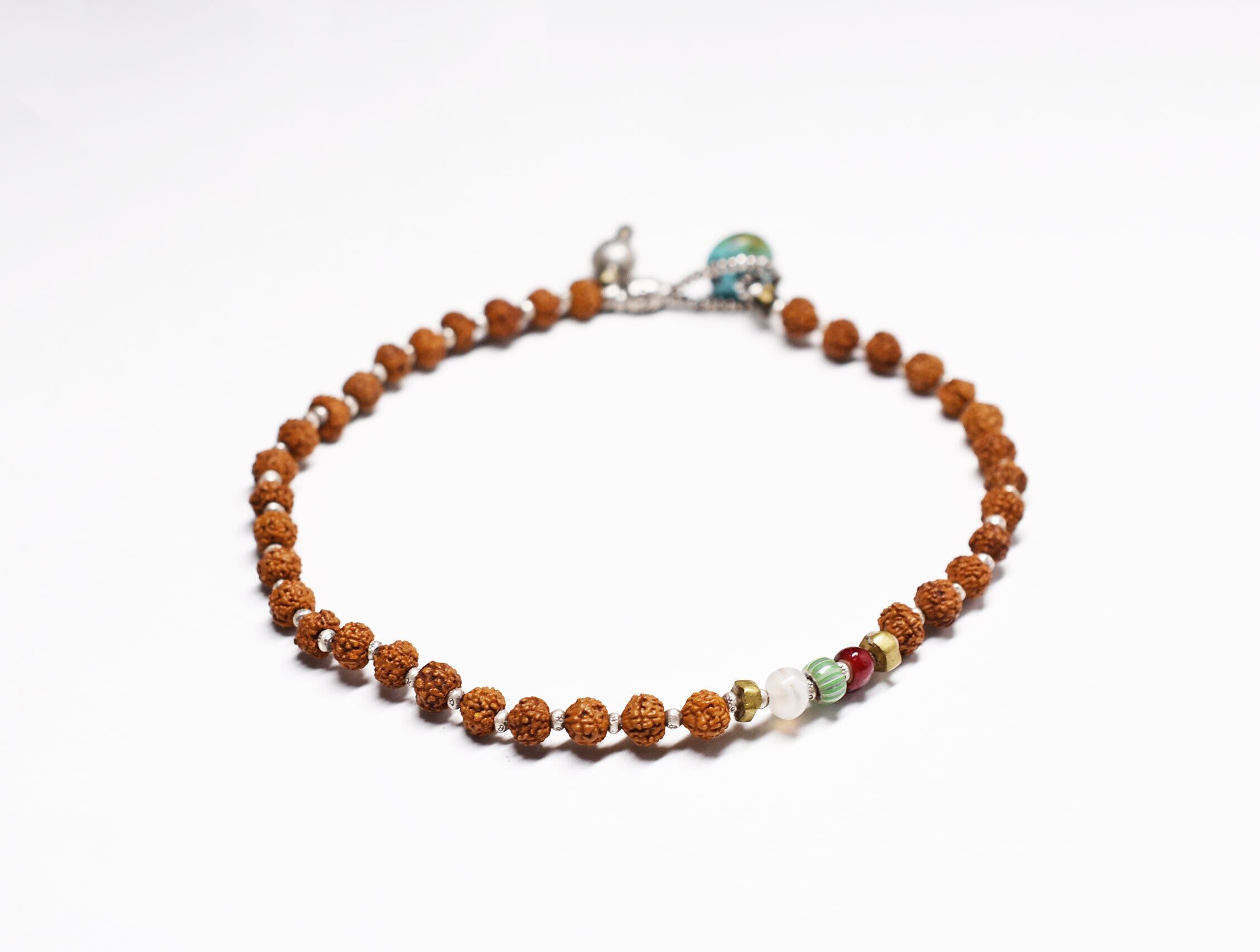 小さなルドラクシャと古代瑪瑙、グリーンシェブロンと濃赤ホワイトハーツのアンクレット