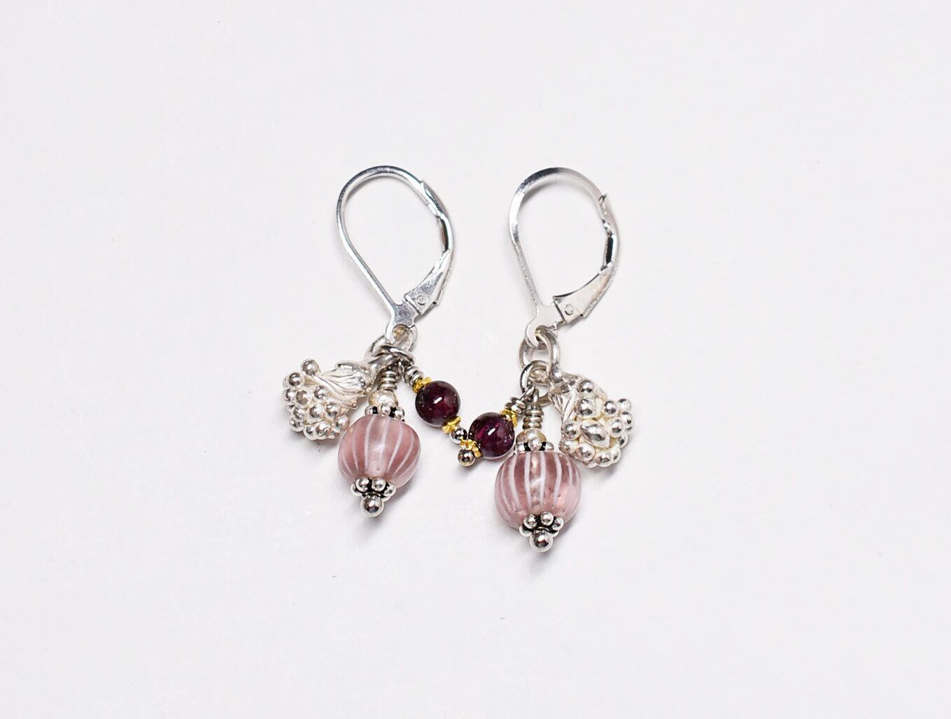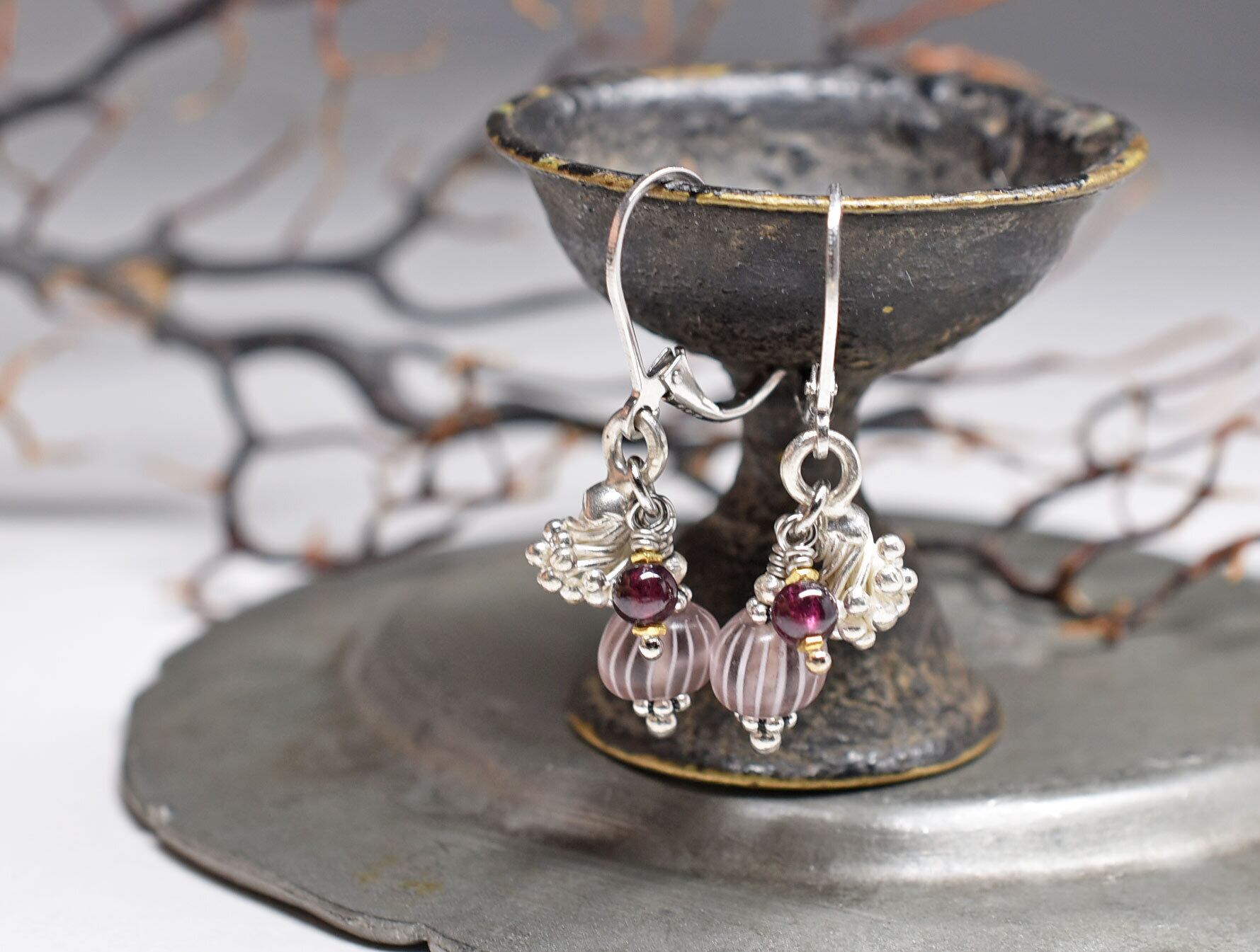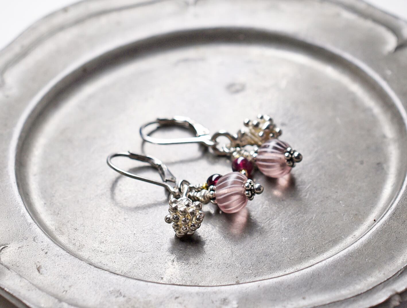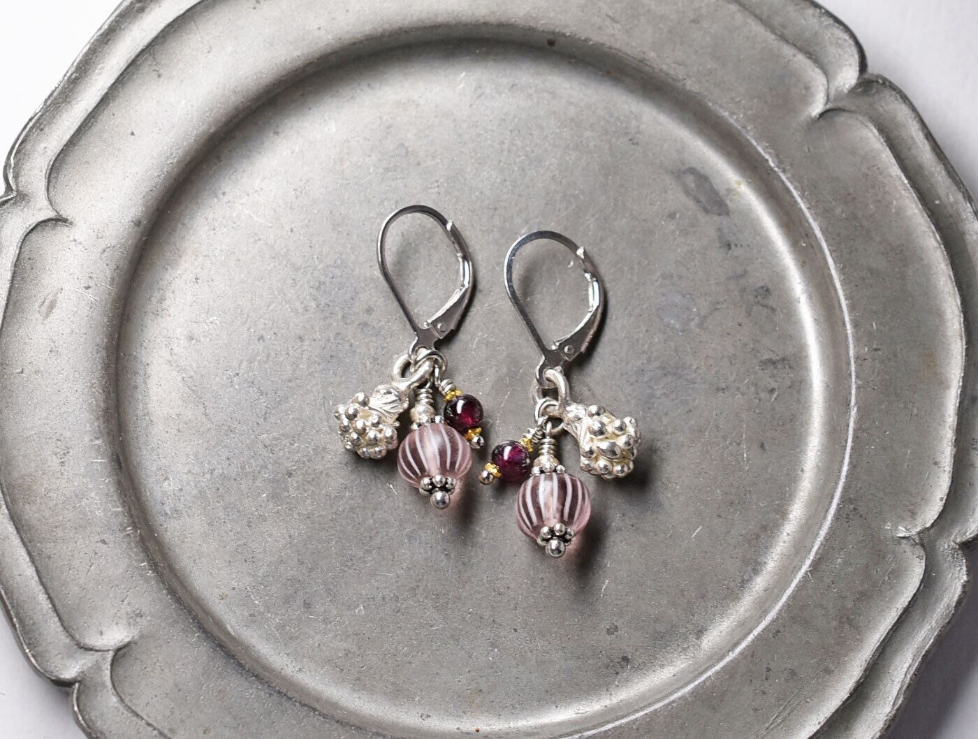 丸いガーネットを合わせました。18金コーティングされた小さなカレンシルバーで挟んでいます。