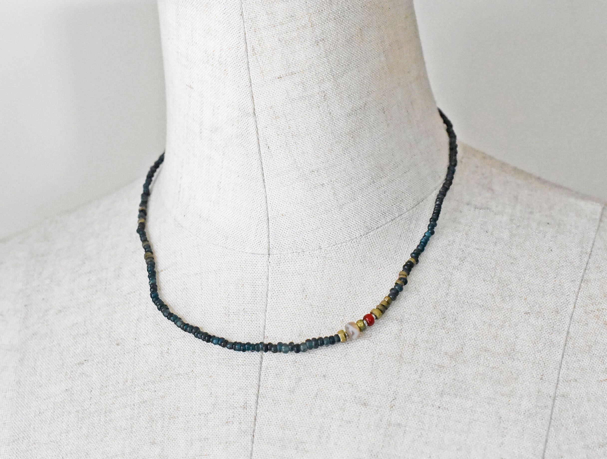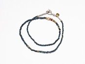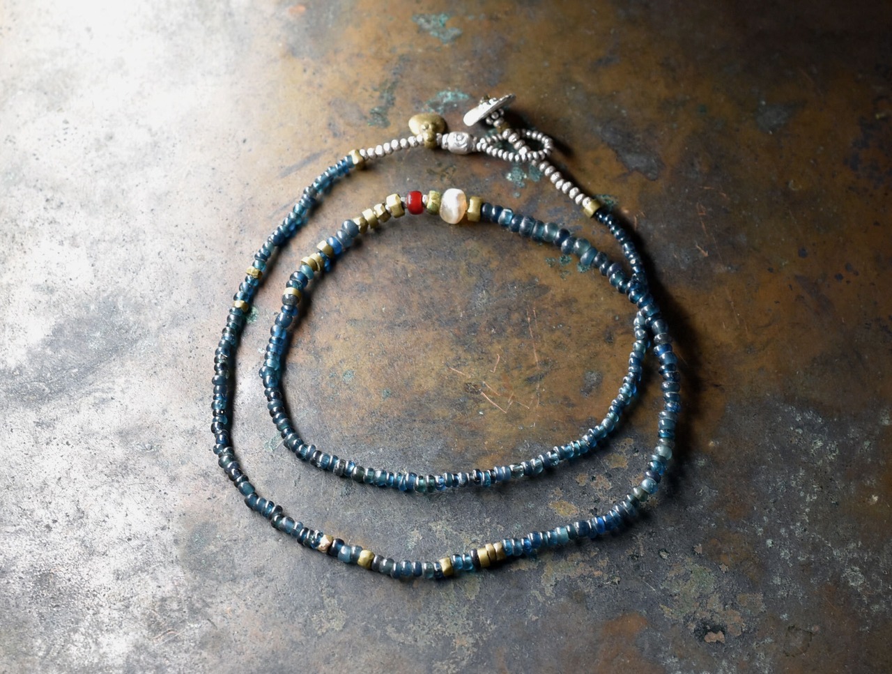 インディゴブルービーズと古代瑪瑙、血赤色ホワイトハーツ、oldオリッサブラスの華奢なネックレス
