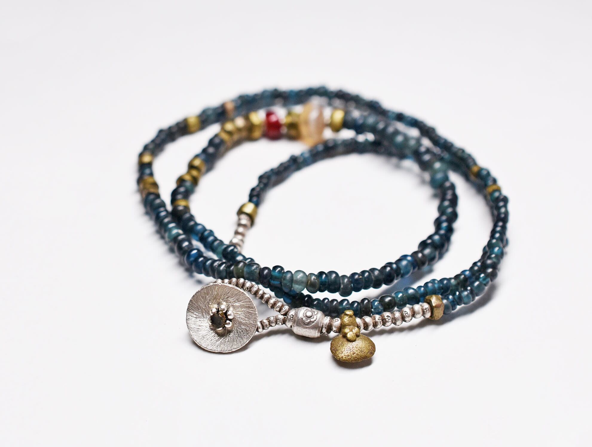 インディゴブルーのアンティークビーズと、クロス模様oldシルバービーズ、oldオリッサブラス、小さなカレンシルバーに濃赤色のホワイトハーツを入れたネックレスです。