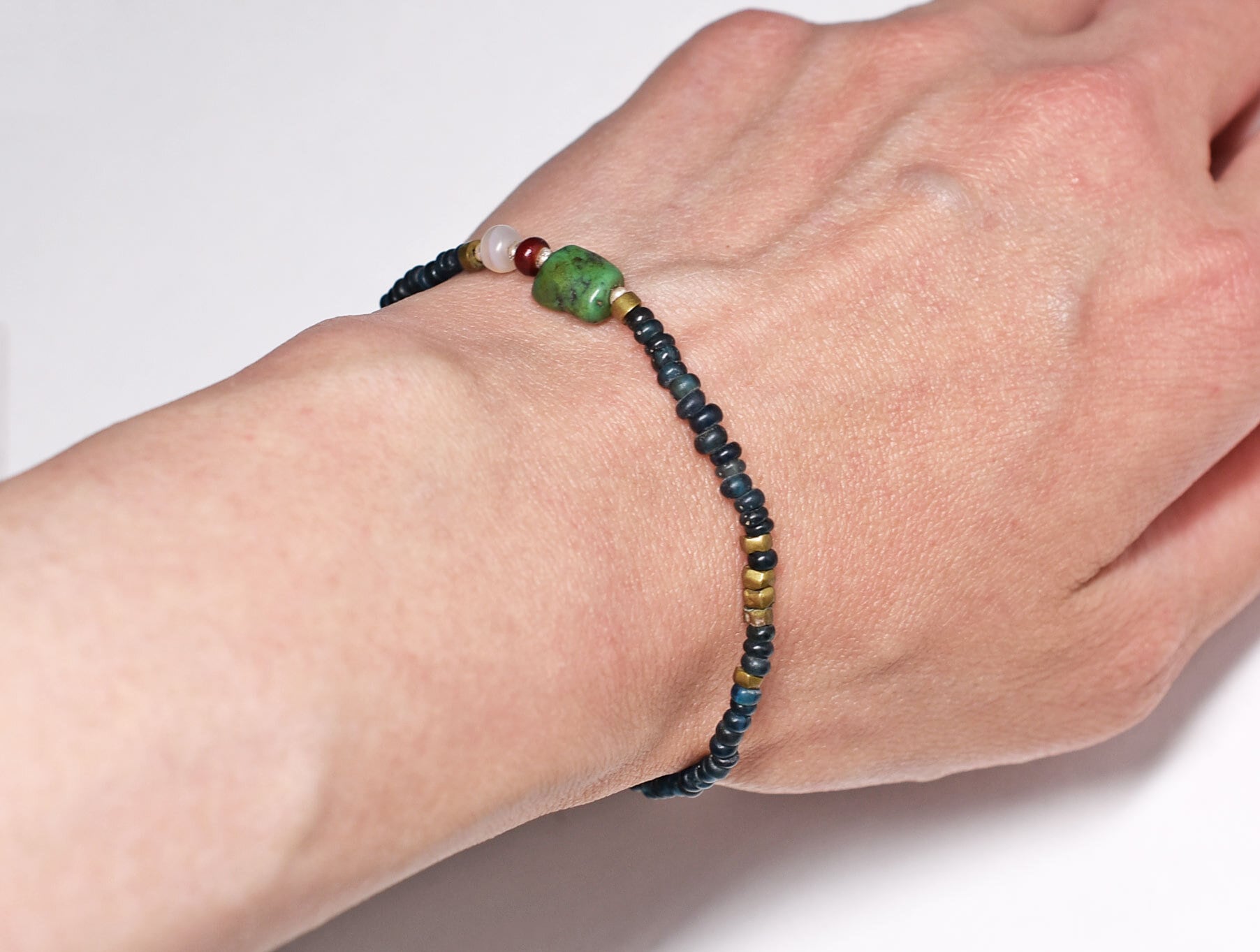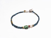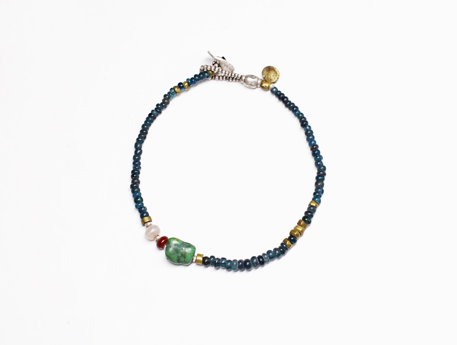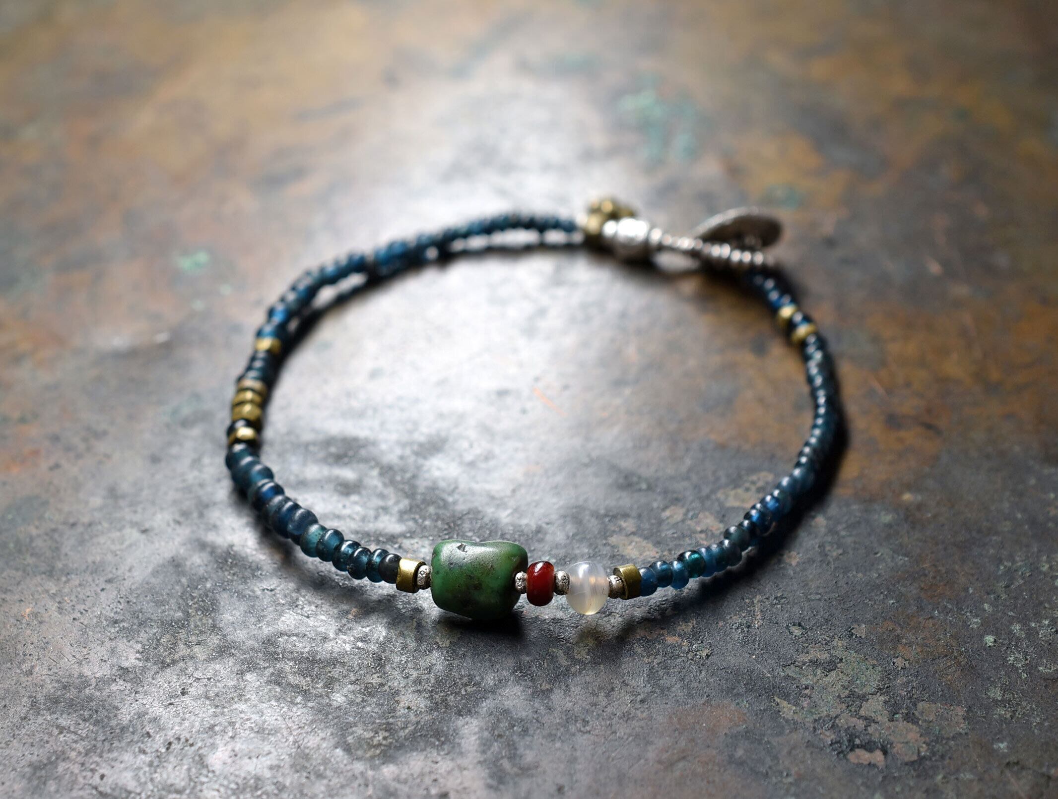 oldチベタンターコイズ、古代瑪瑙、血赤ホワイトハーツ、インディゴブルービーズ、oldオリッサブラスのブレス