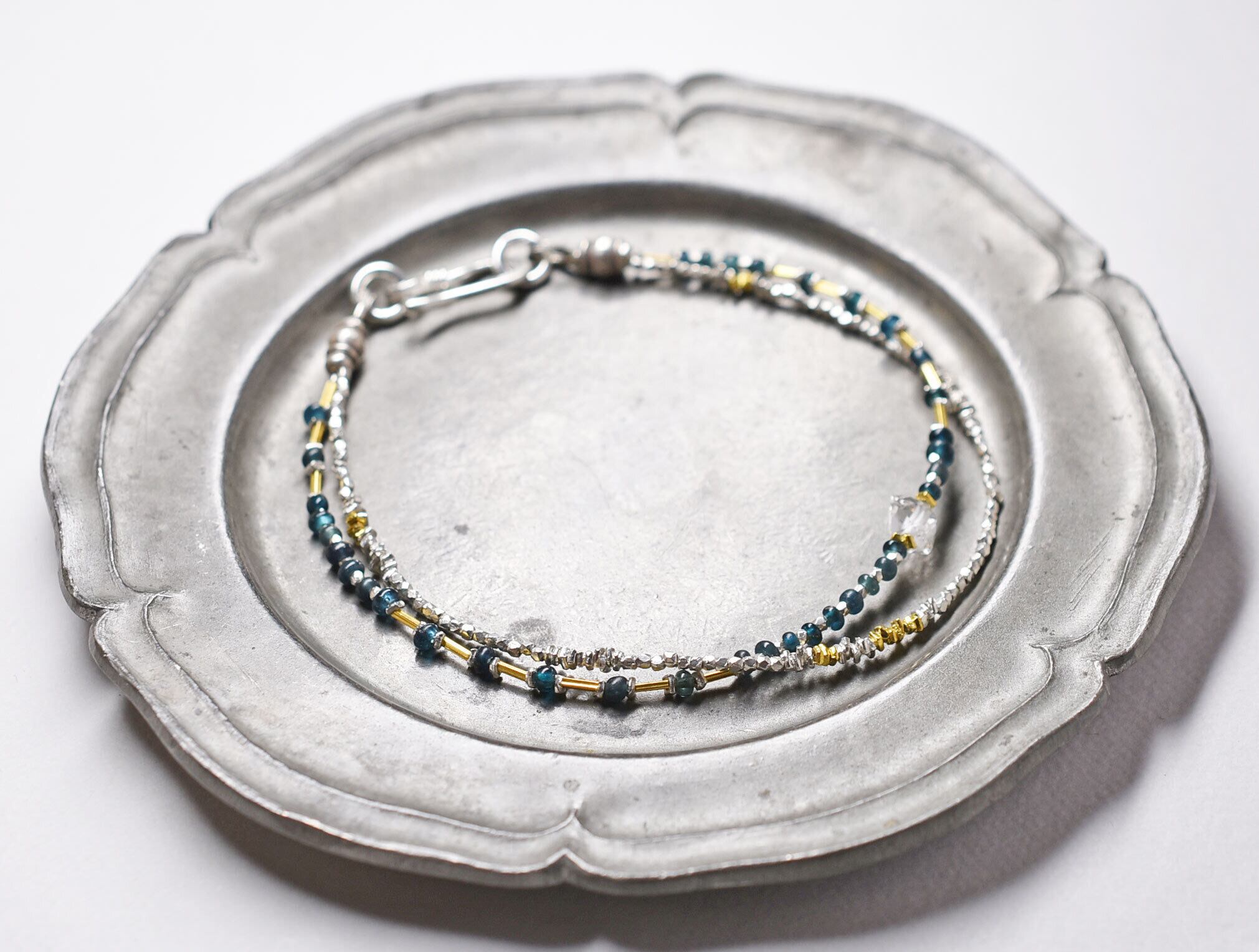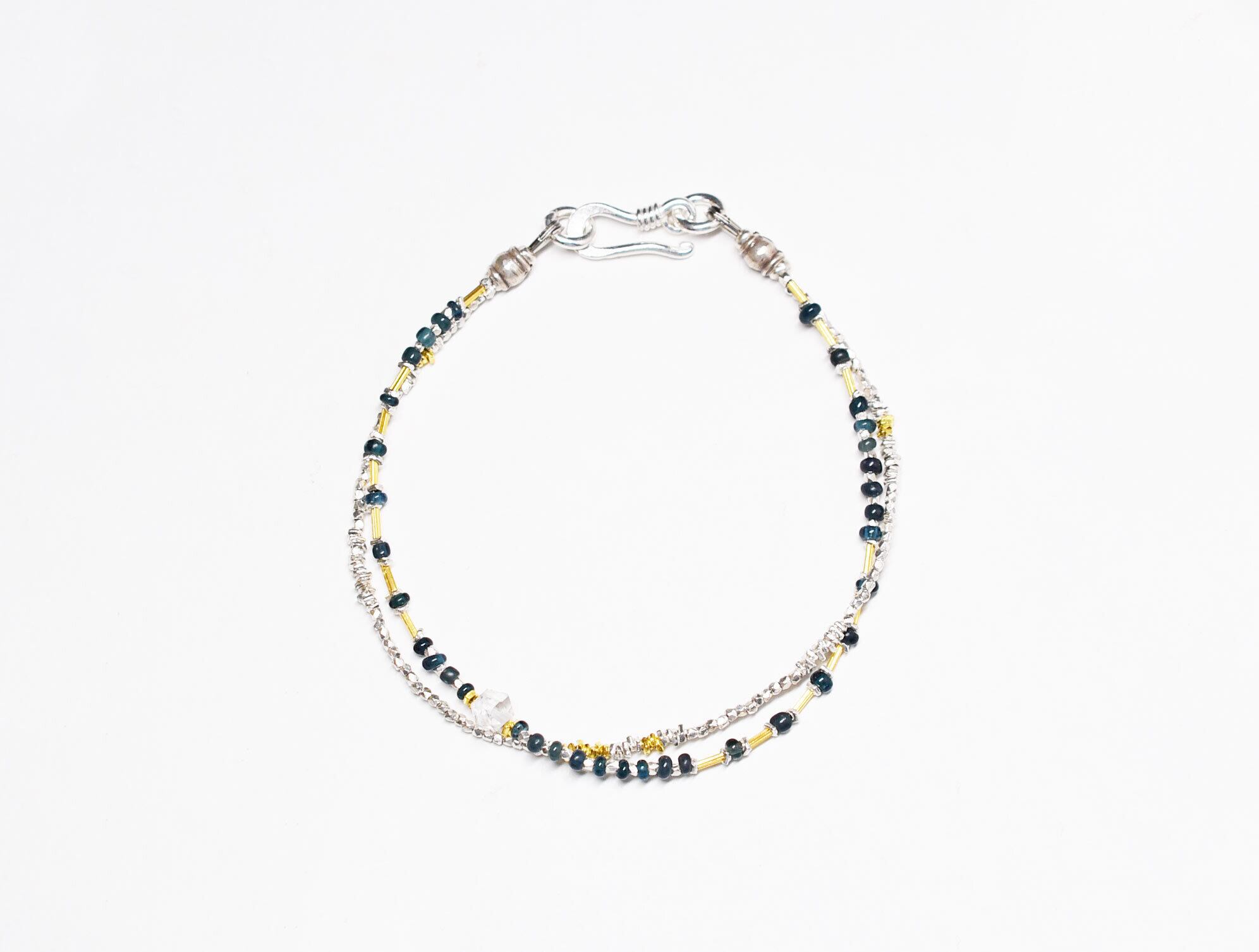 一粒ハーキマーダイヤモンドとインディゴブルービーズ、カレンシルバーの華奢な2連ブレス