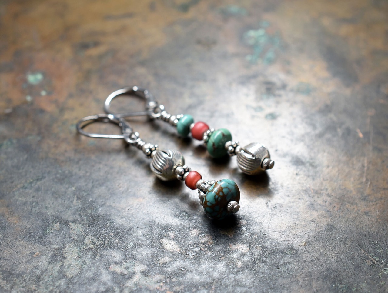 カレンシルバーとターコイズ、金赤ホワイトハーツを繋いだピアスです。