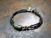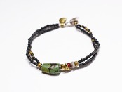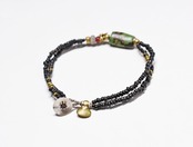 やや大き目なoldチベタンターコイズ、漆黒のビーズ、金赤色のホワイトハーツ、oldオリッサブラスなどを繋いだブレスです。