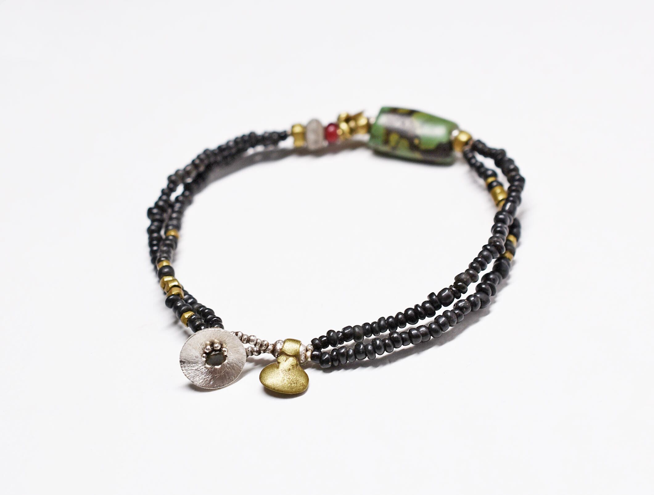 漆黒のビーズはローマ時代の発掘ビーズ(1~4世紀頃)と、インドパシフィックビーズをミックスして繋いでいます。