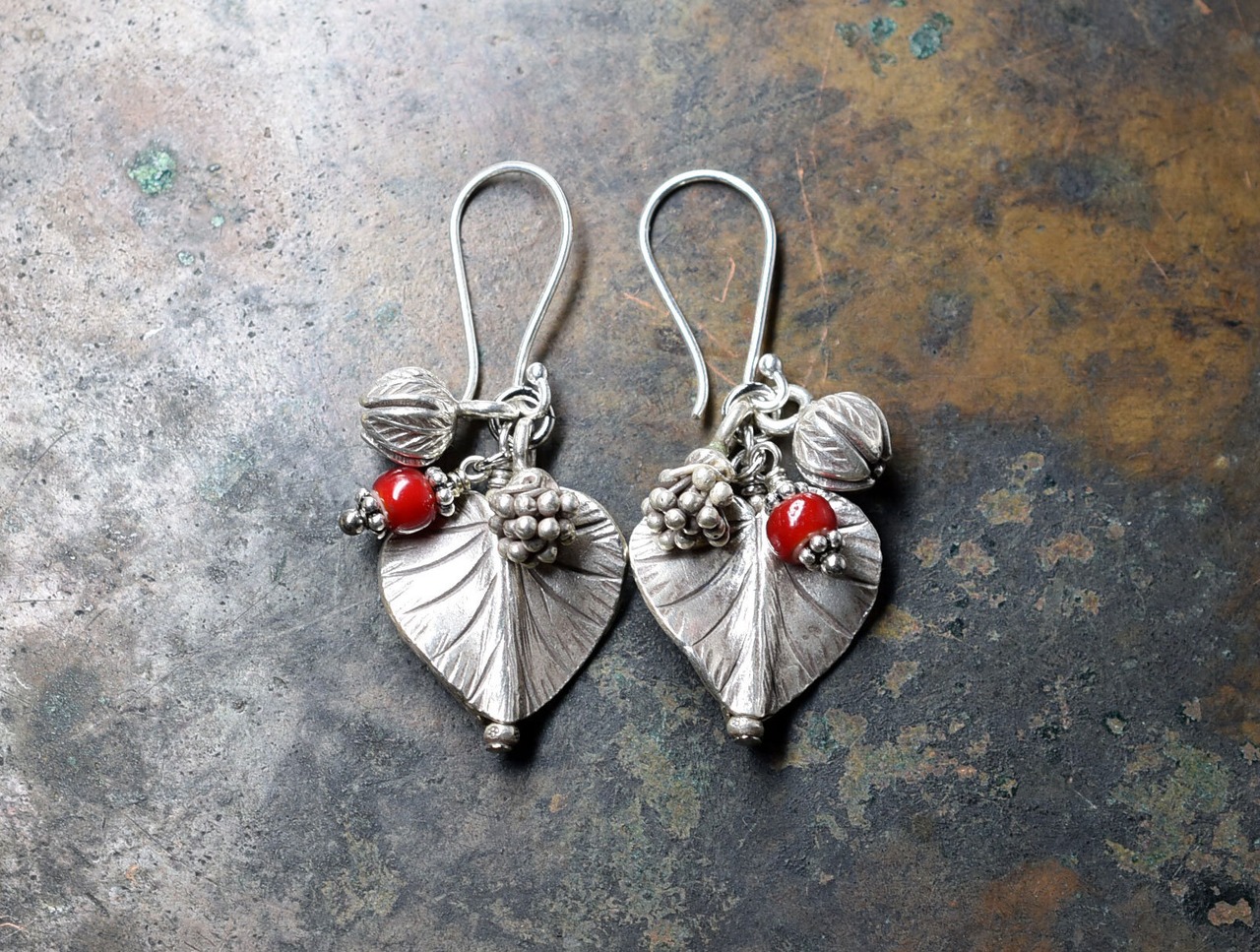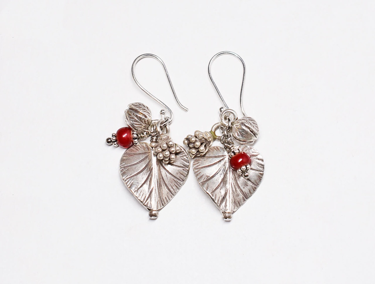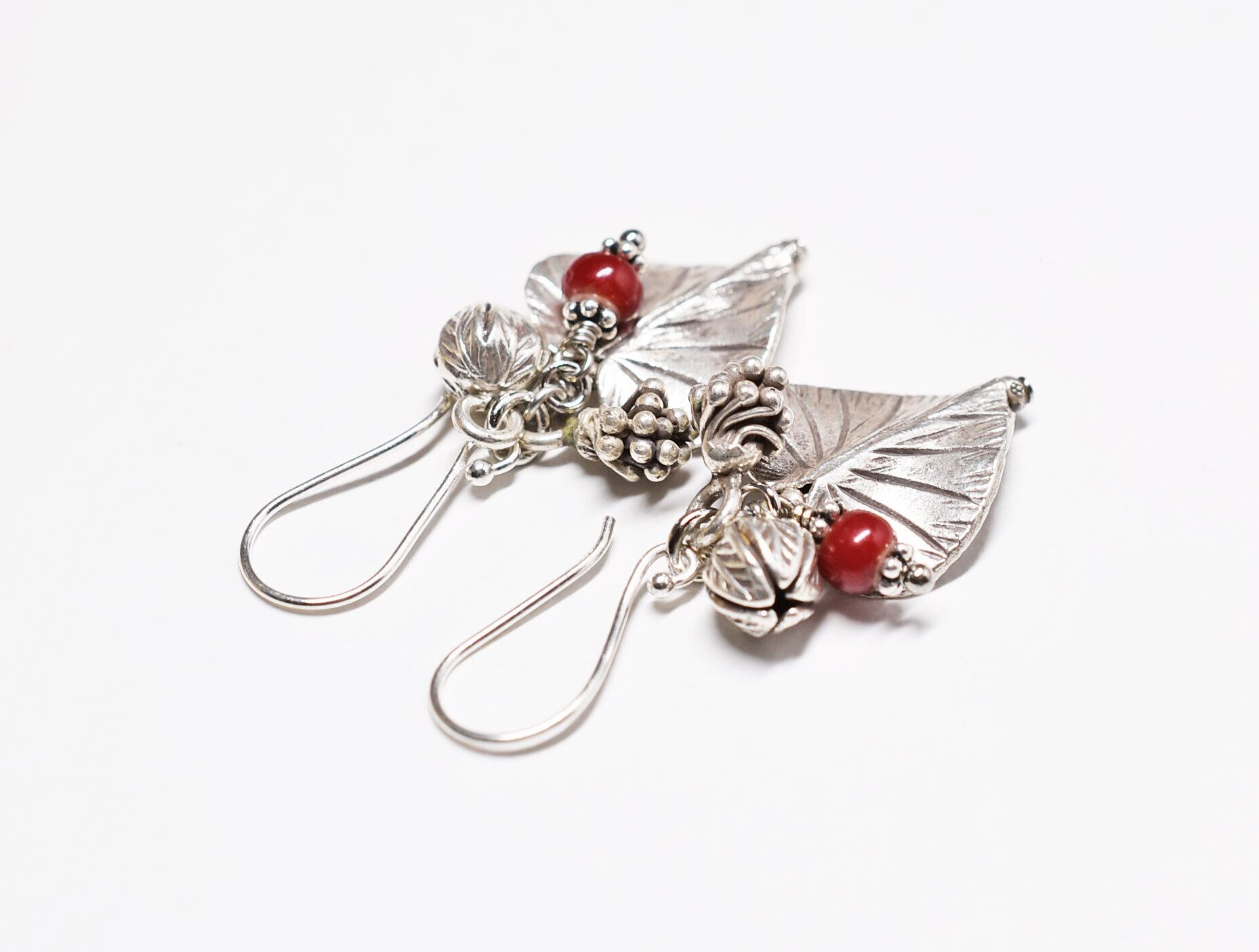 葉っぱと、蕾のカレンシルバーと、赤いアンティークビーズを一粒繋いだピアスです。