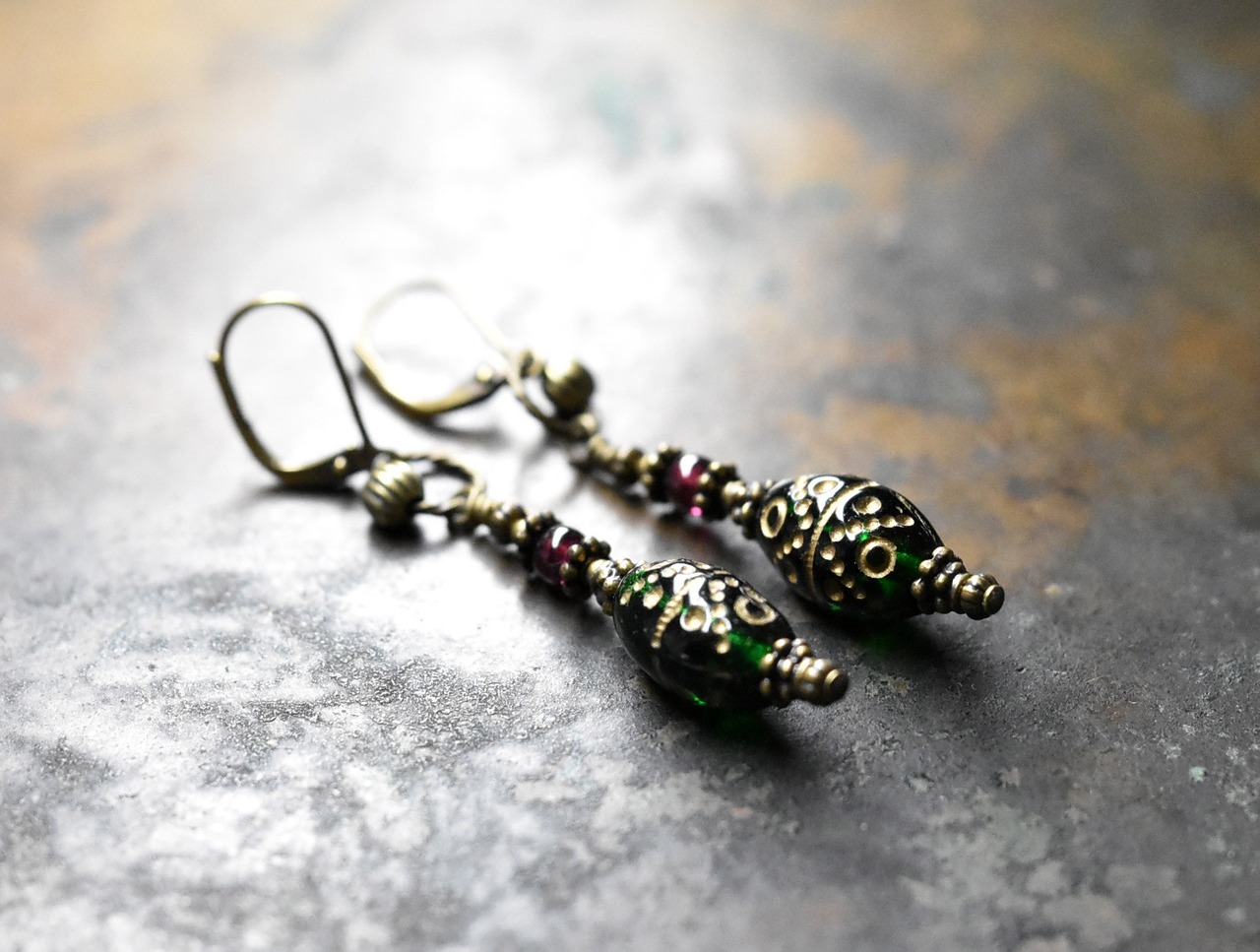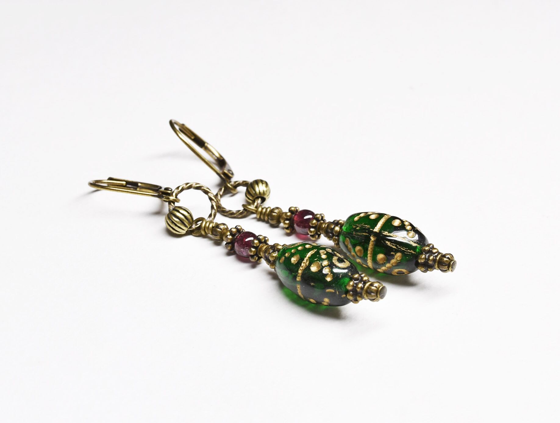 ダークグリーンドイツヴィンテージビーズとガーネットのリングピアス(再販)