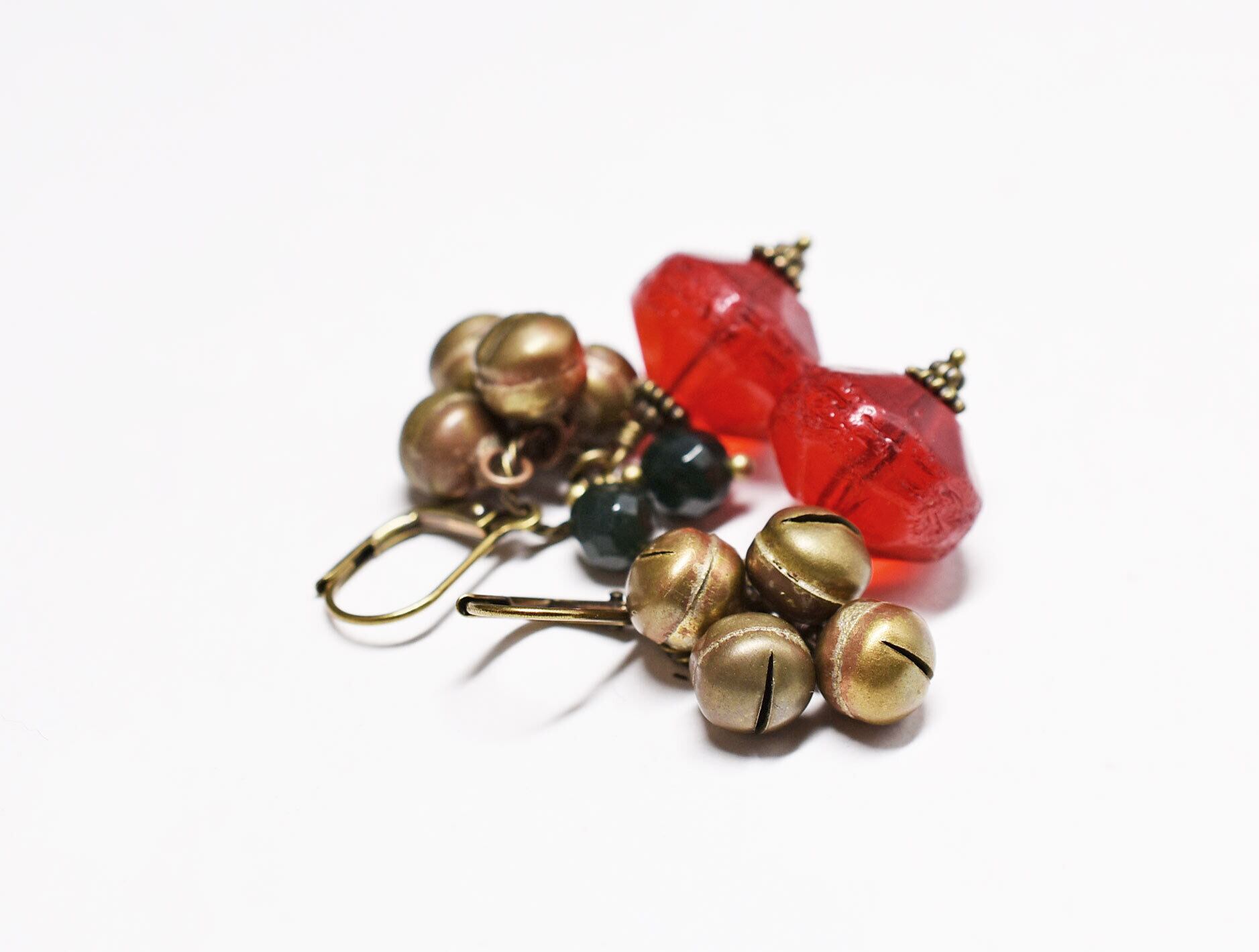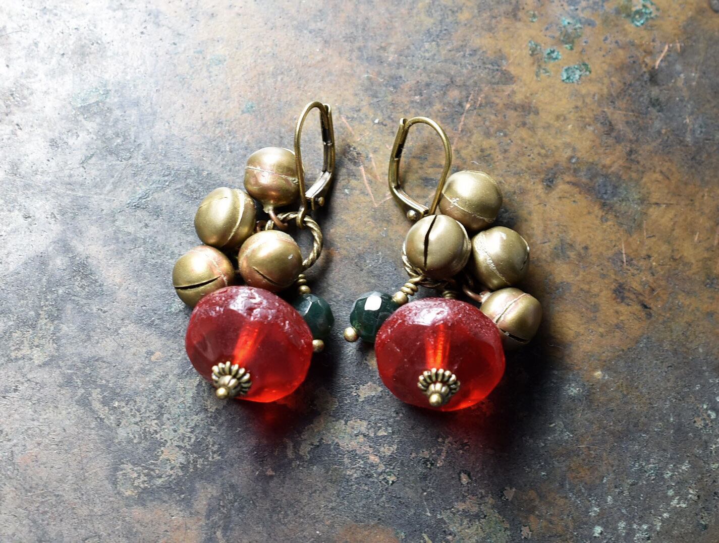 真っ赤な算盤型アンティークボヘミアビーズと鈴、インディアンアゲートのピアス