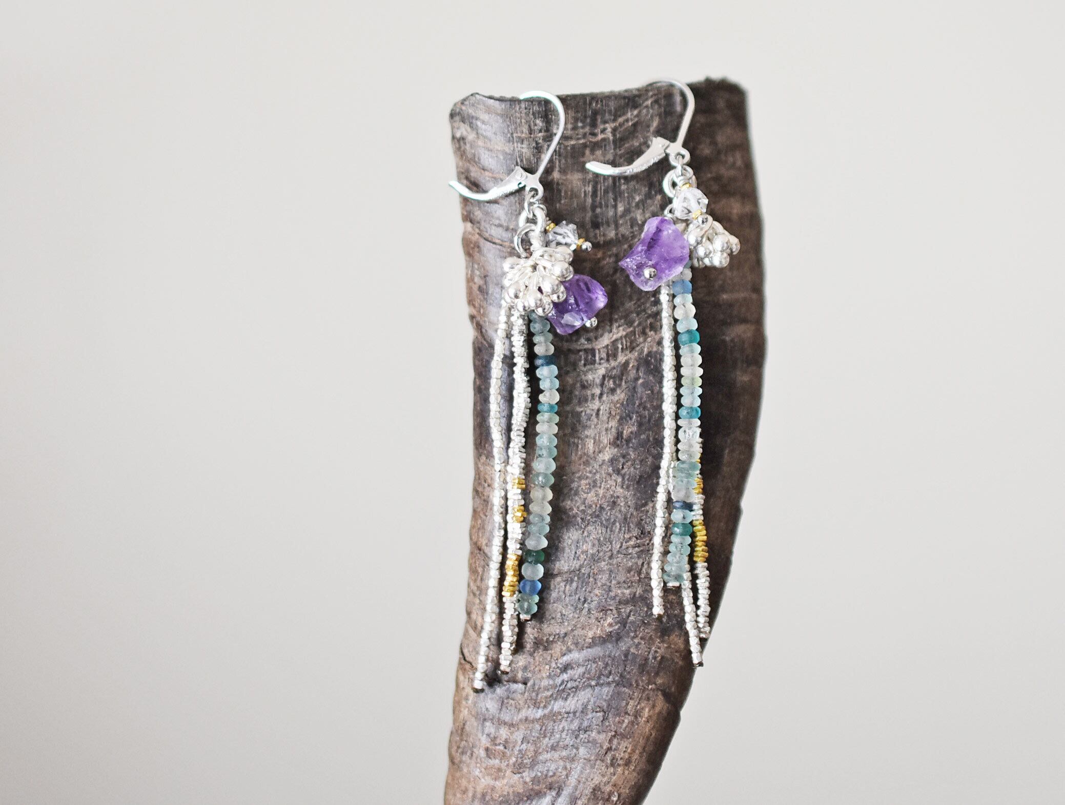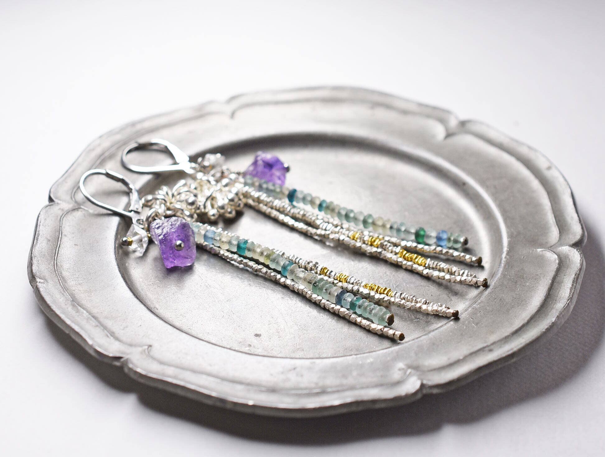 小さなローマングラスビーズと、カレンシルバービーズ、ハーキマーダイヤモンド、アメジストを繋いだ4連のピアスです。