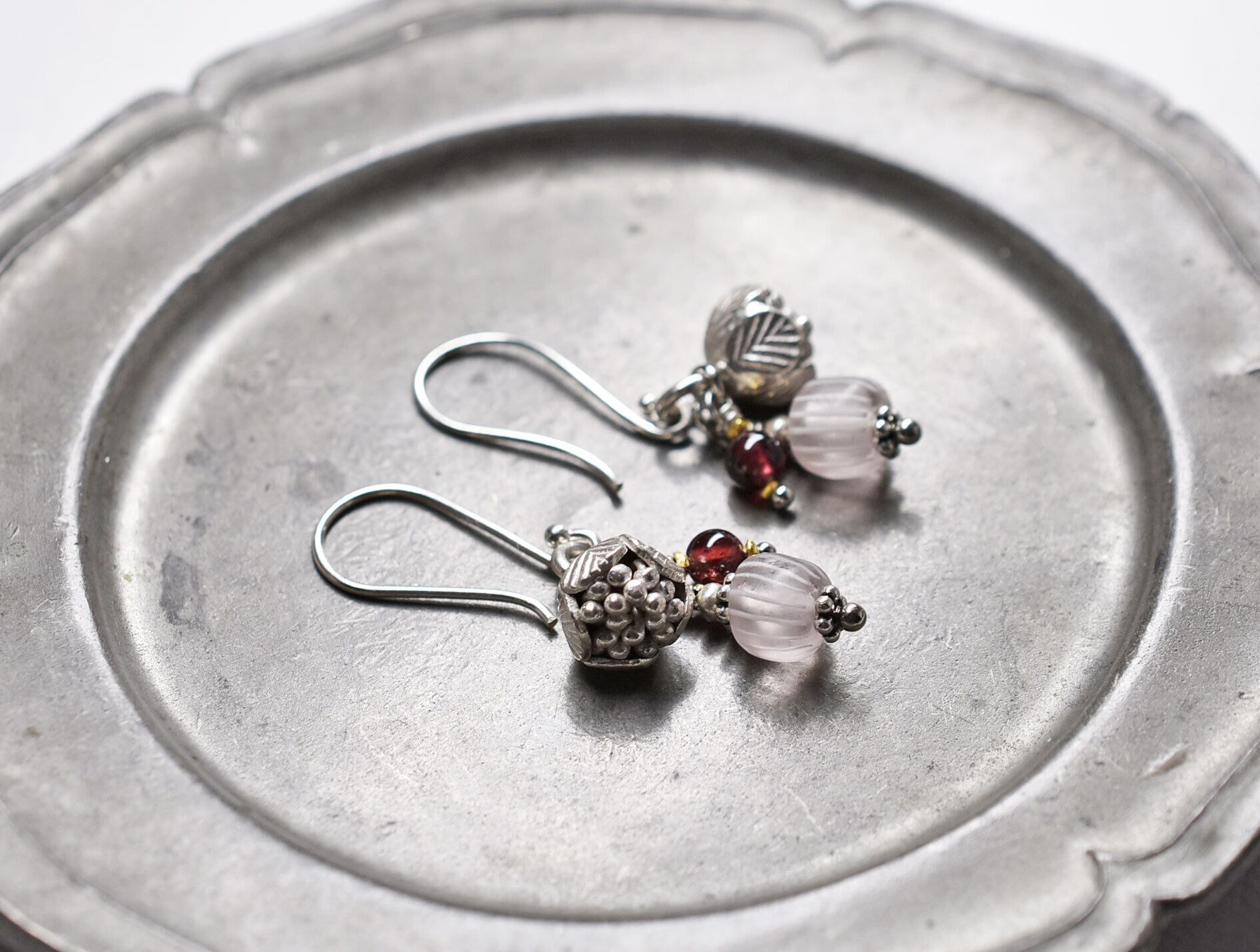 丸いガーネットを合わせました。18金コーティングされた小さなカレンシルバーで挟んでいます。
