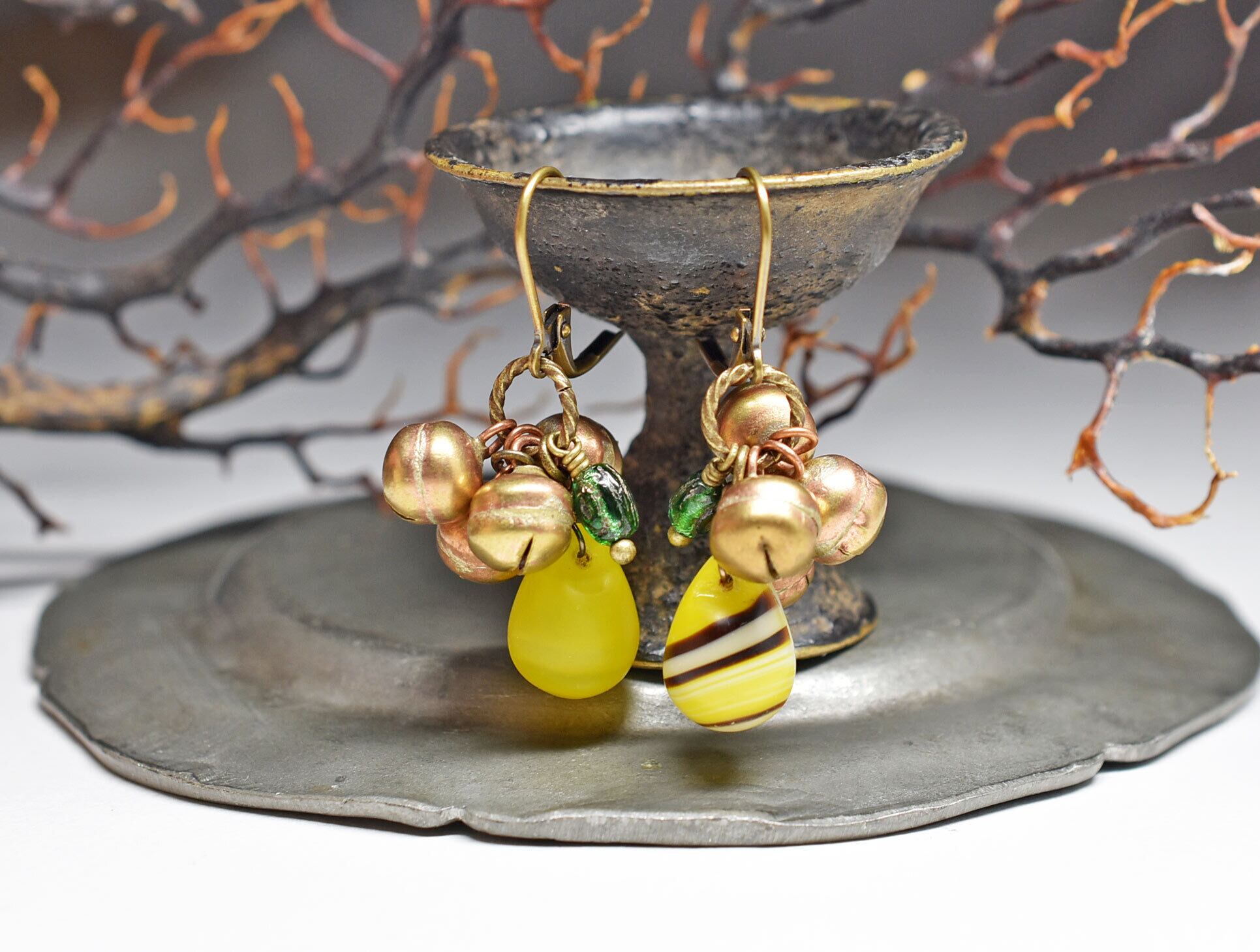 ハニーカラーウエディングビーズと鈴、箔押しボヘミアビーズのピアス