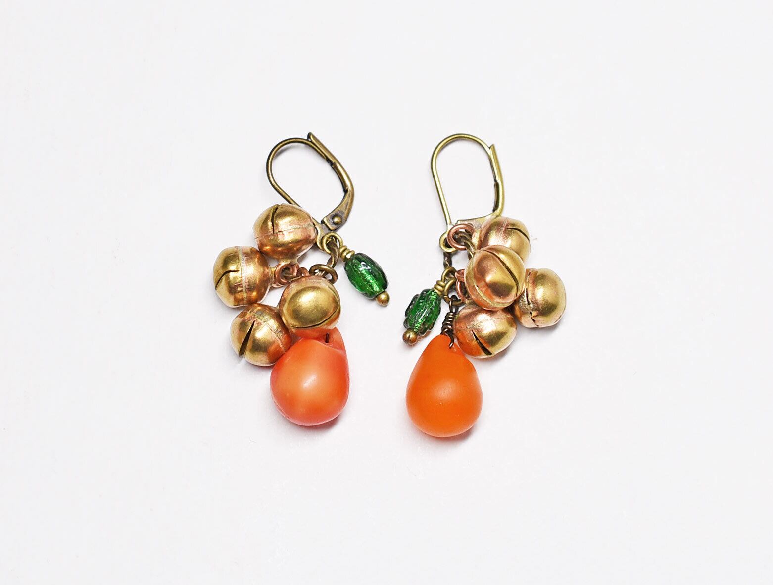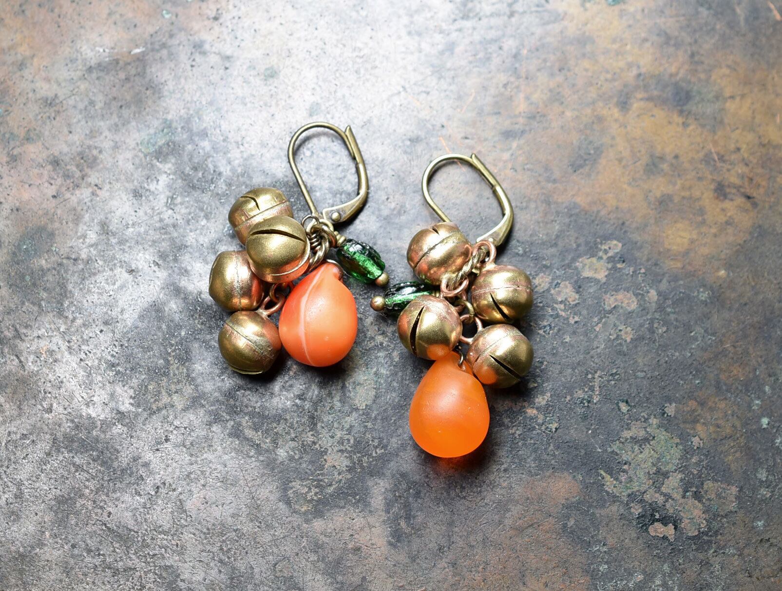 オレンジカラーウエディングビーズと鈴、箔押しボヘミアビーズのピアス