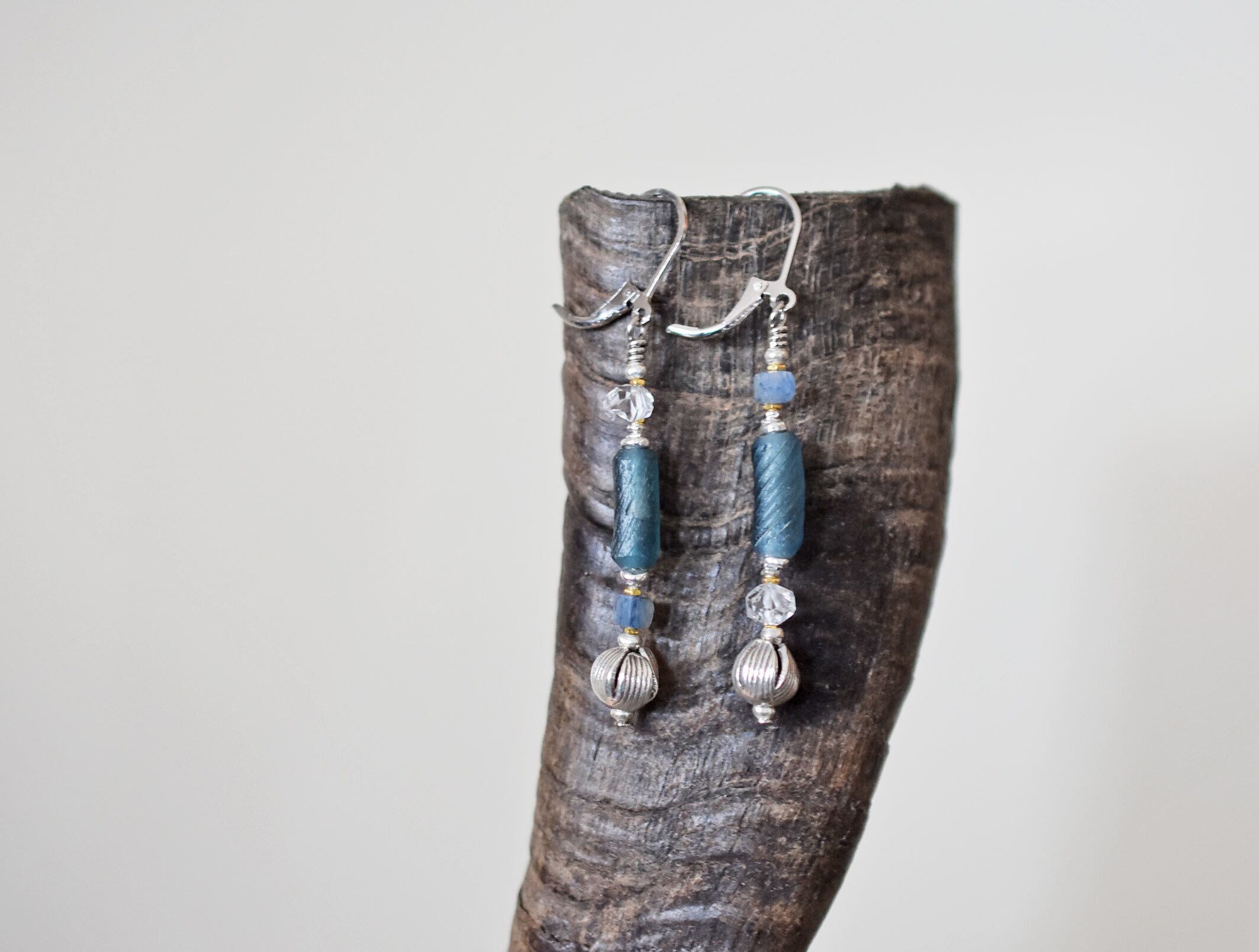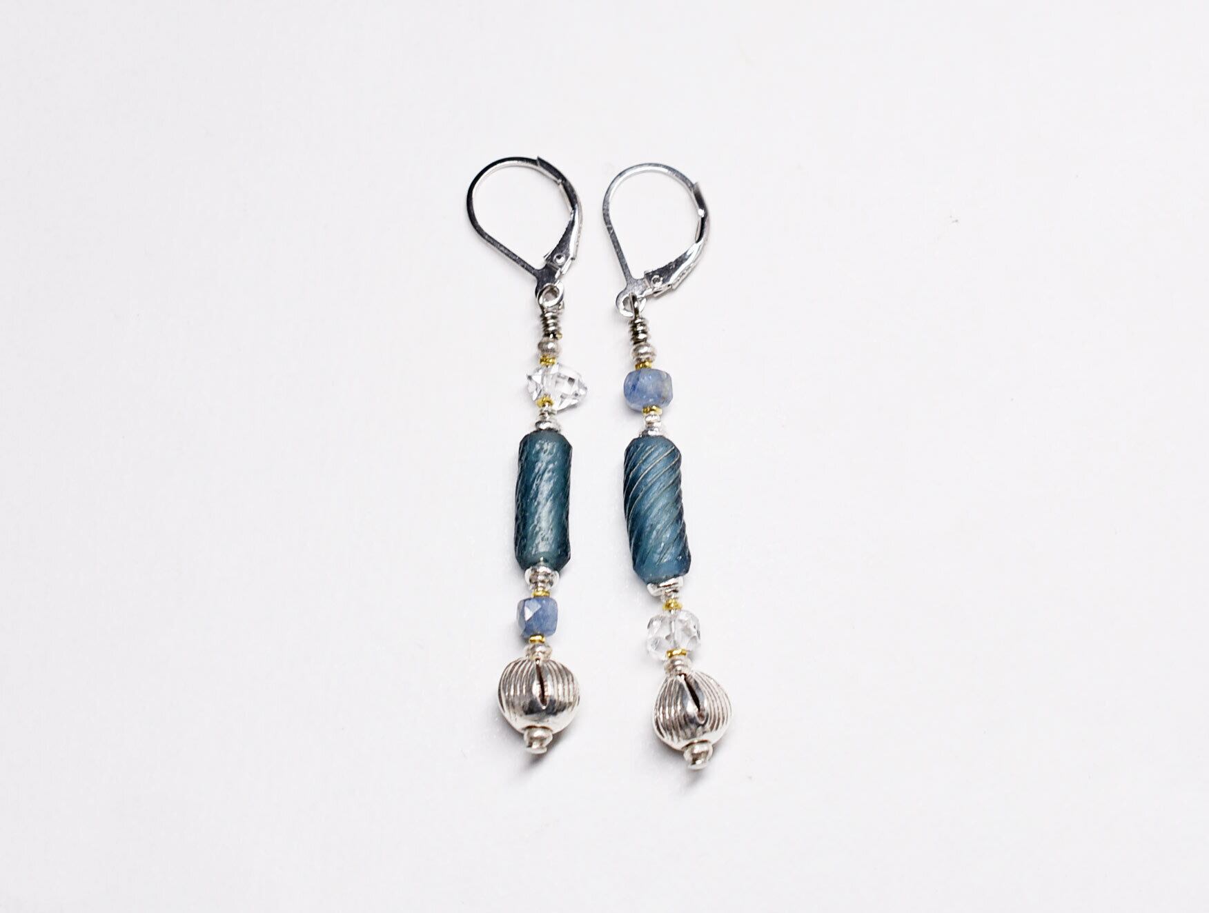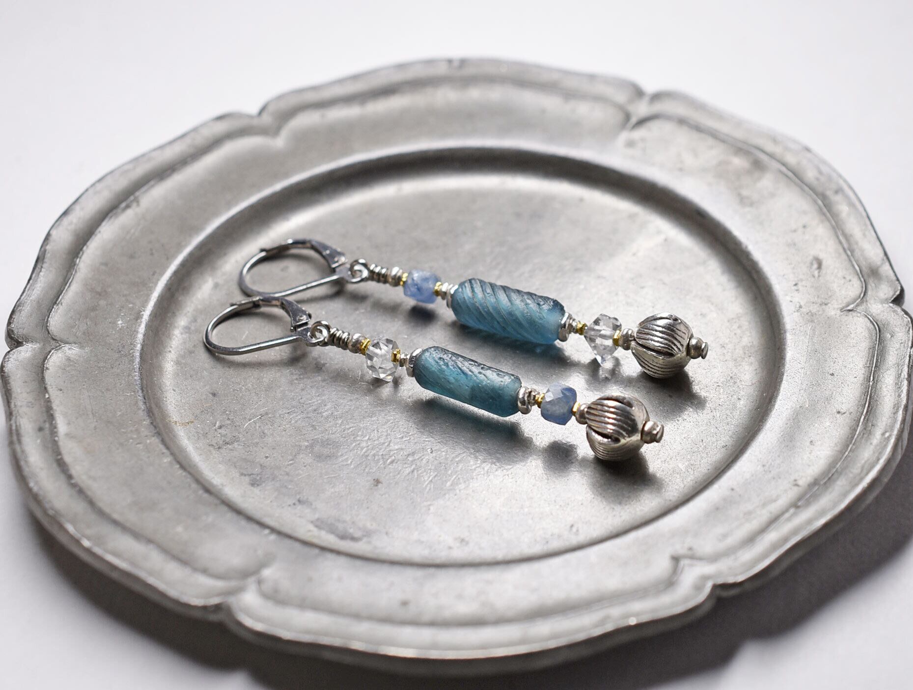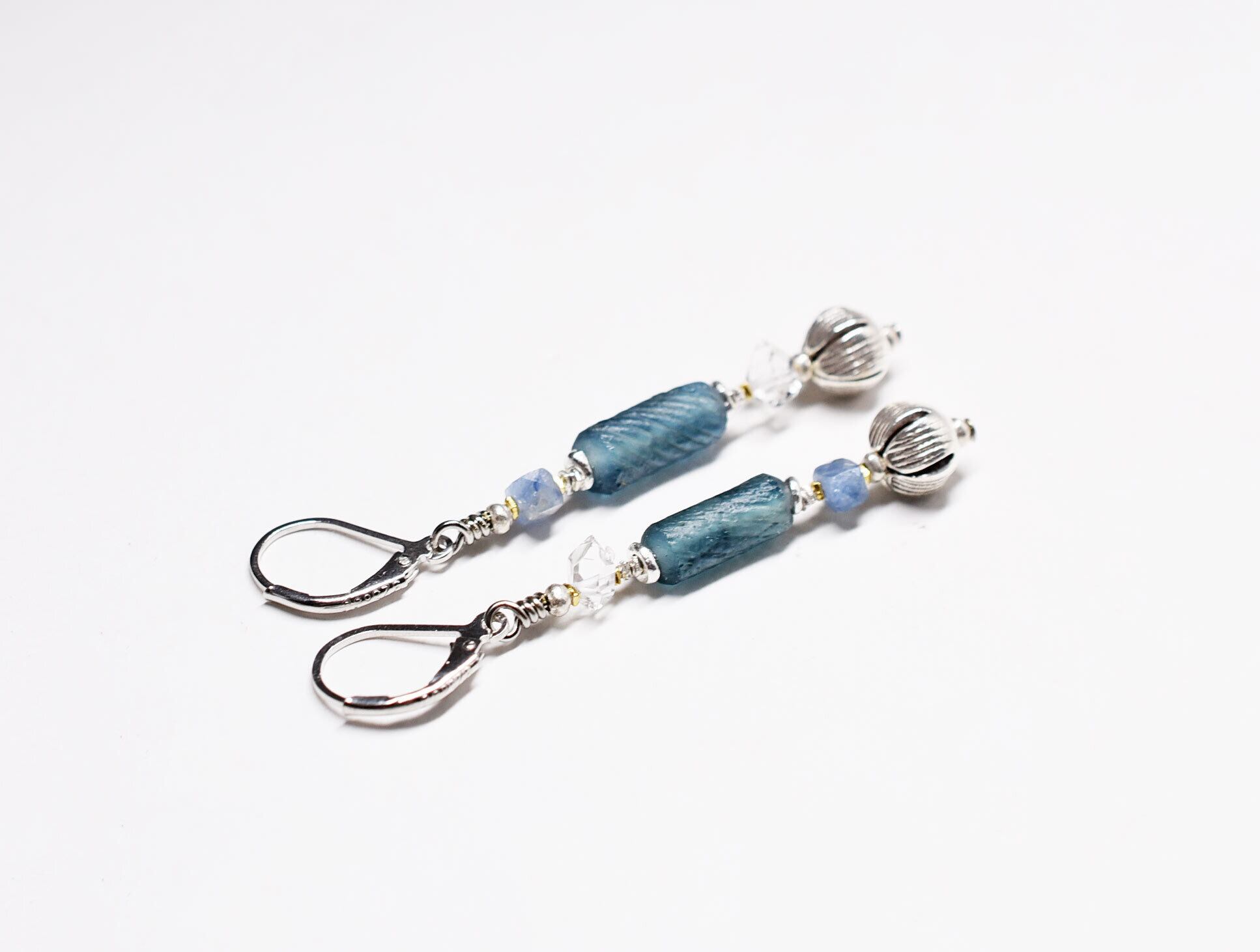 ローマングラスとハーキマーダイヤモンド、カイヤナイト、カレンシルバーを繋いだ少しアンシメトリーなピアスです。