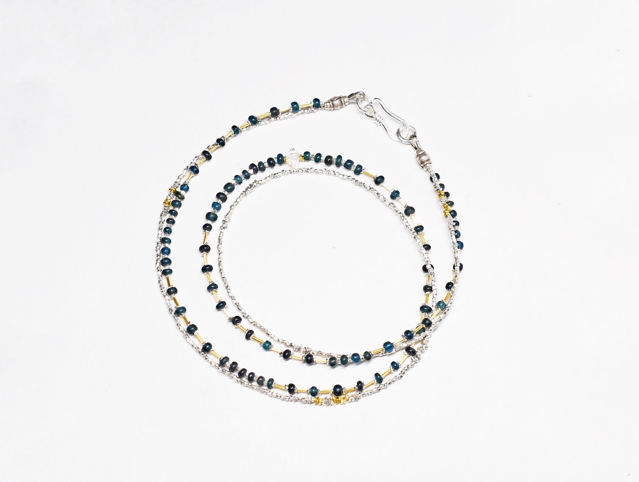 インディゴブルーとシルバー、ゴールドのコントラストがとてもシックでありながら、キラキラと輝き華やか印象もある、とても華奢なネックレスです。