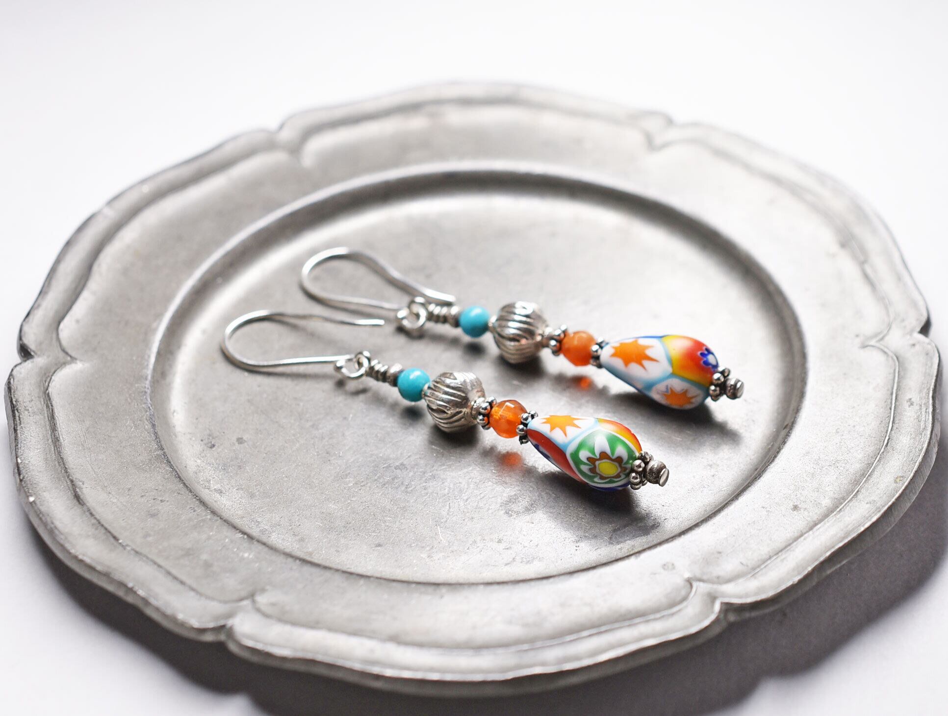 雫型ミルフィオリと蕾カレンシルバー、ファイアーアゲートターコイズのピアス