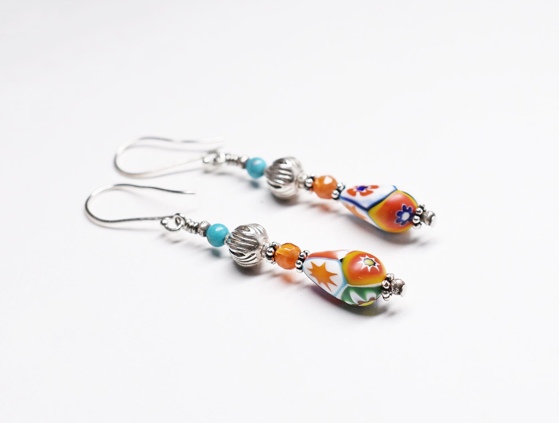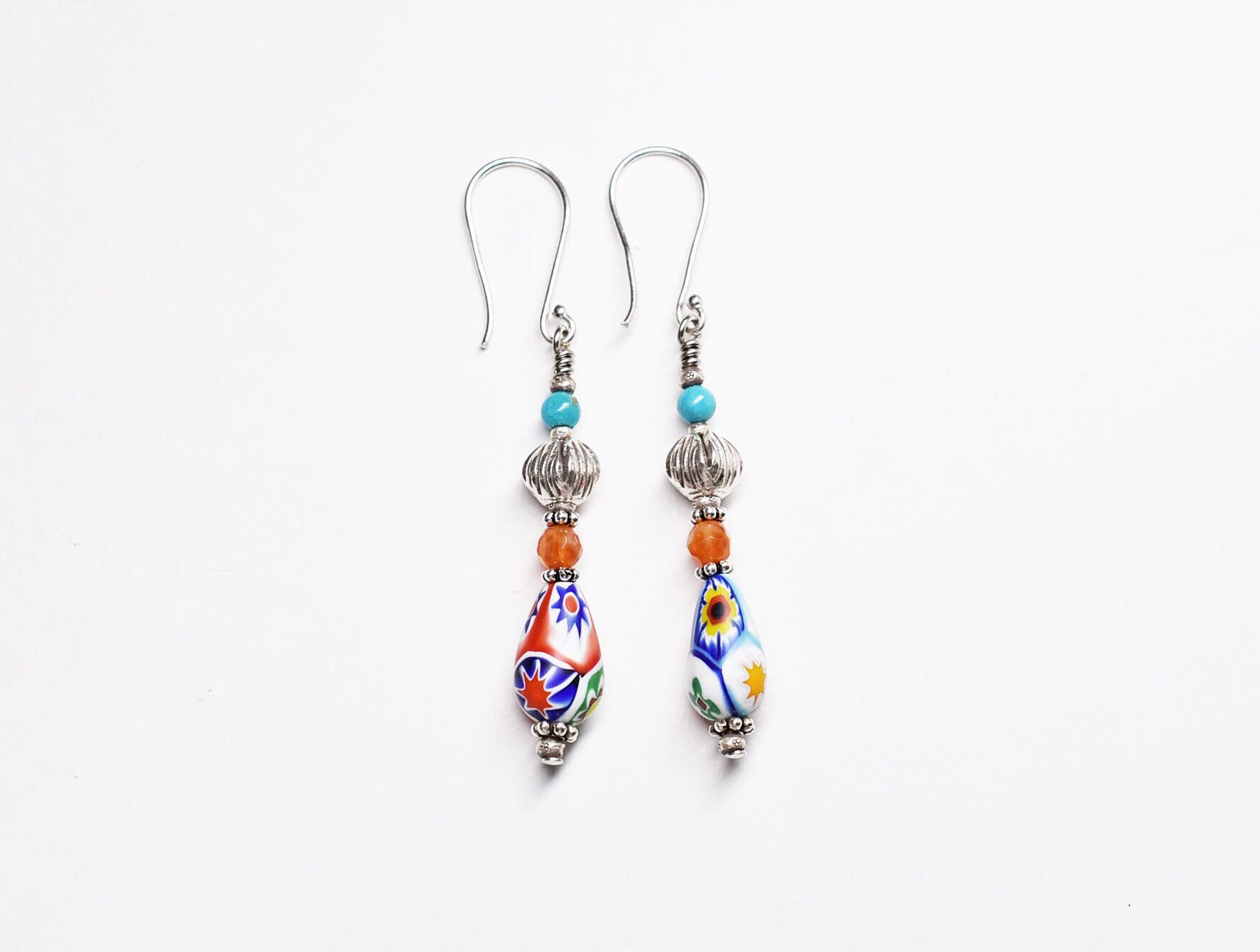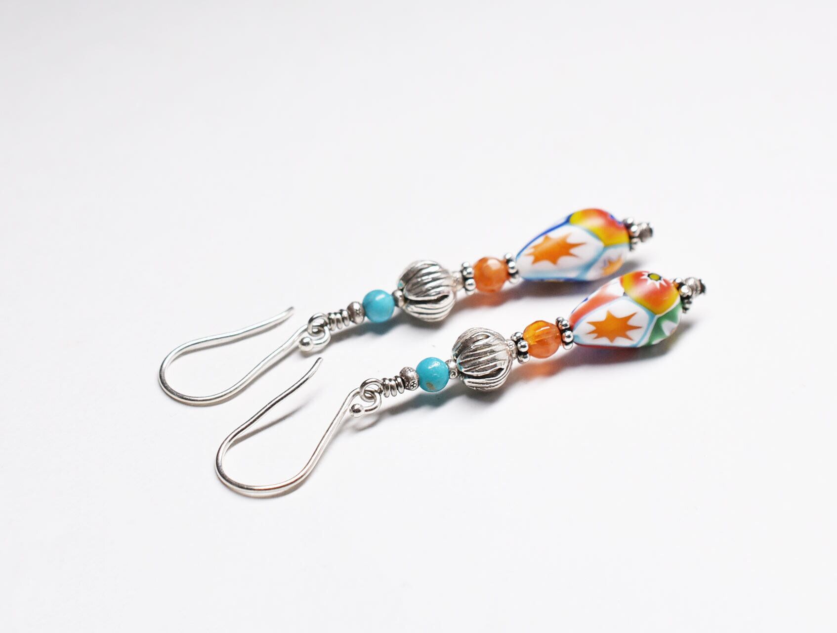 ミルフィオリビーズとカレンシルバー、ファイアーアゲートとターコイズを繋いだピアスです。