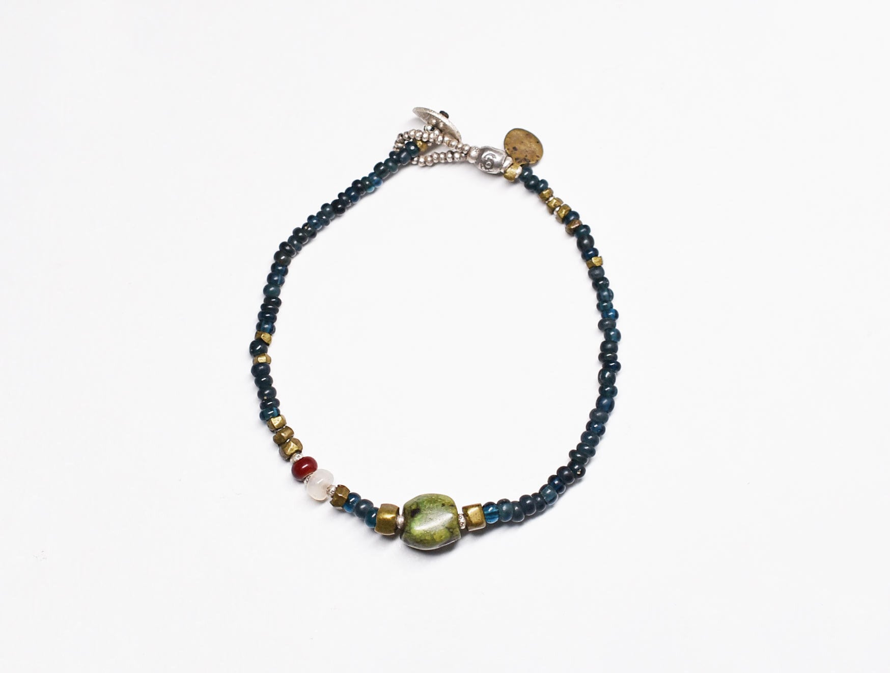 oldチベタンターコイズ、古代瑪瑙、血赤ホワイトハーツ、インディゴブルービーズ、oldオリッサブラスのブレス