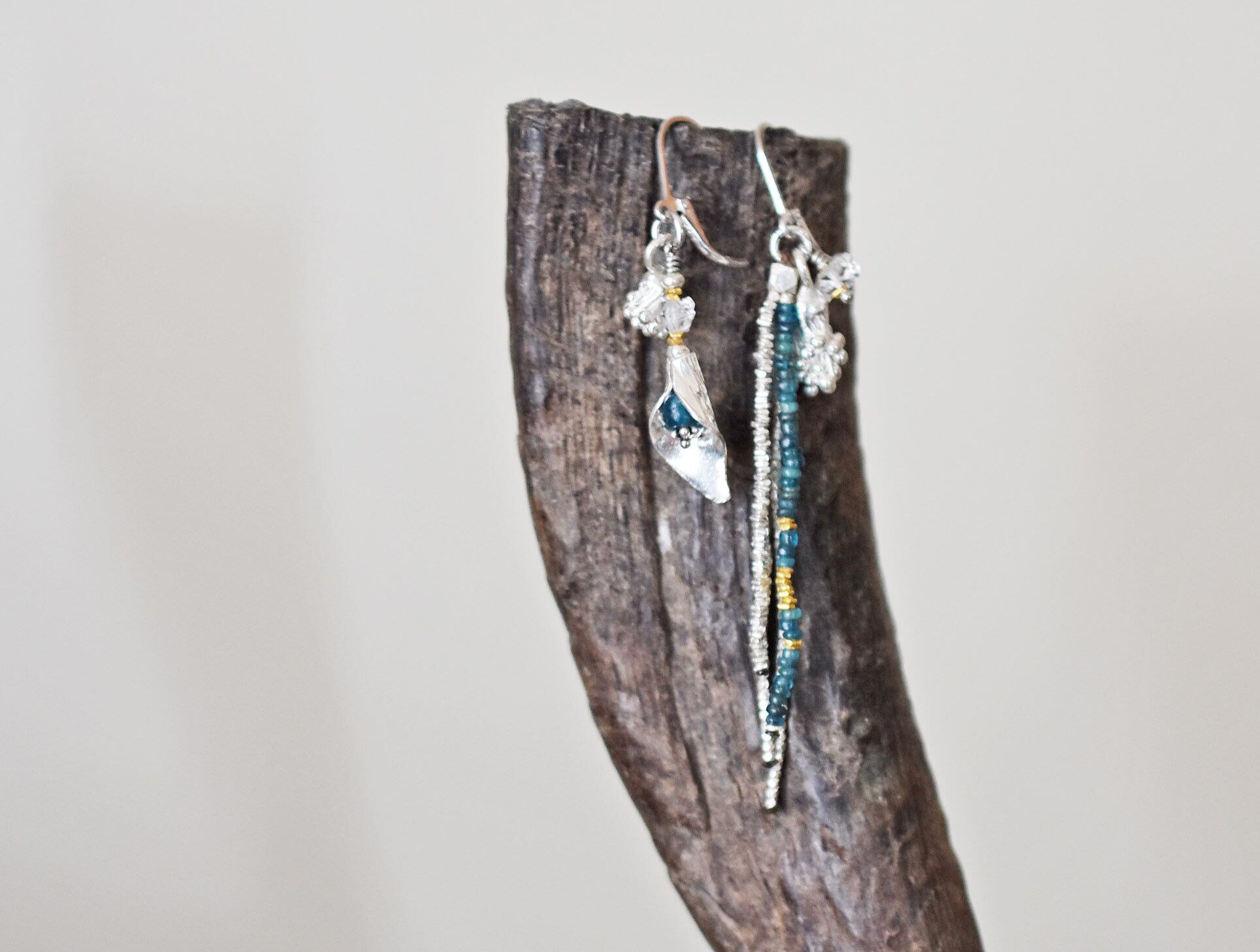カレンシルバーと、エメラルドグリーンのアンティークビーズ、ハーキマーダイヤモンドを繋いだピアスです。