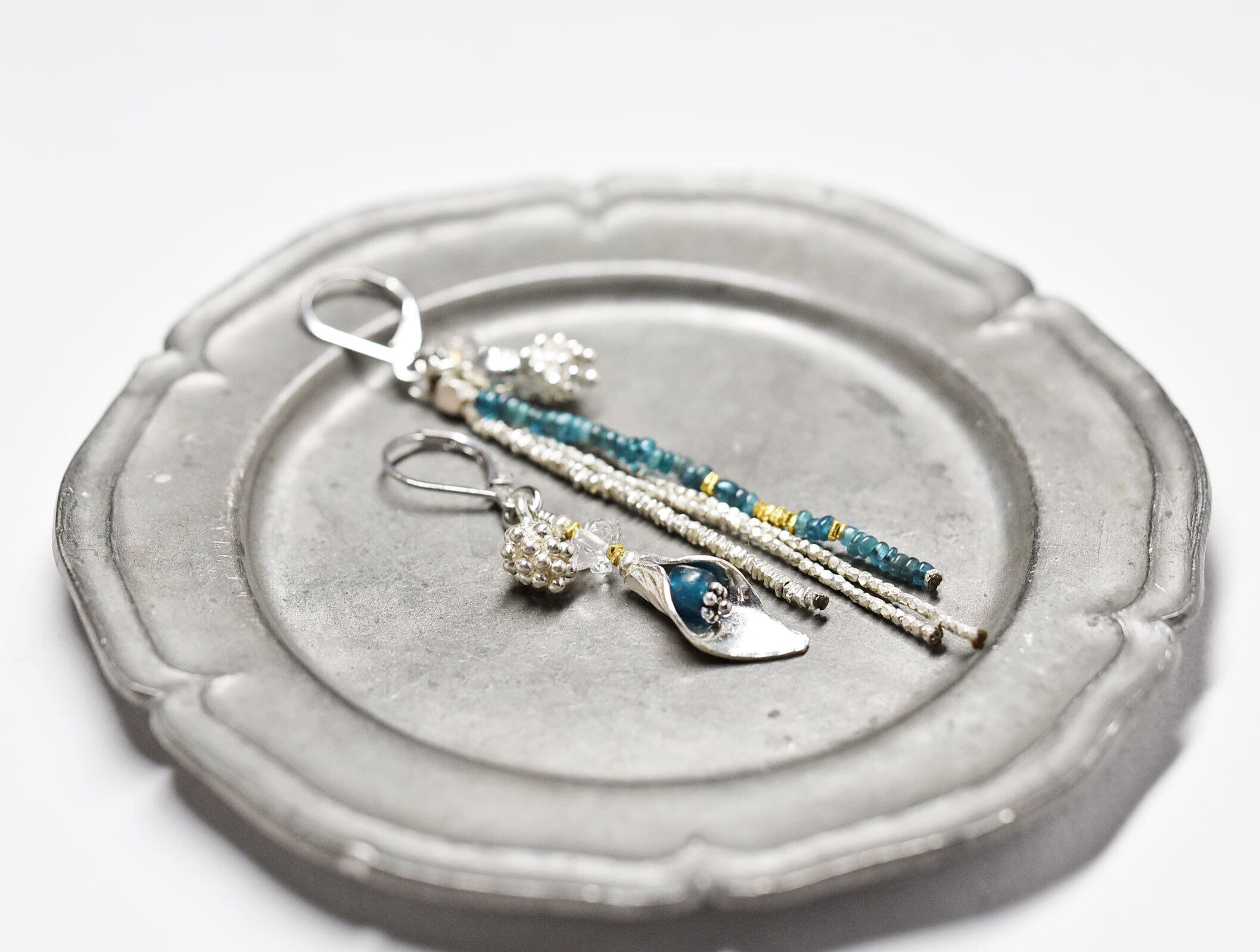 カレンシルバーの華やかさと、可愛らしさ、そしてアンティークビーズの味わいが楽しめるアンシメトリーなピアスです。