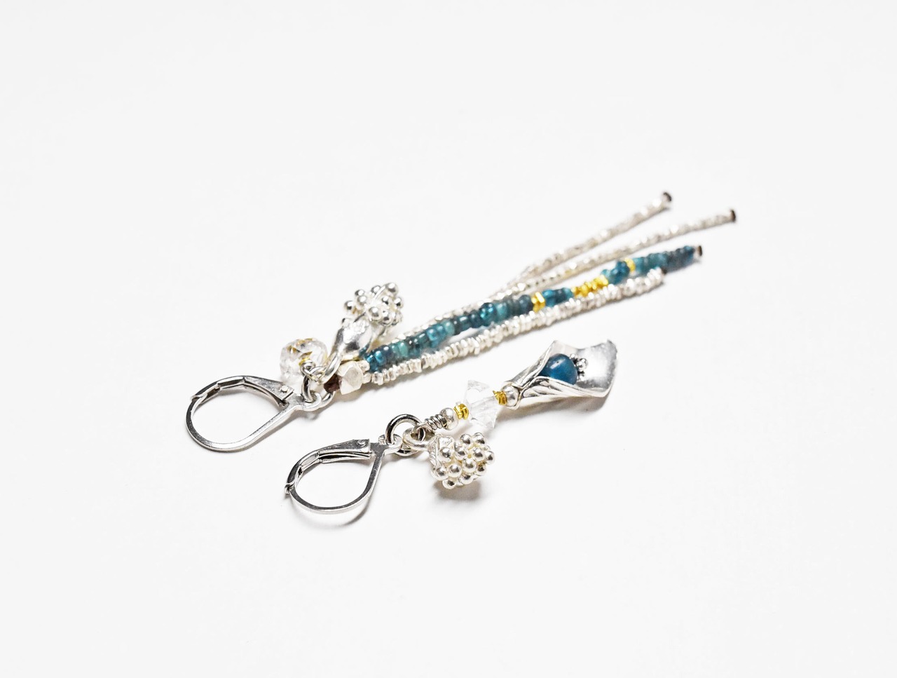 ハーキマーダイヤモンド、ボタニカルカレンシルバーとエメラルドグリーン、煌めくカレンシルバービーズのピアス