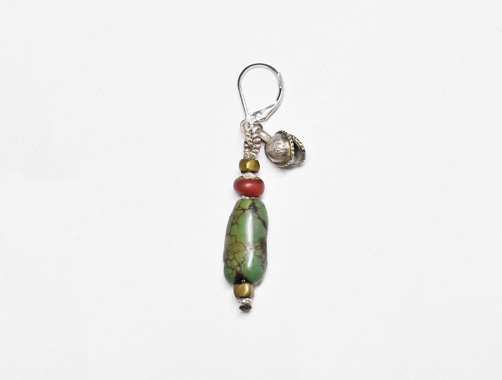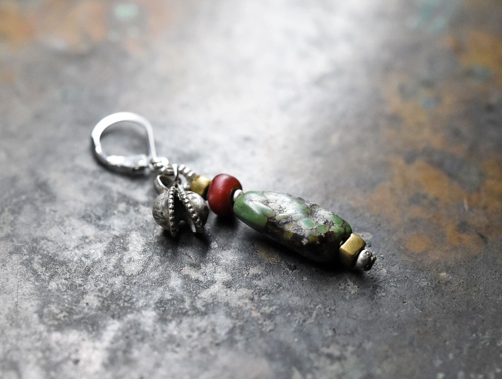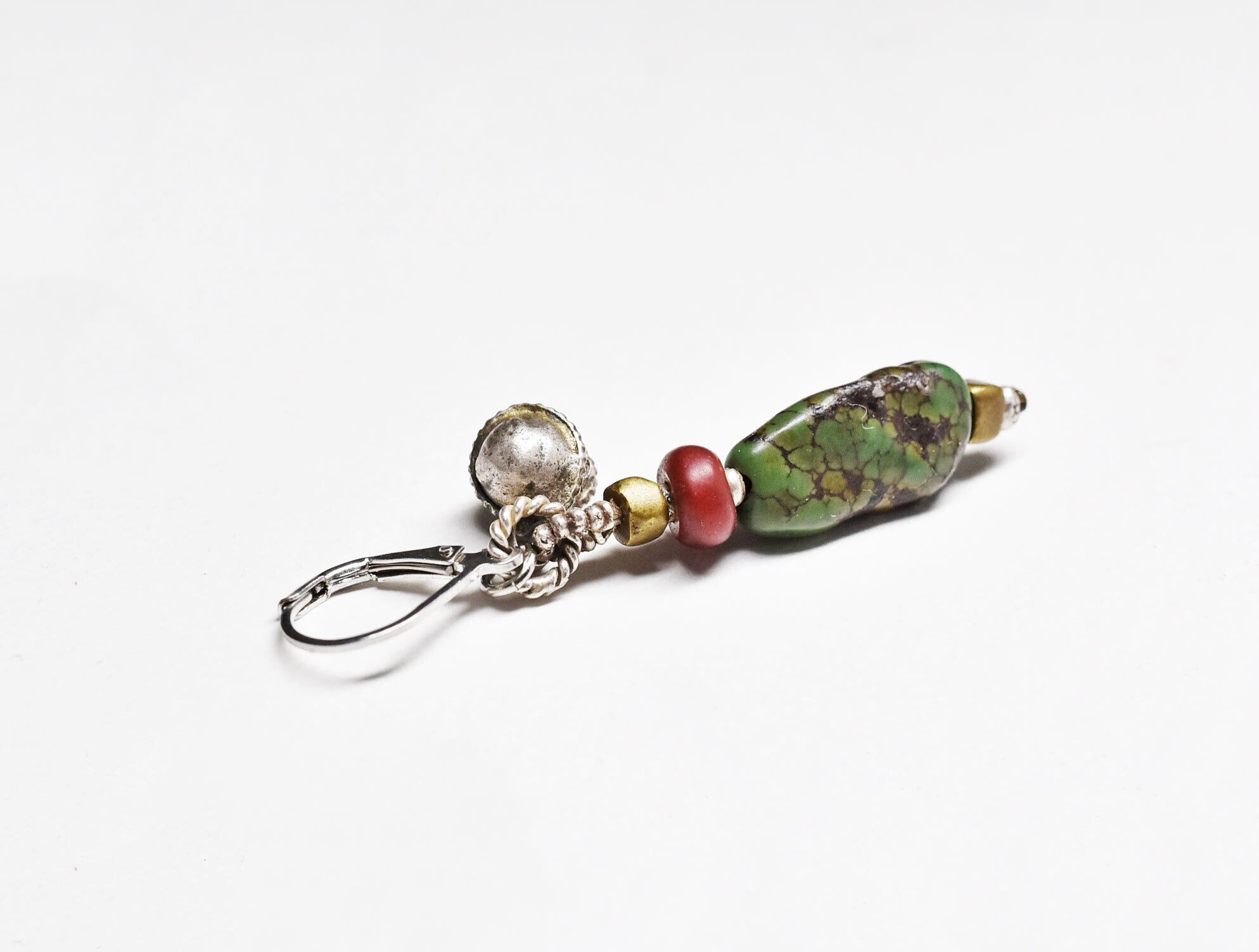 oldチベタンターコイズと金赤ホワイトハーツ、oldオリッサブラス、oldアフガンシルバーベルの片耳ピアス | ais...