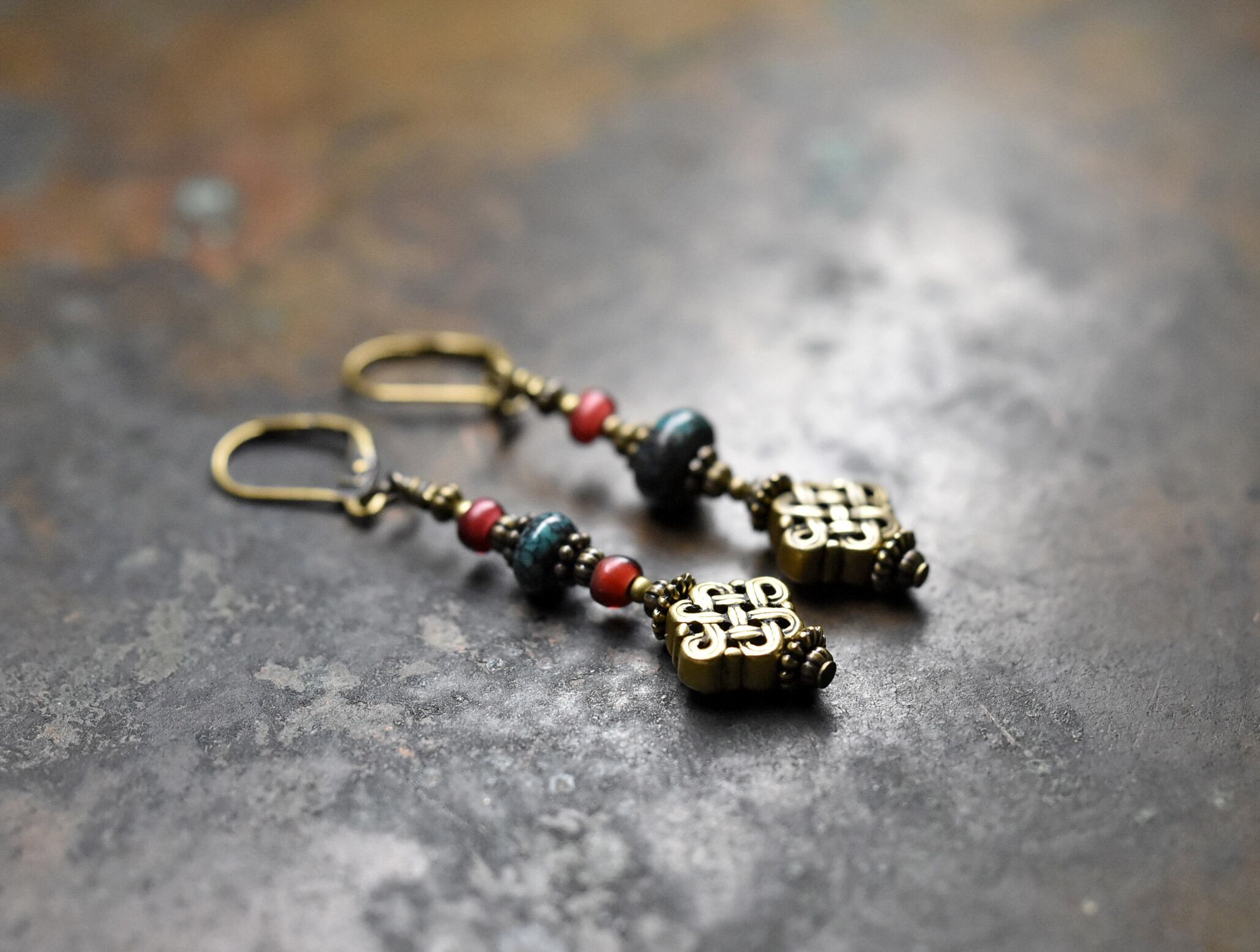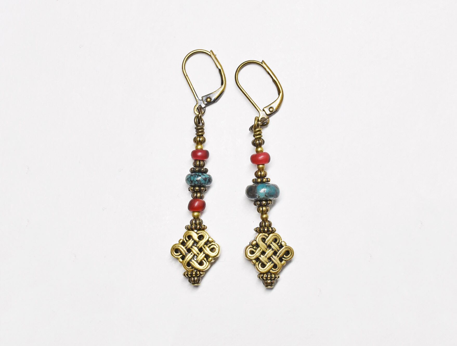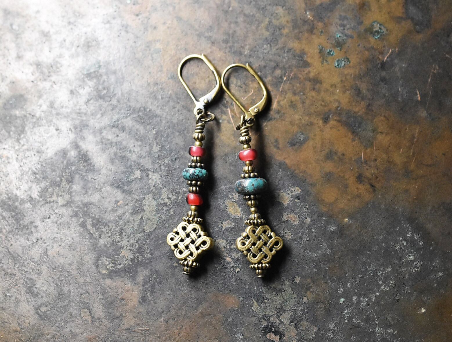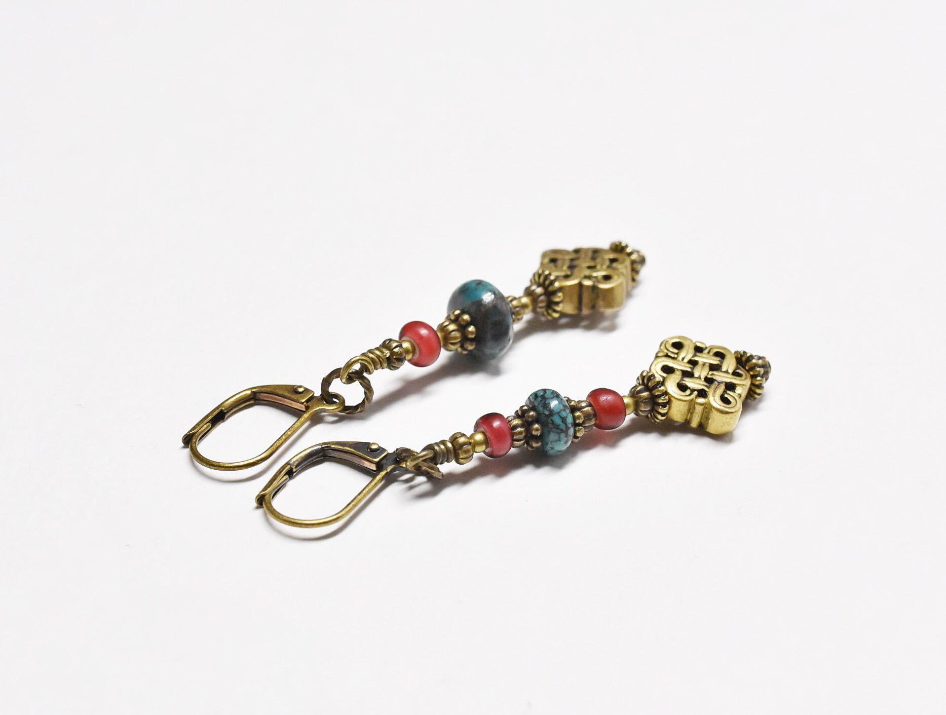 真鍮製のエンドレスノットと、ディスク型のターコイズ、金赤色のホワイトハーツを繋いだピアスです。