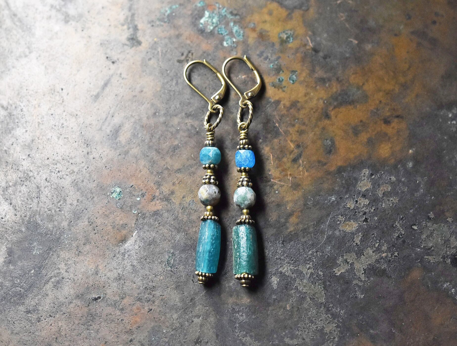 ブルーグリーンローマングラスとアインディアンアゲート、アパタイトのピアス