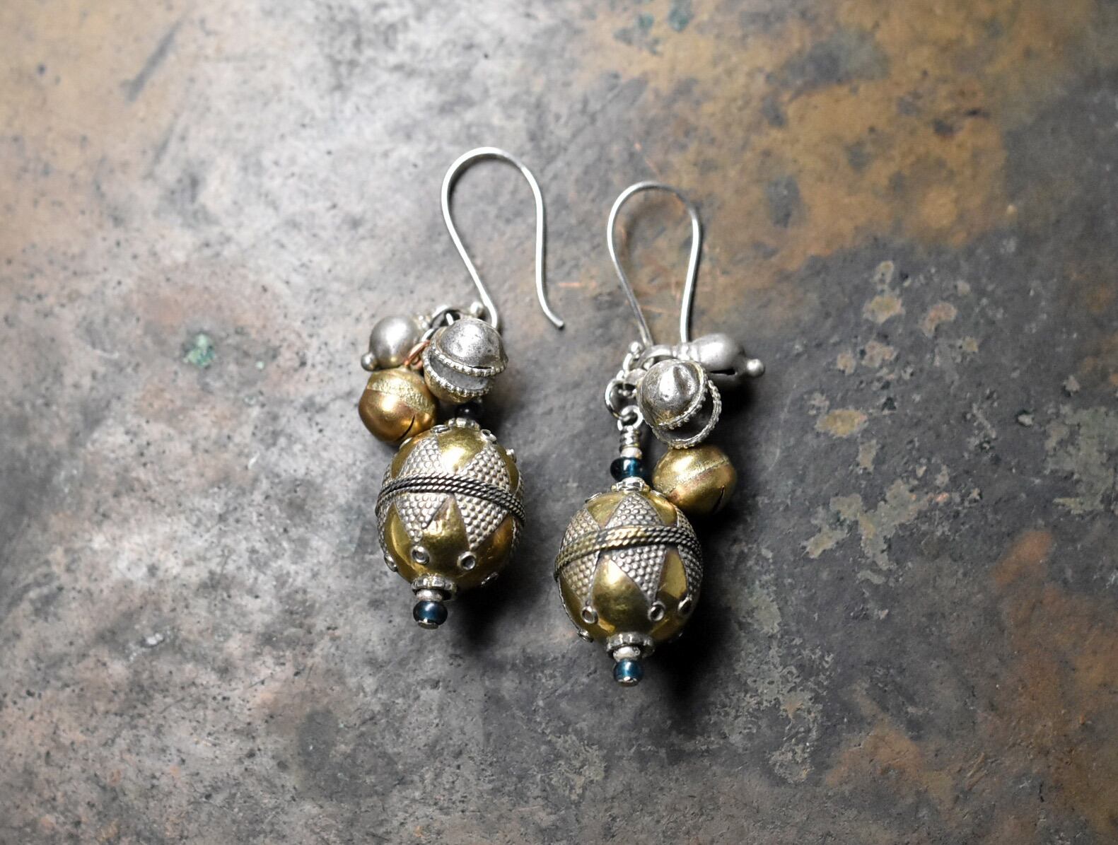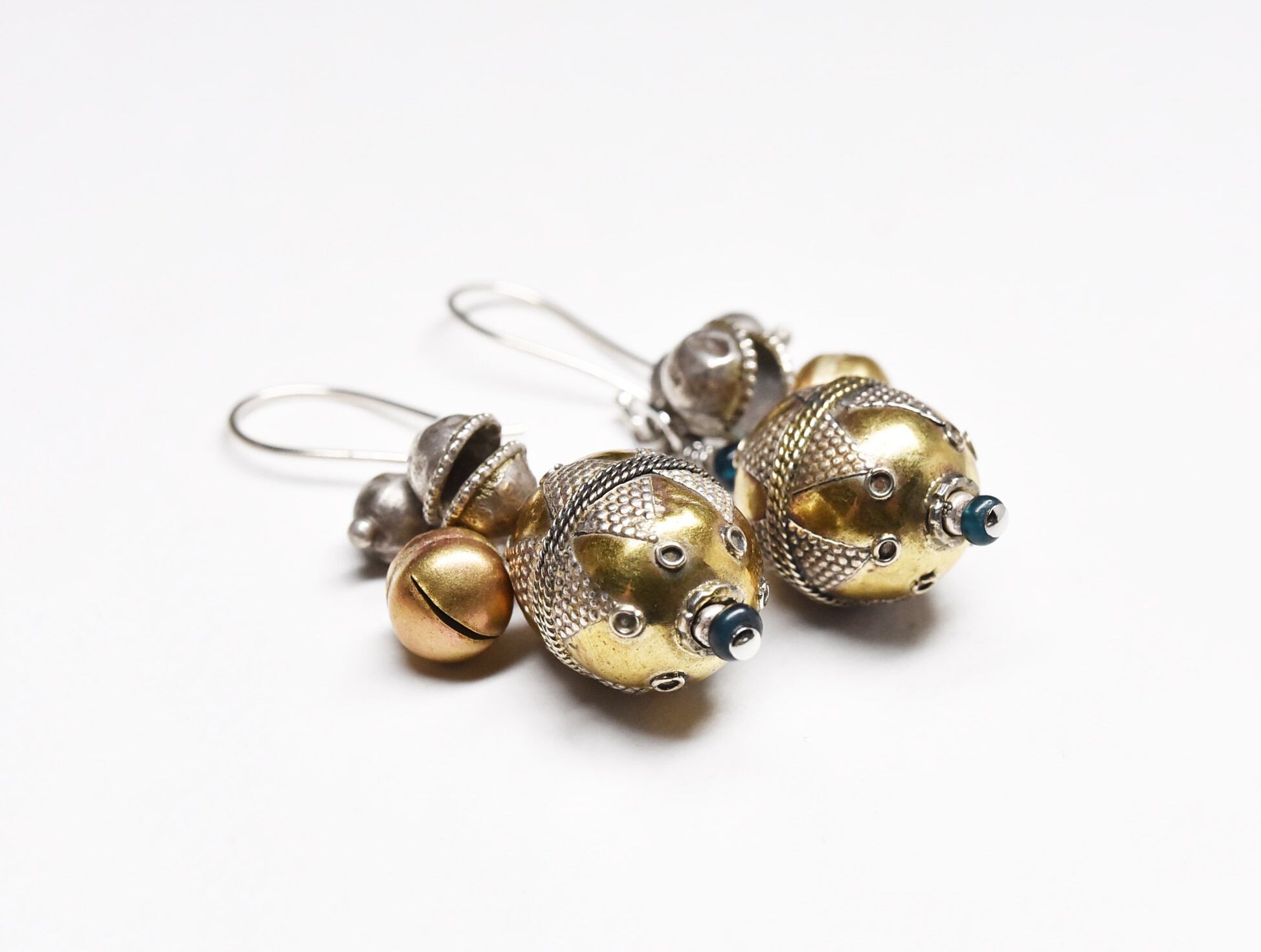 トルクメニスタンから届いたメタルビーズにアンティークビーズとベルや鈴を繋いだピアスです。