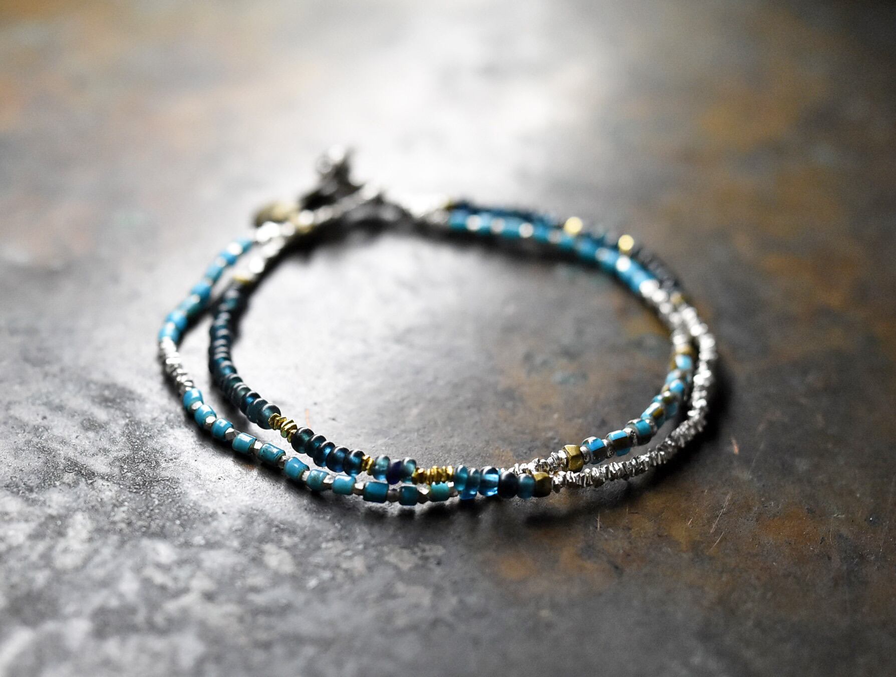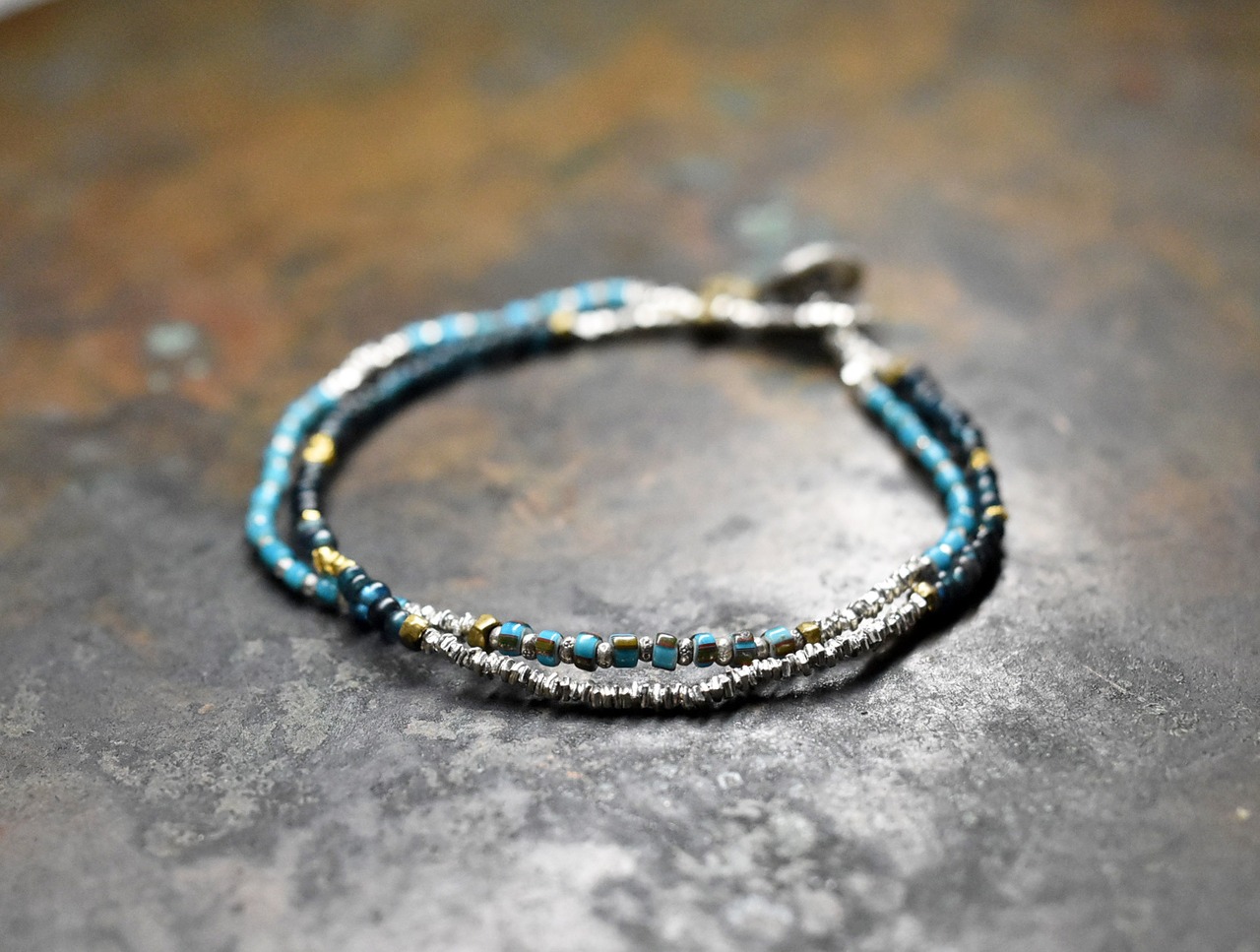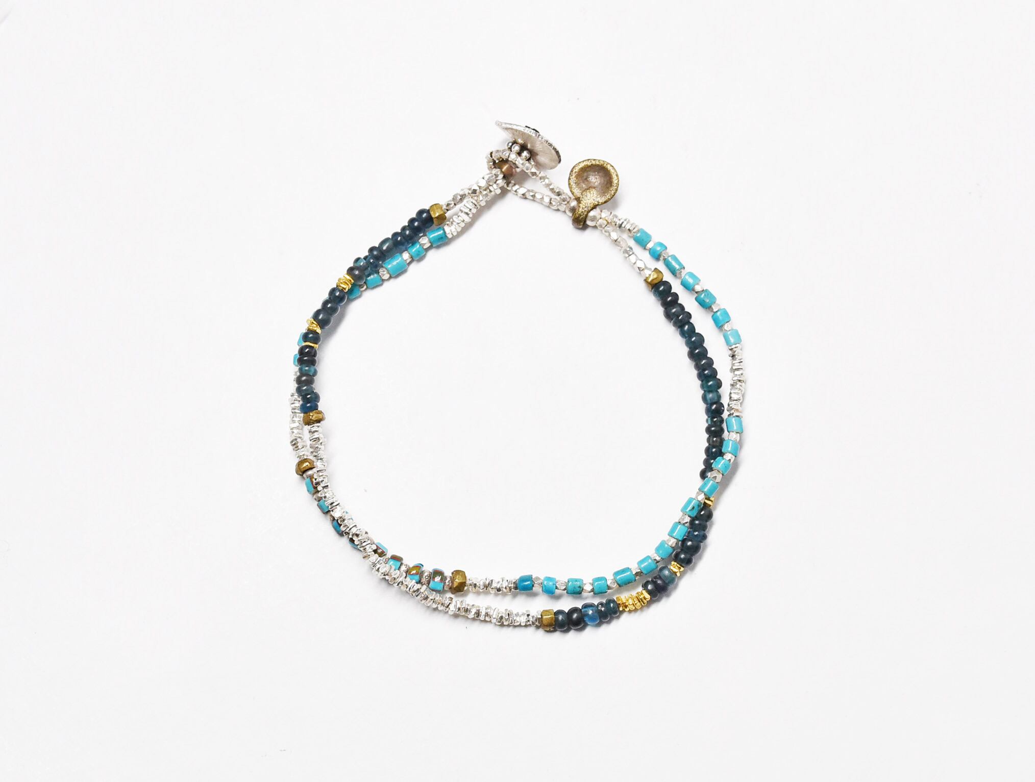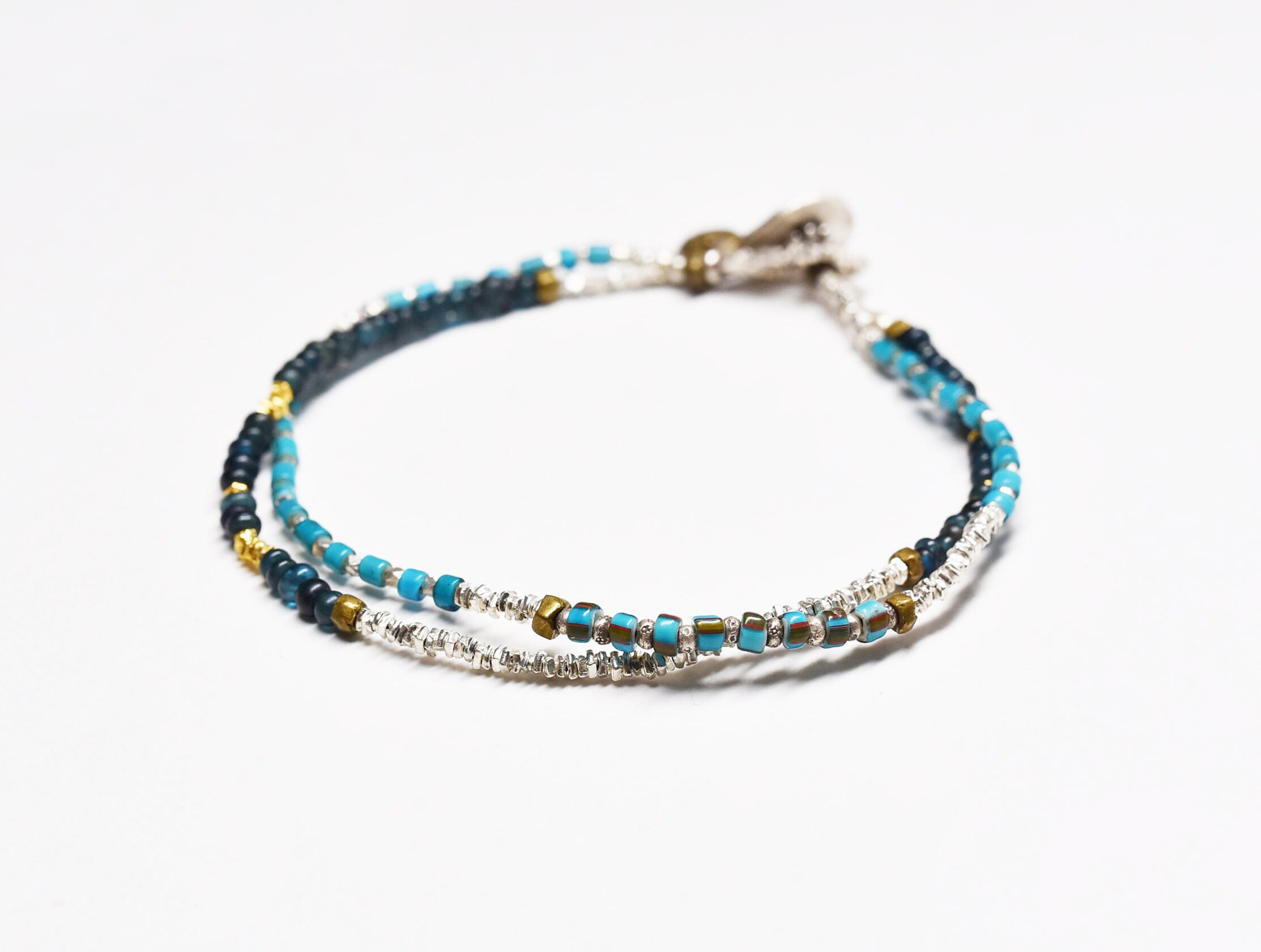 インディゴブルービーズ、ターコイズブルーのホワイトハーツとカレンシルバーの2連ブレス