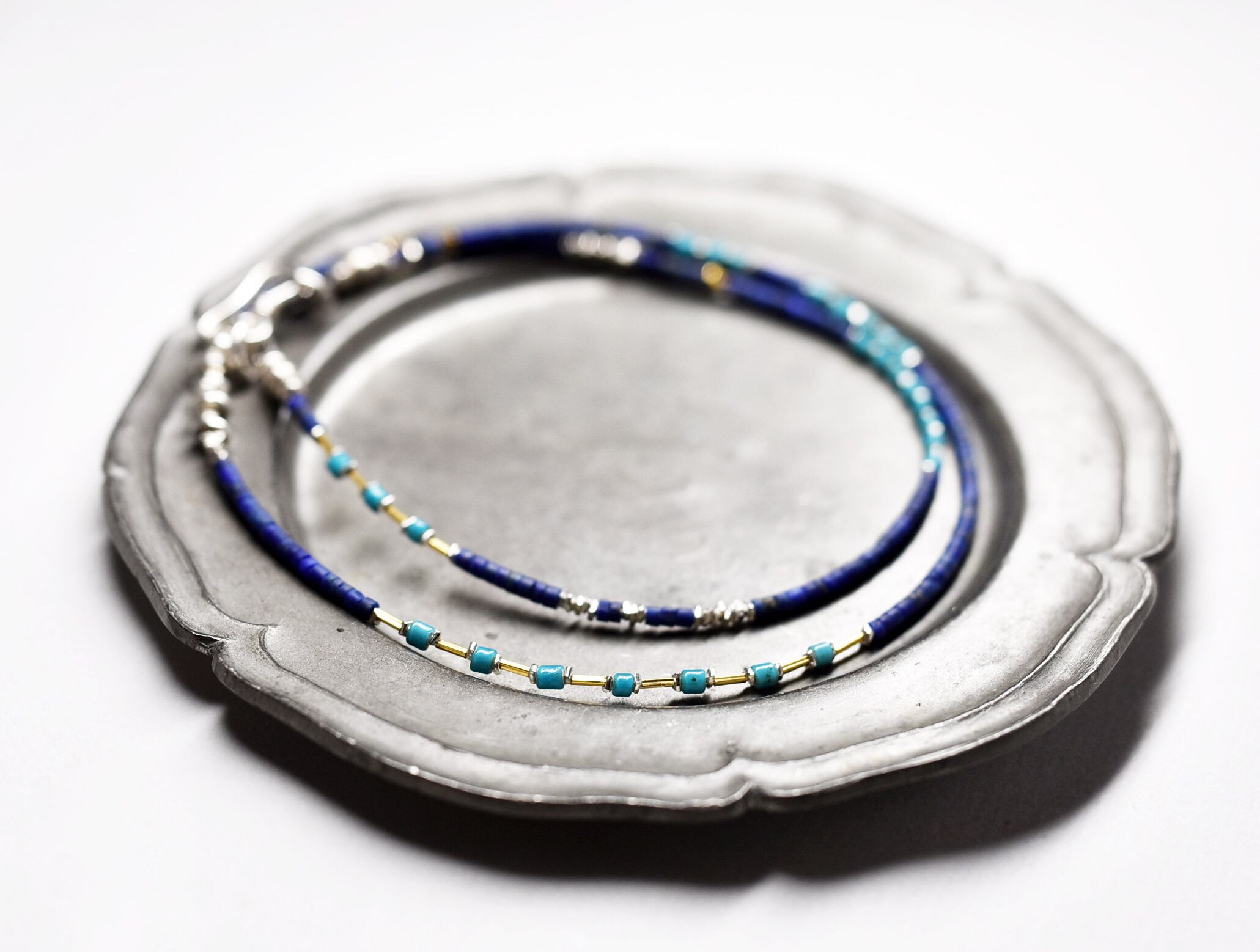 小さなラピスとターコイズブルーホワイトハーツ、カレンシルバービーズの華奢なネックレス