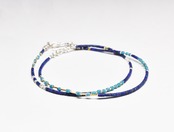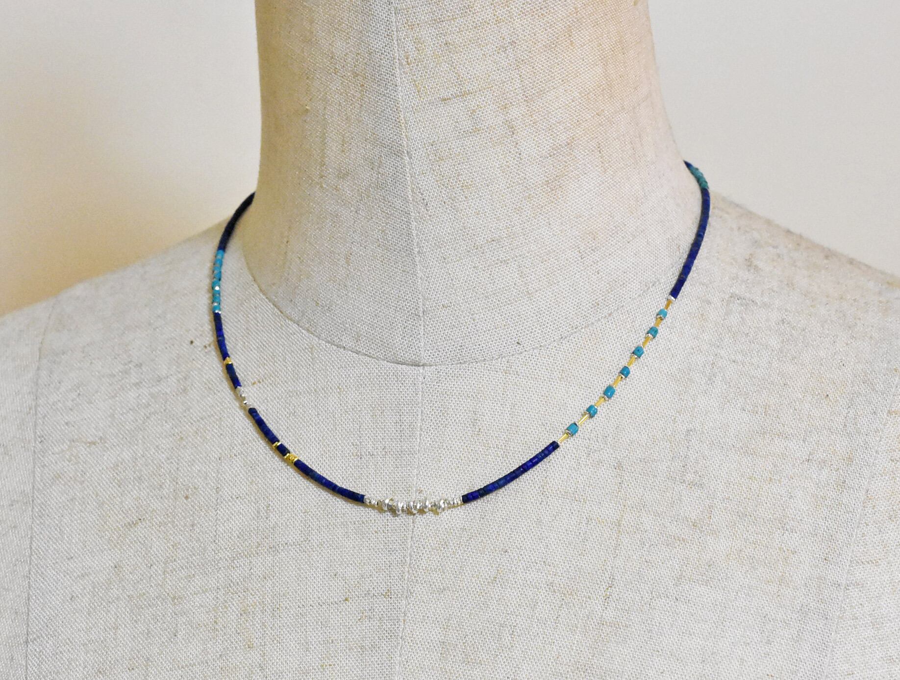 とっても小さなラピスラズリと、ターコイズブルーのホワイトハーツ、色んなカレンシルバービーズを繋いだネックレスです。