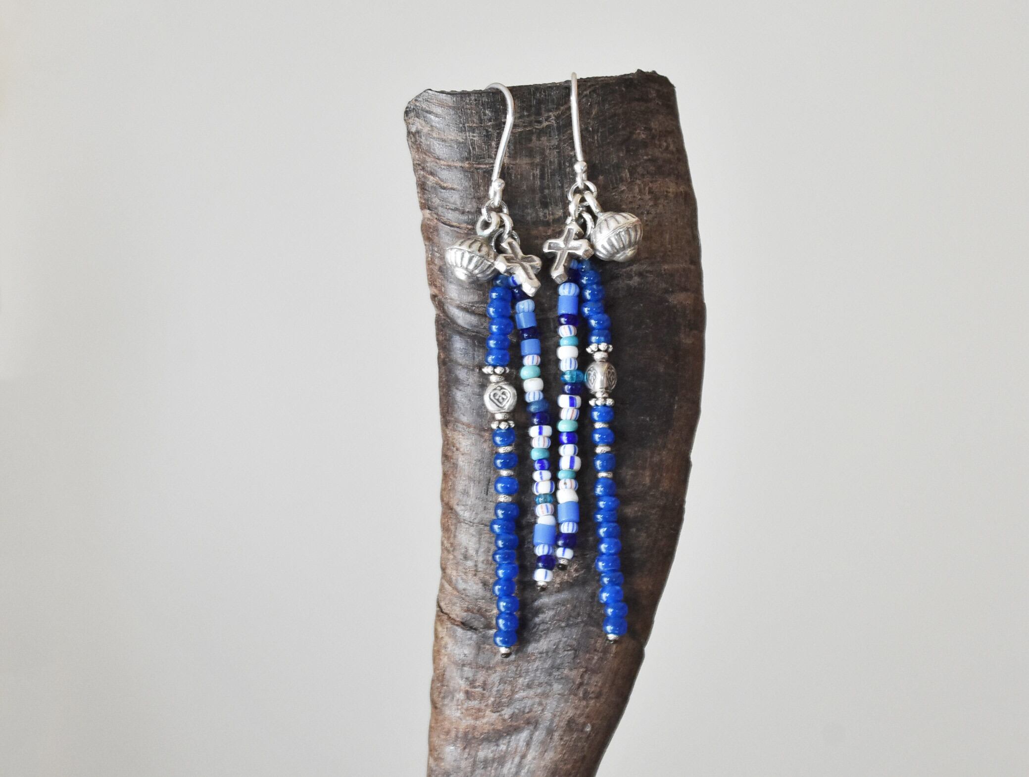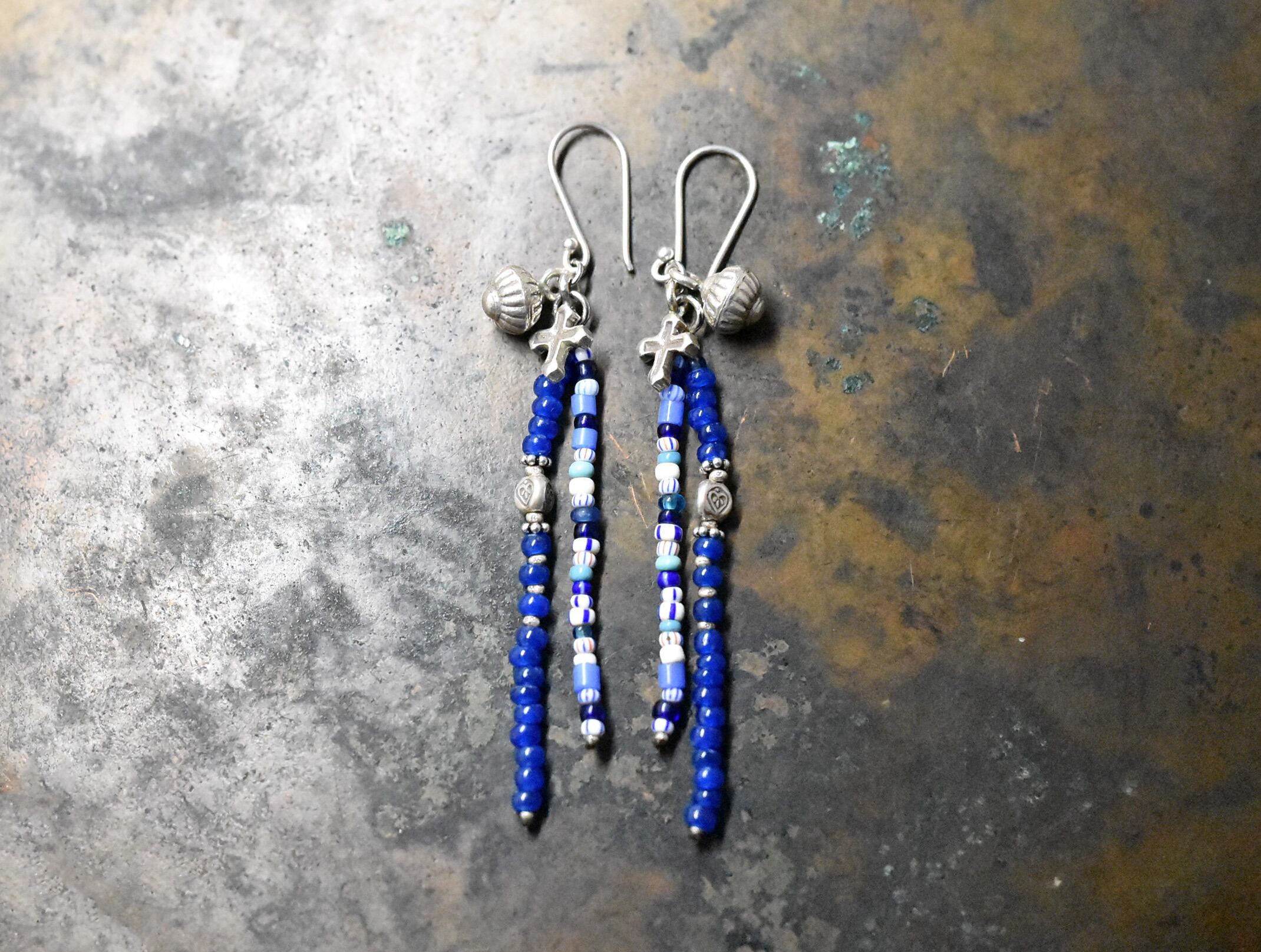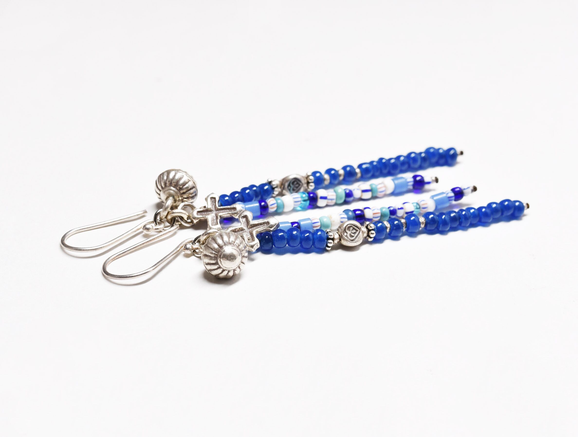 三角形に、ハートの刻印が施されたカレンシルバービーズをセルリアンブルービーズの間に入れています。