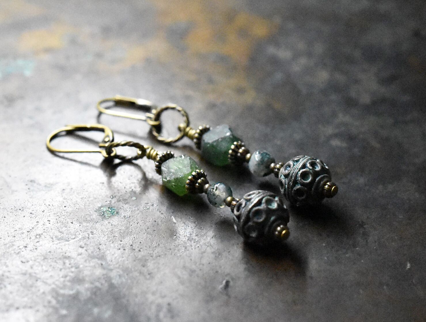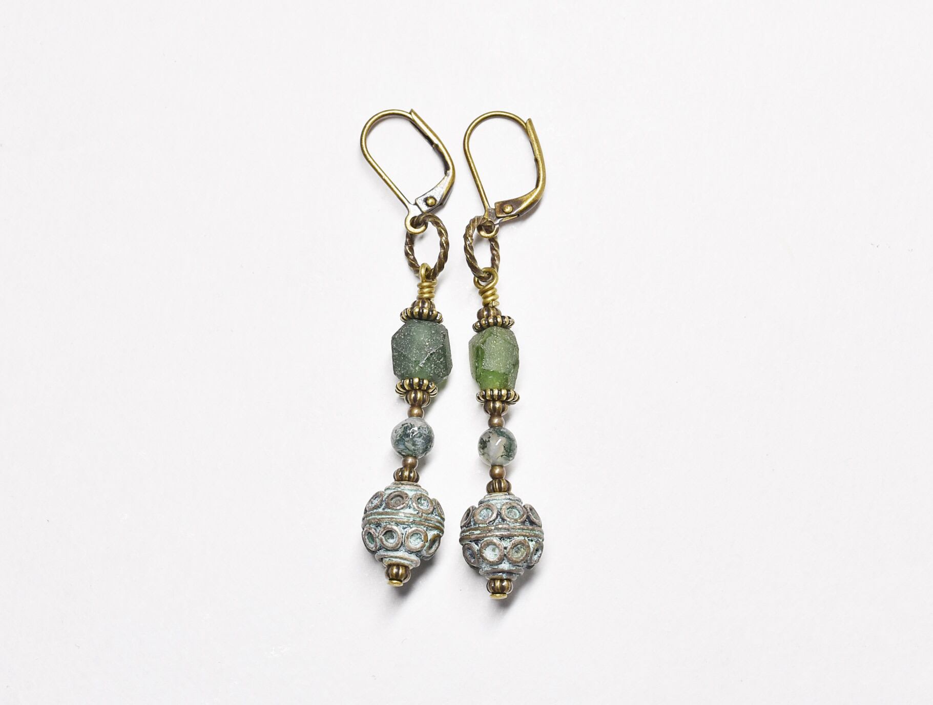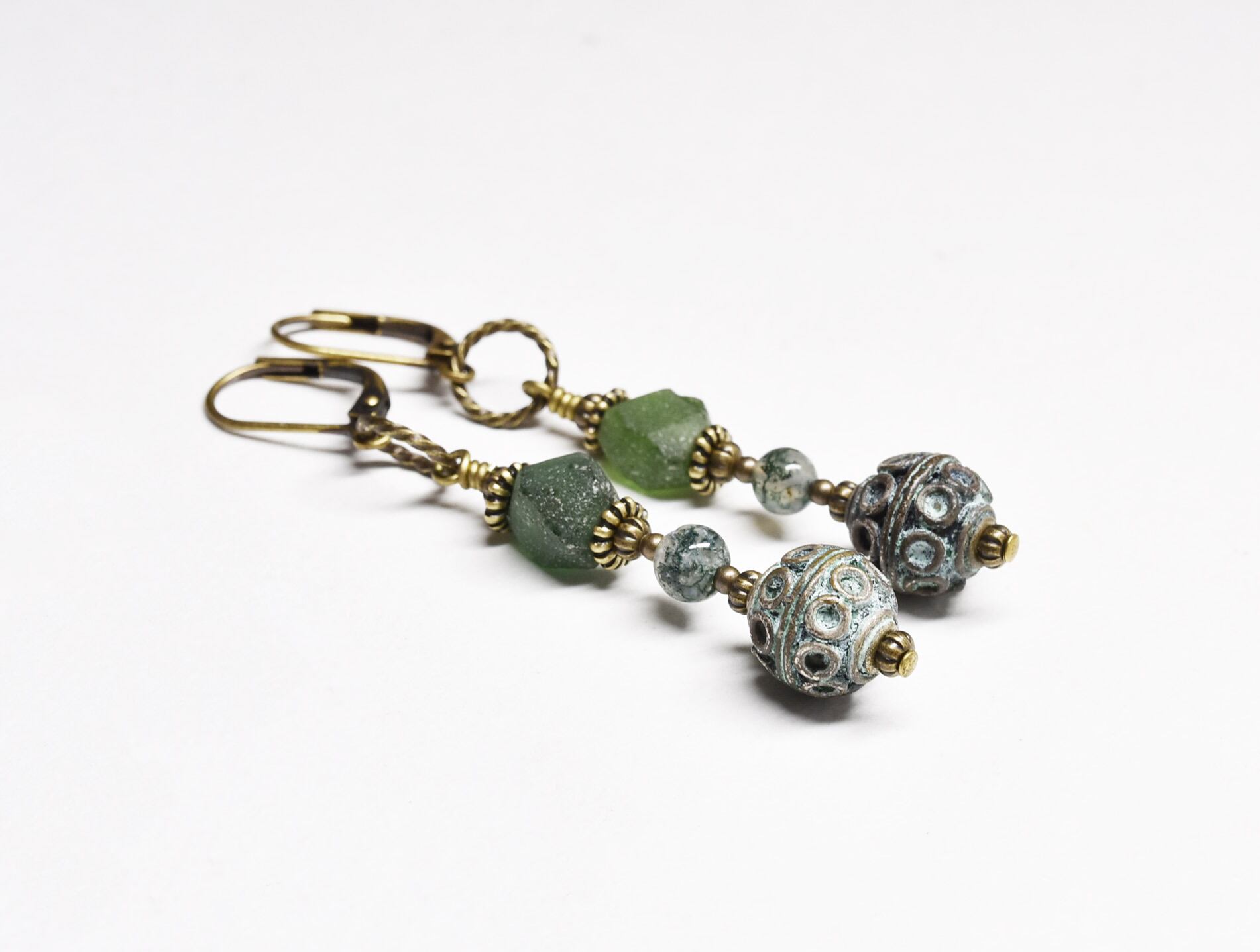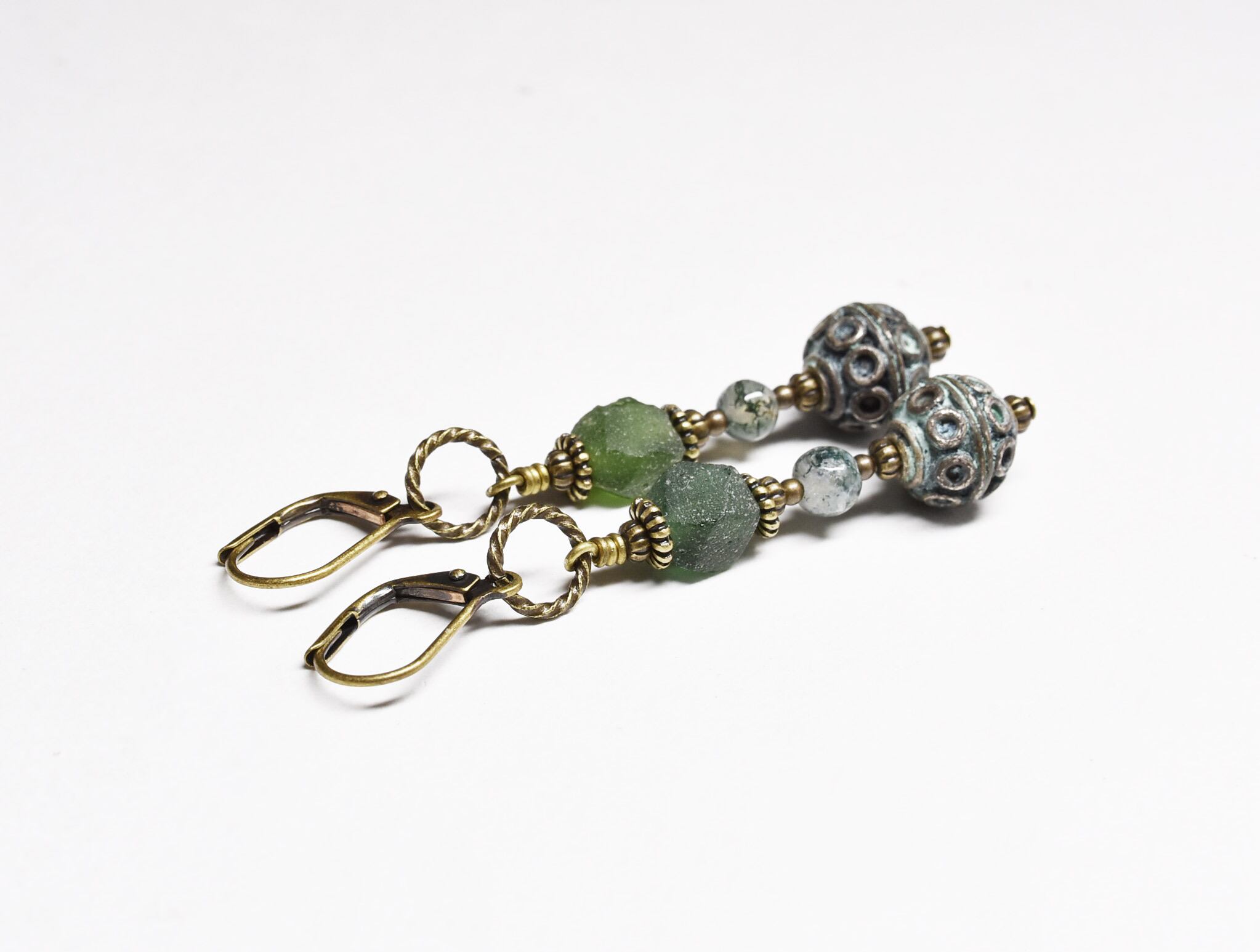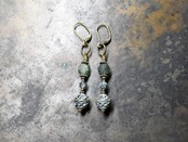 アフガニスタンのメタルパーツと、インディアンアゲート、ローマングラスを繋いだピアスです。