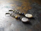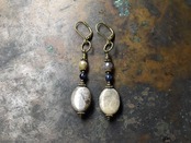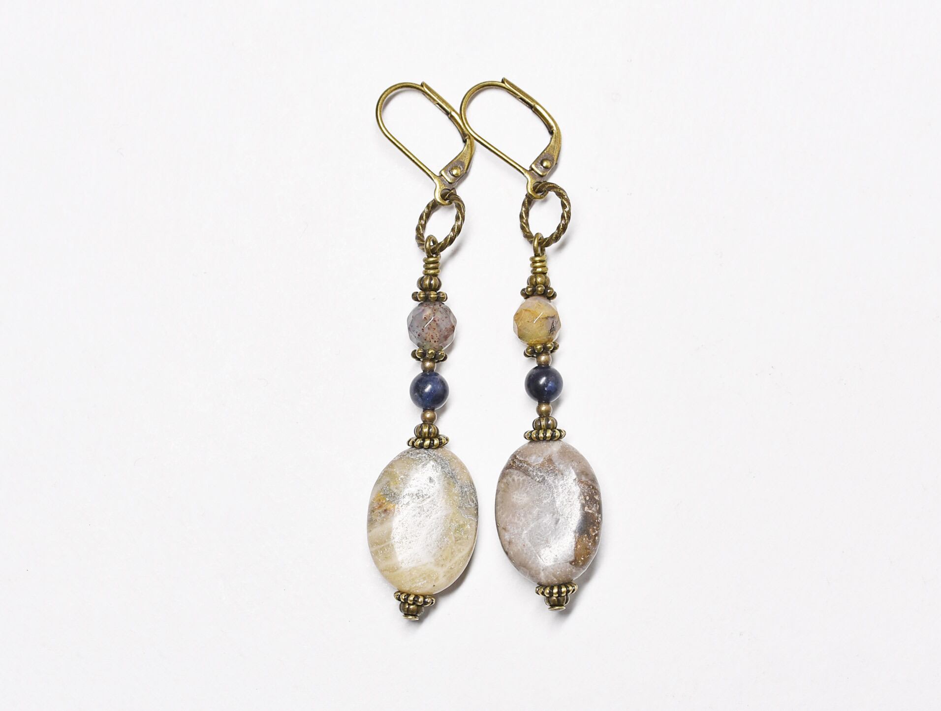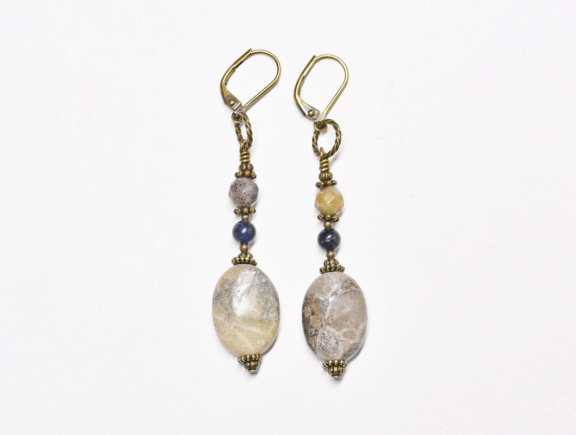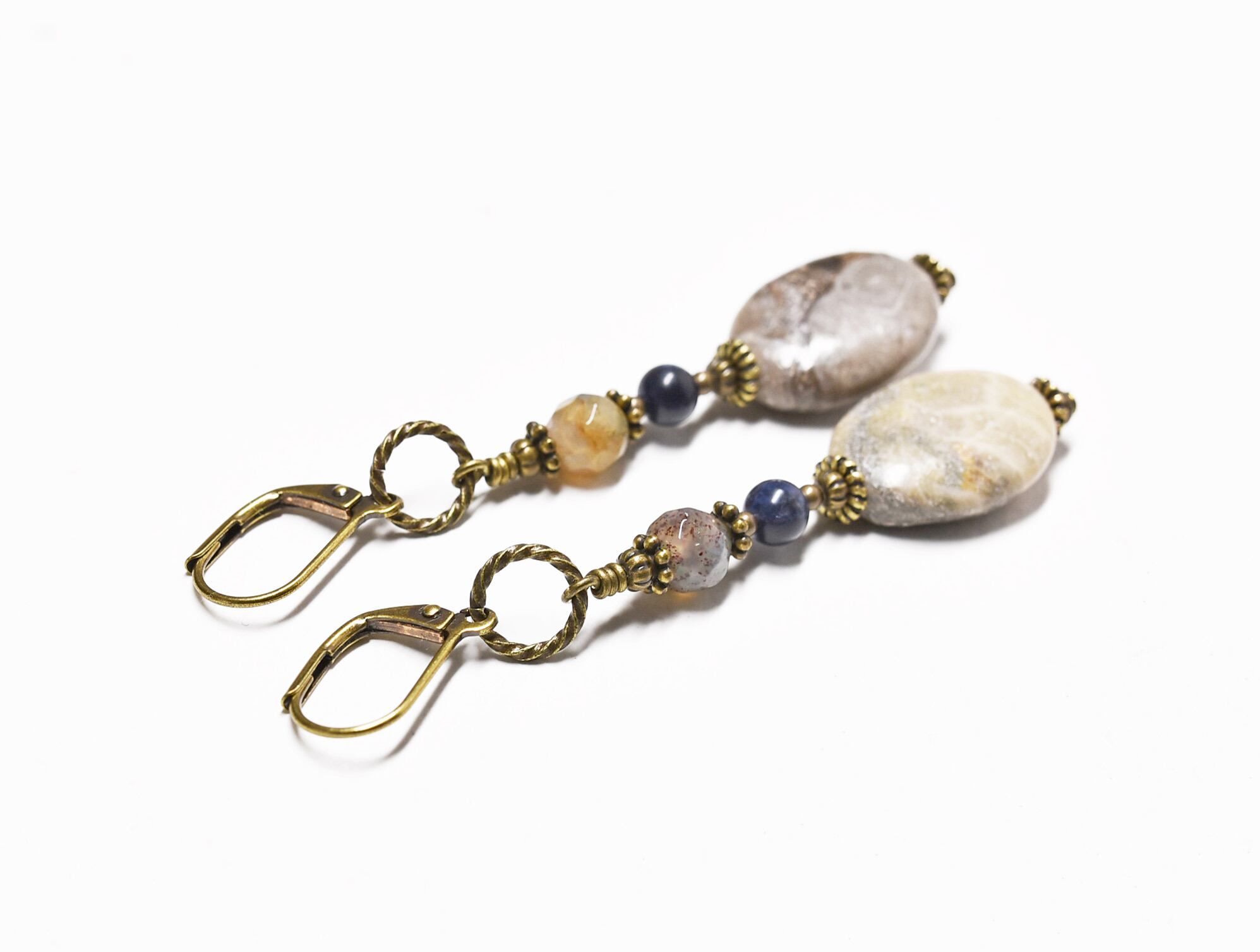 フォシルコーラルとソーダライト、インディアンアゲートを繋いだピアスです。