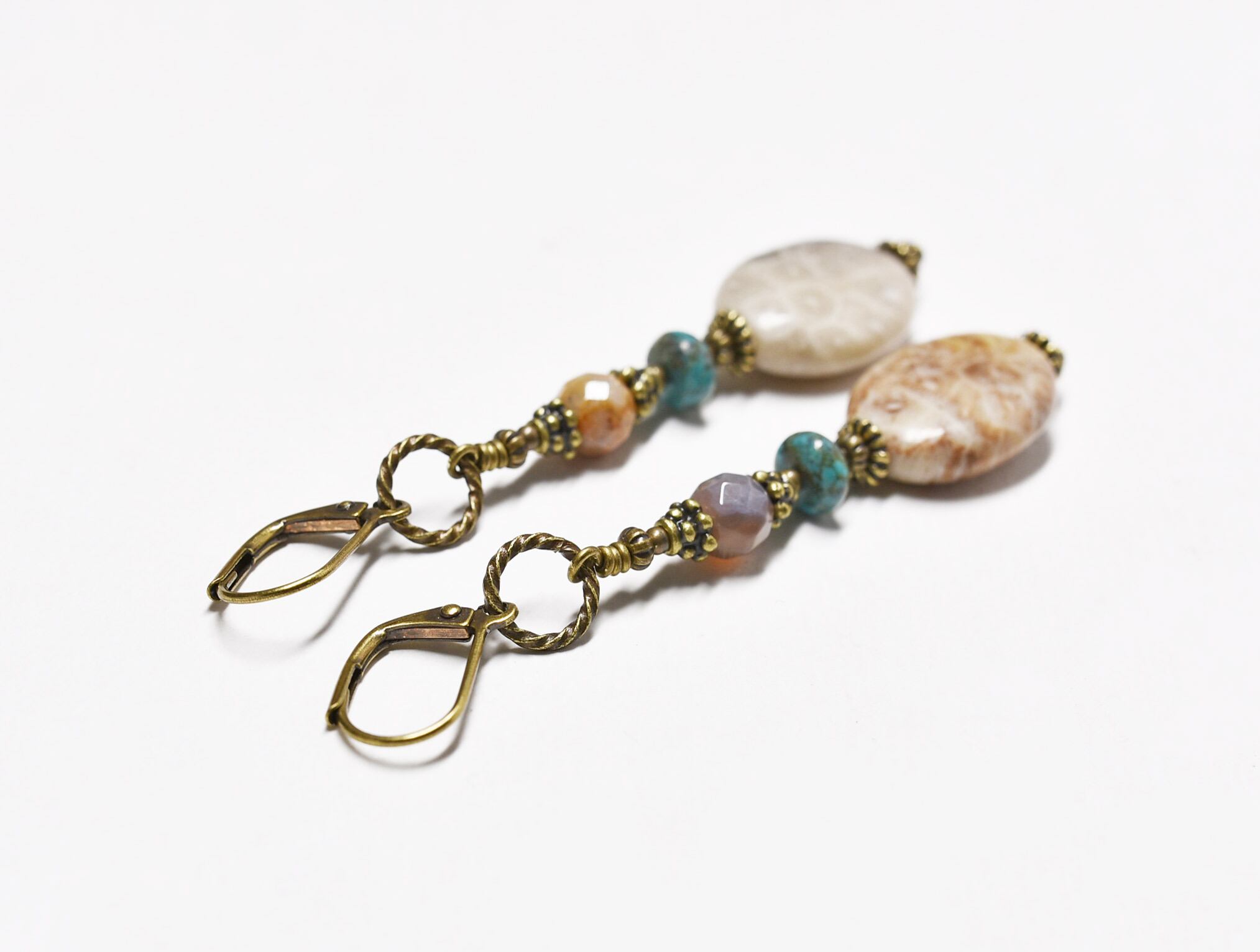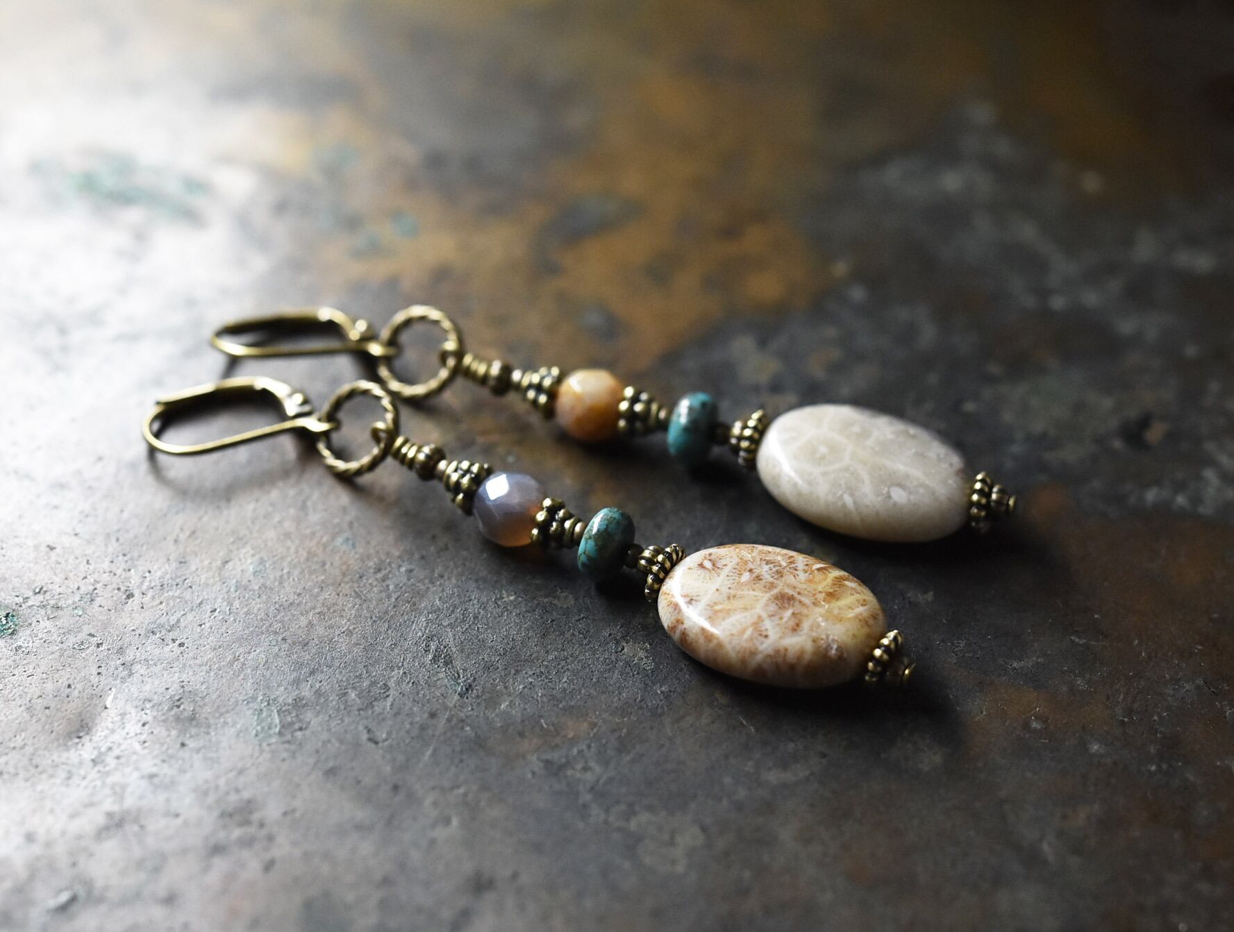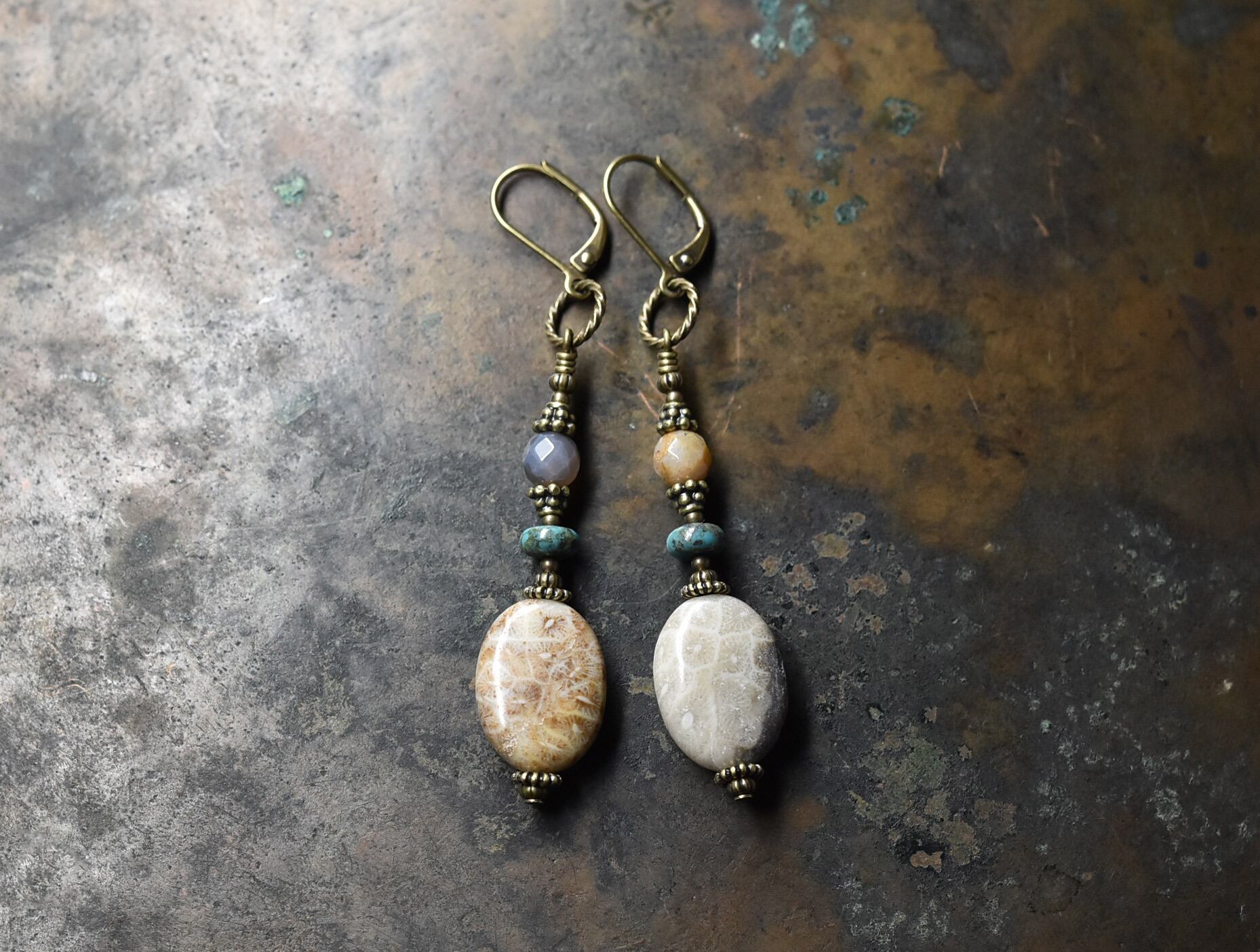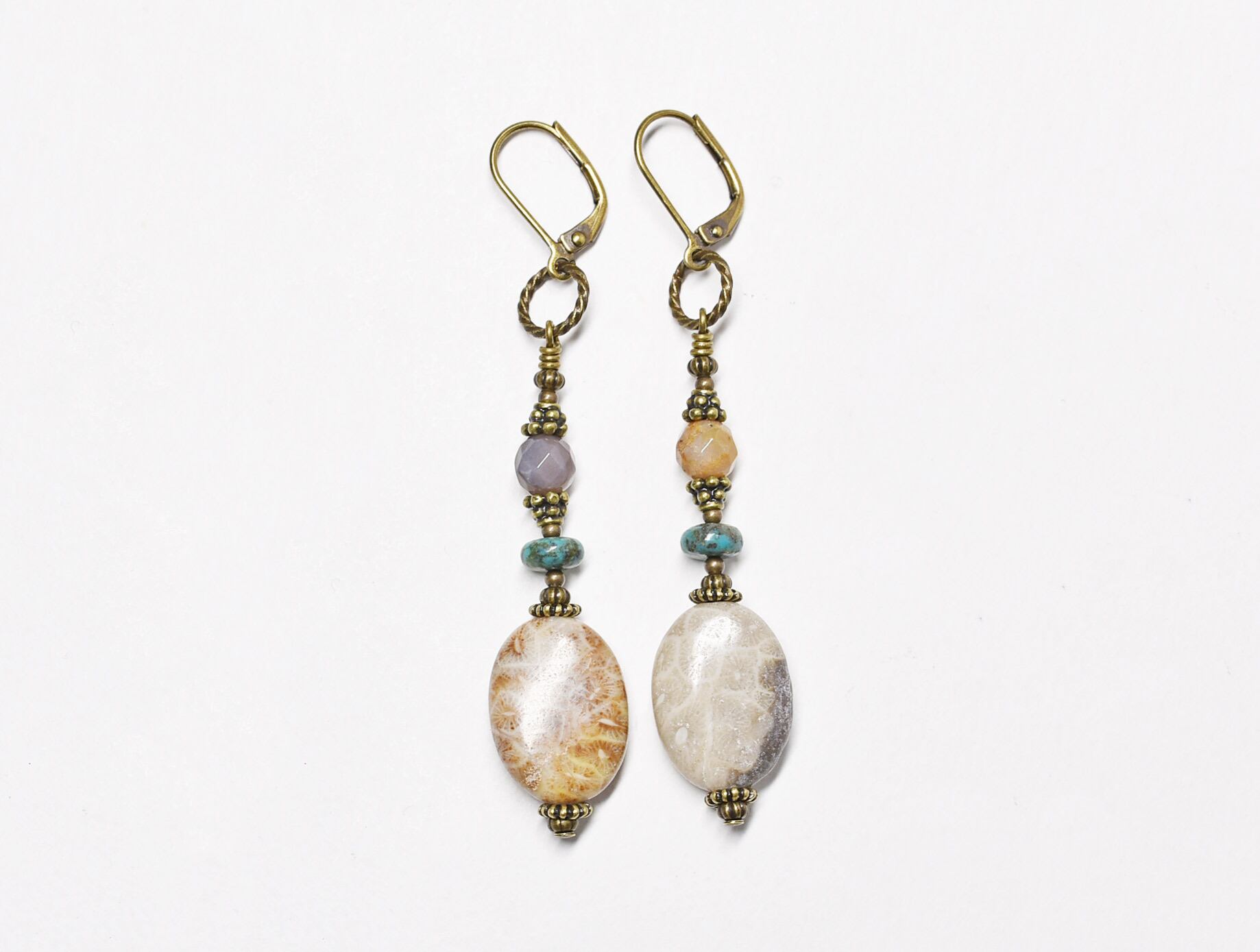 フォシルコーラルとターコイズ、インディアンアゲートを繋いだピアスです。